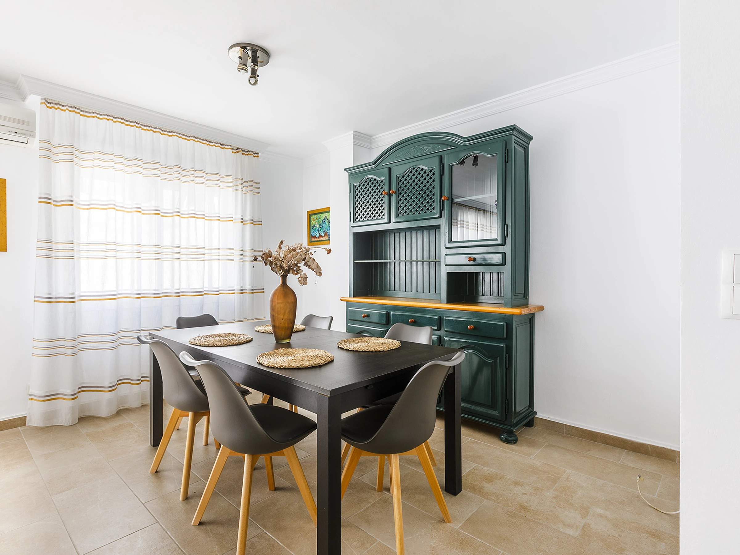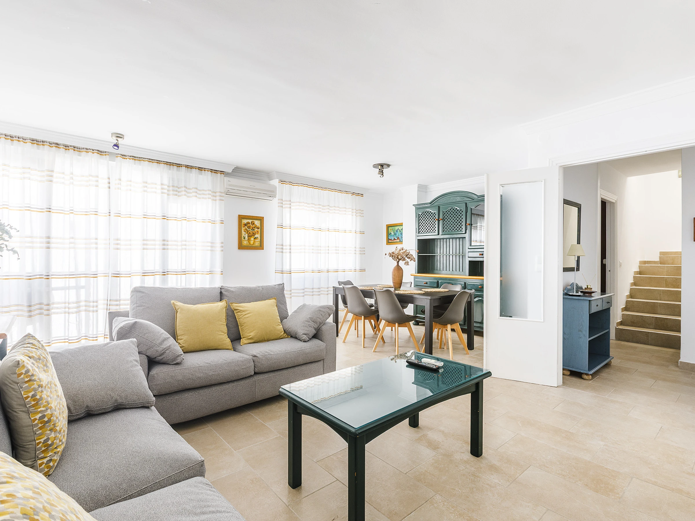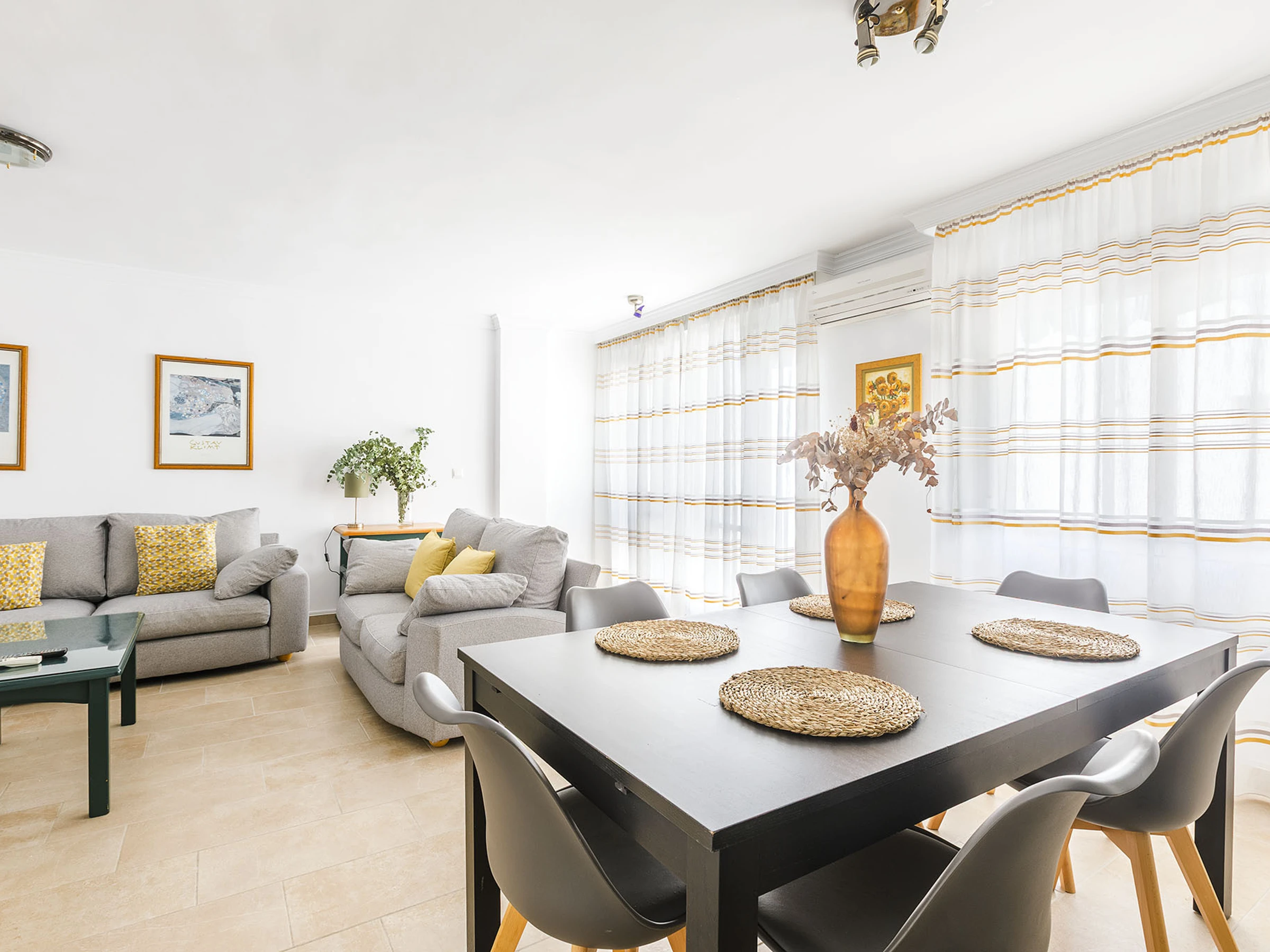 πŸ›‹ Spacious living-dining room with air conditioning, perfect for relaxing after a day at the beach.