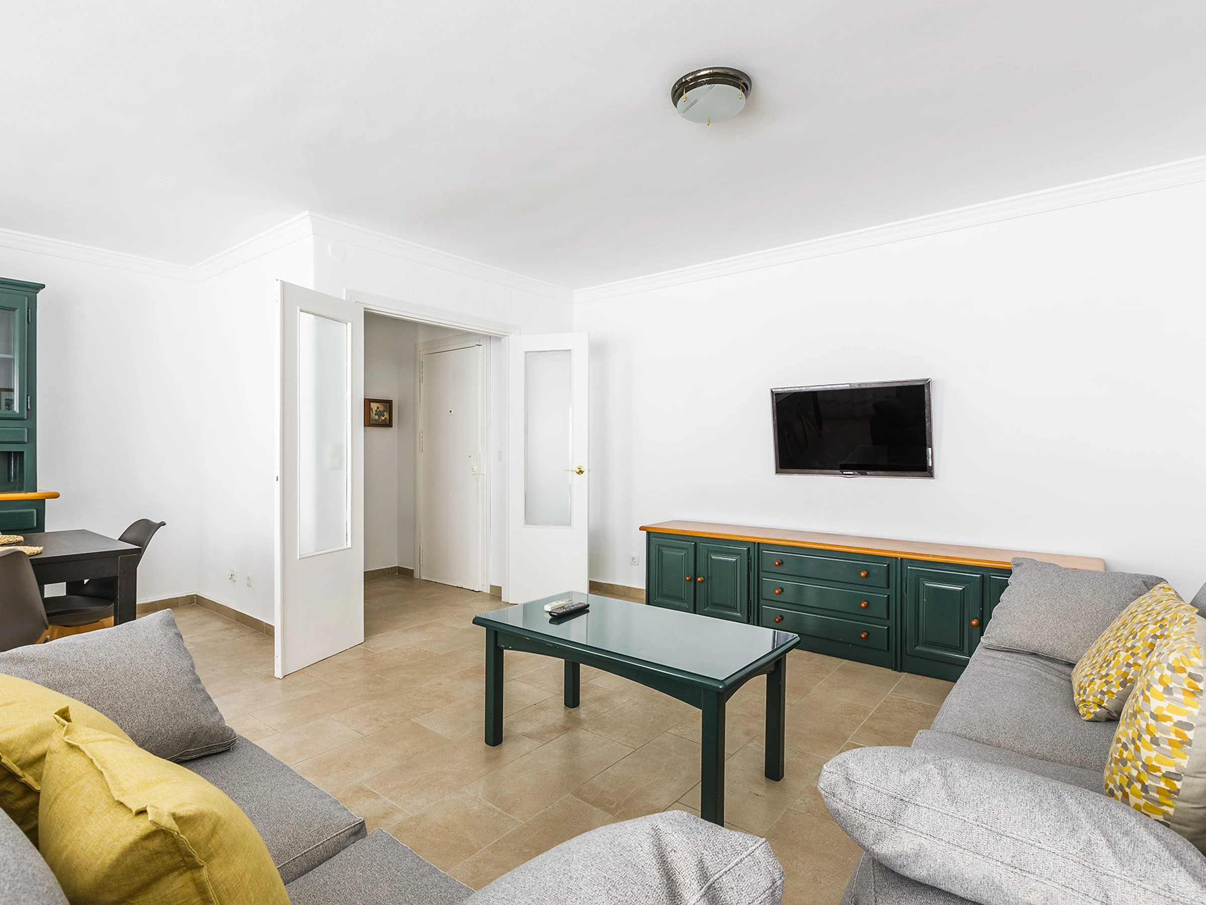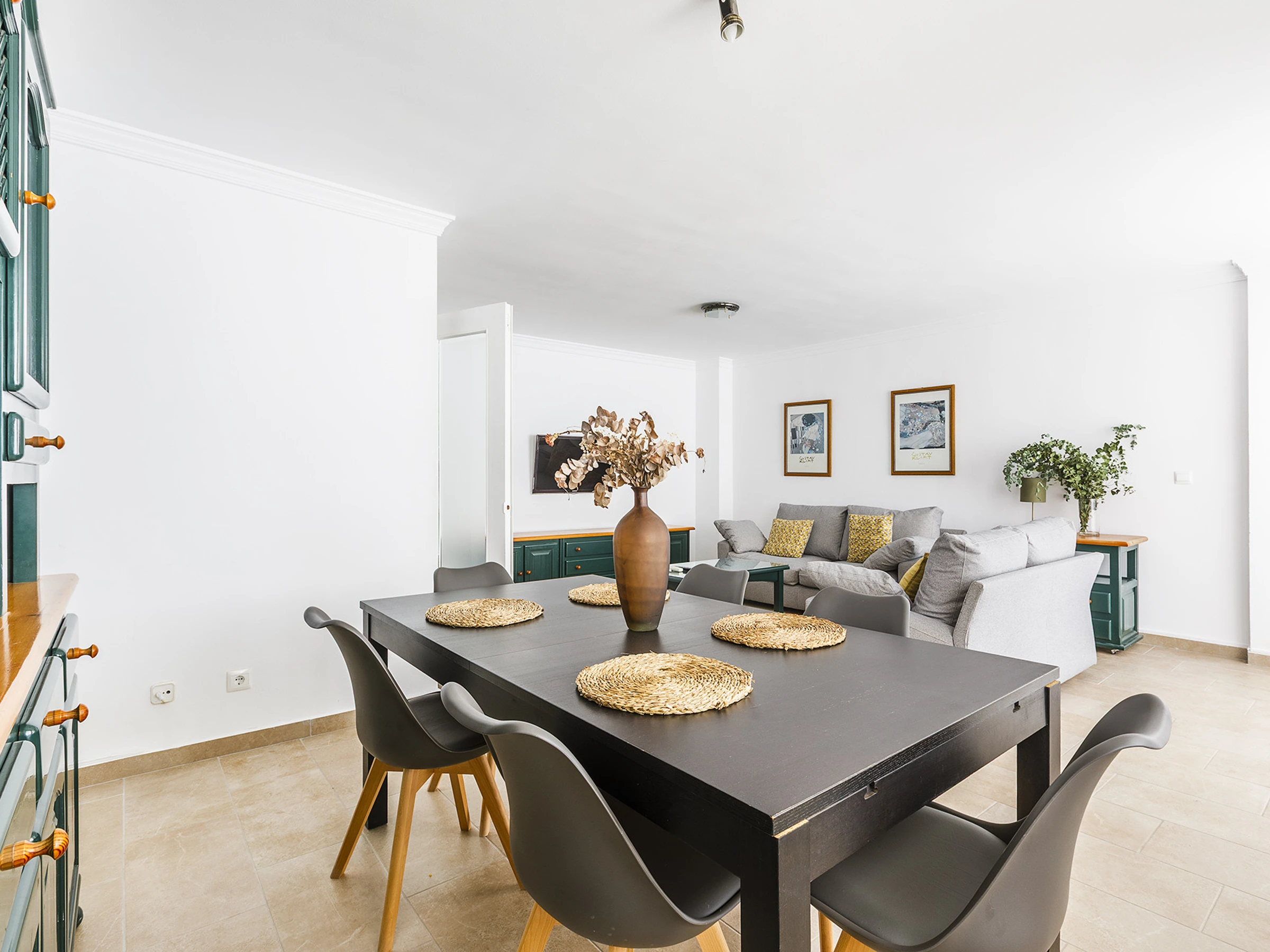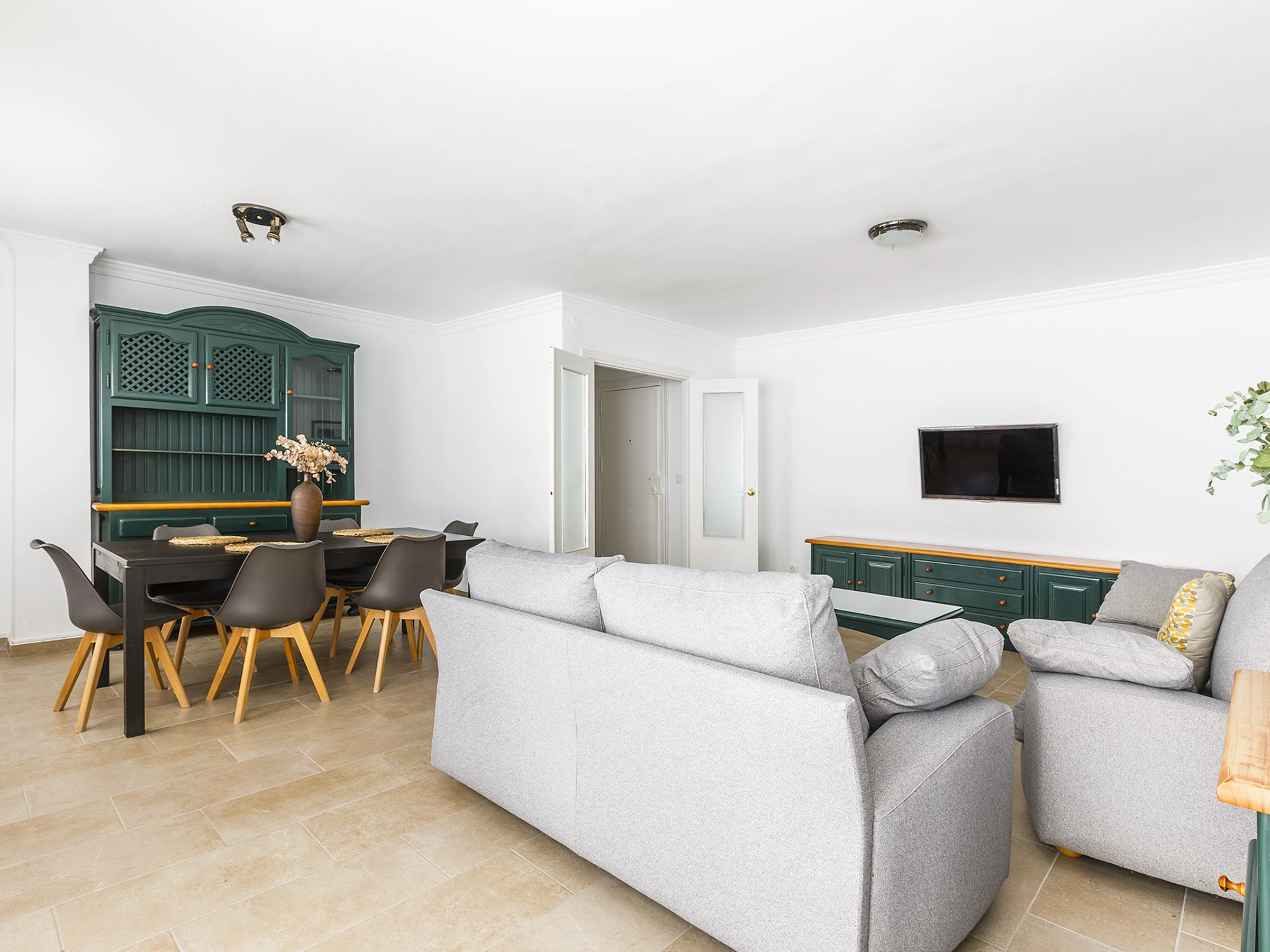 πŸ›‹ Spacious living-dining room with air conditioning, perfect for relaxing after a day at the beach.