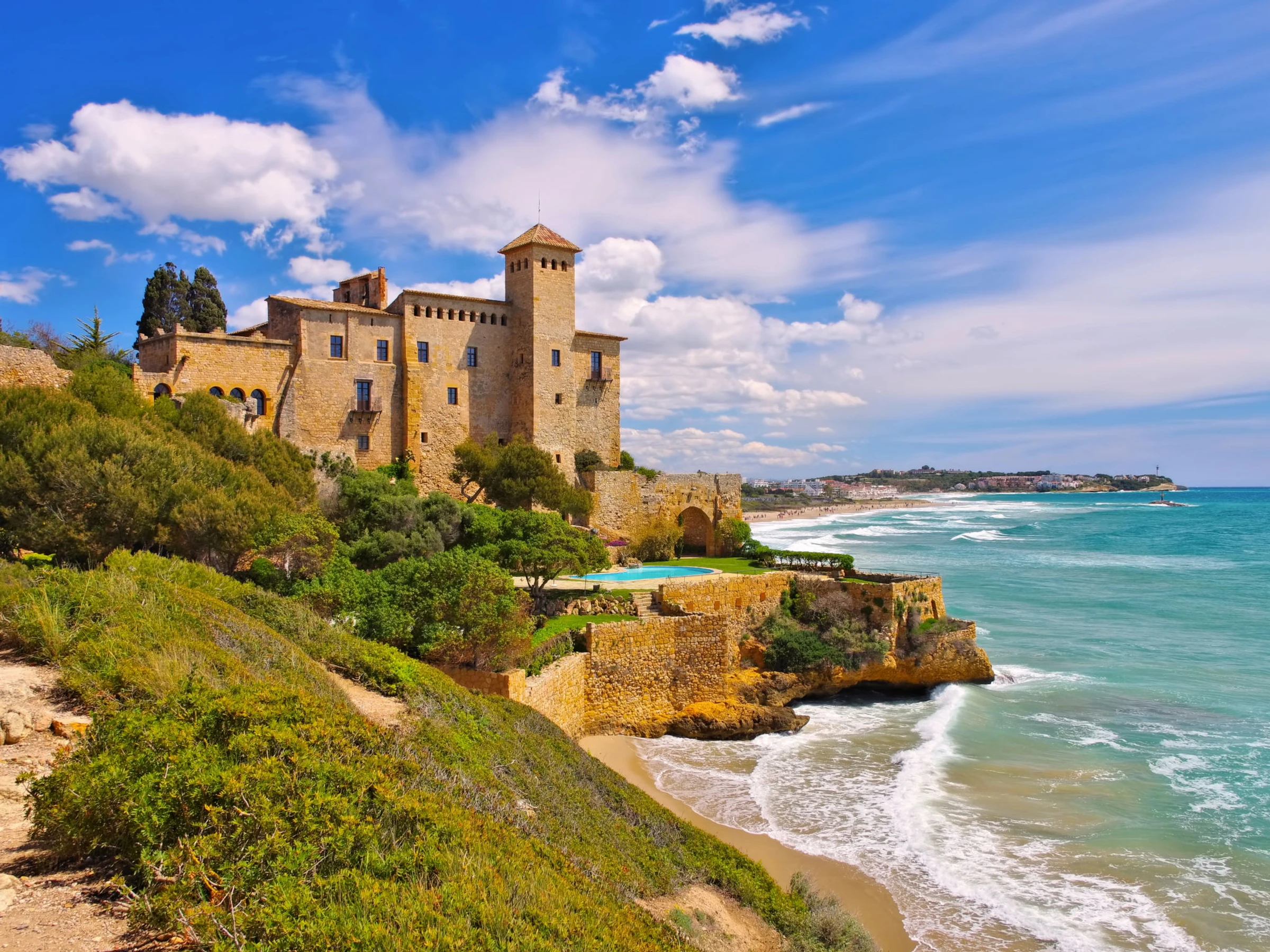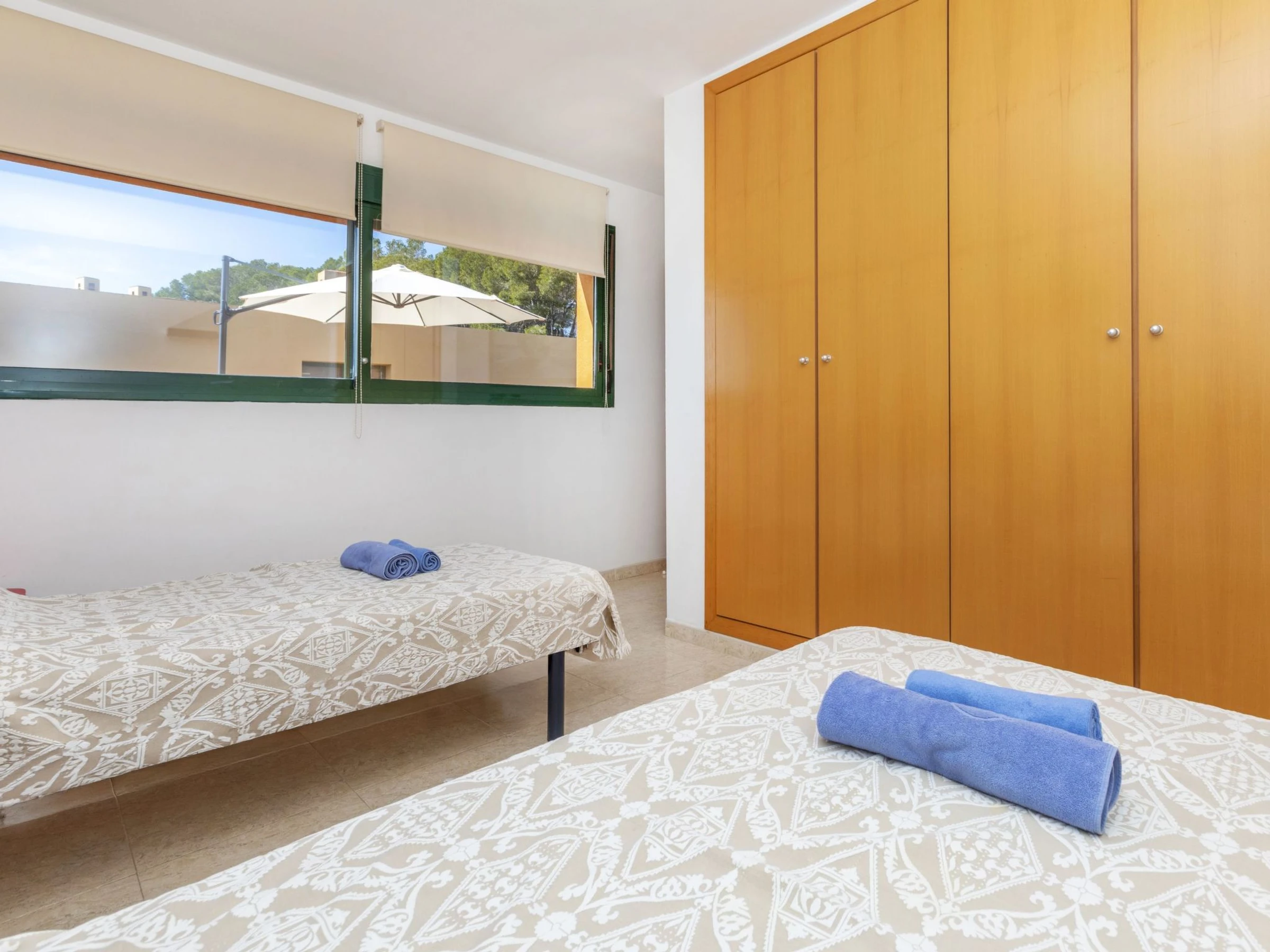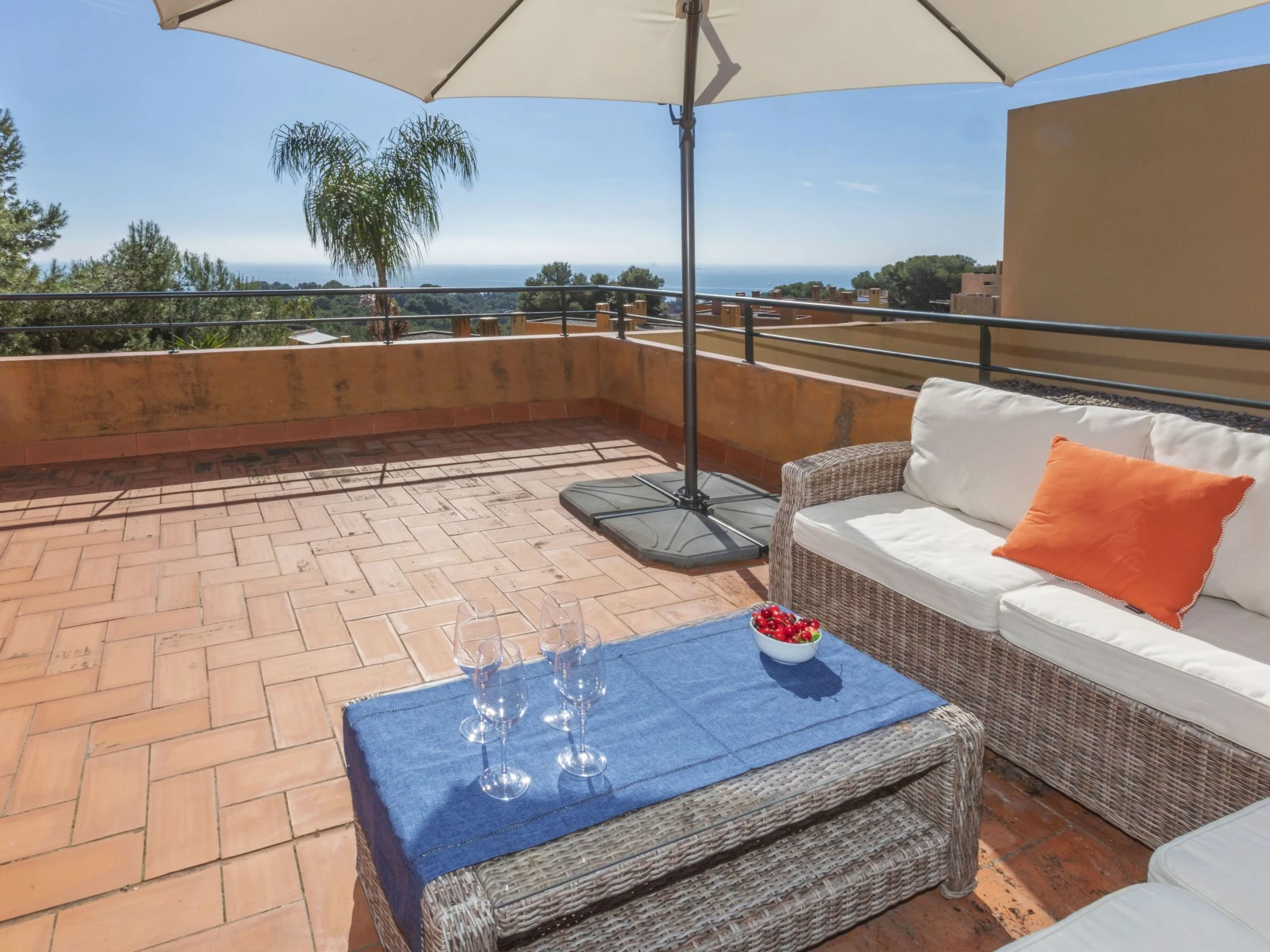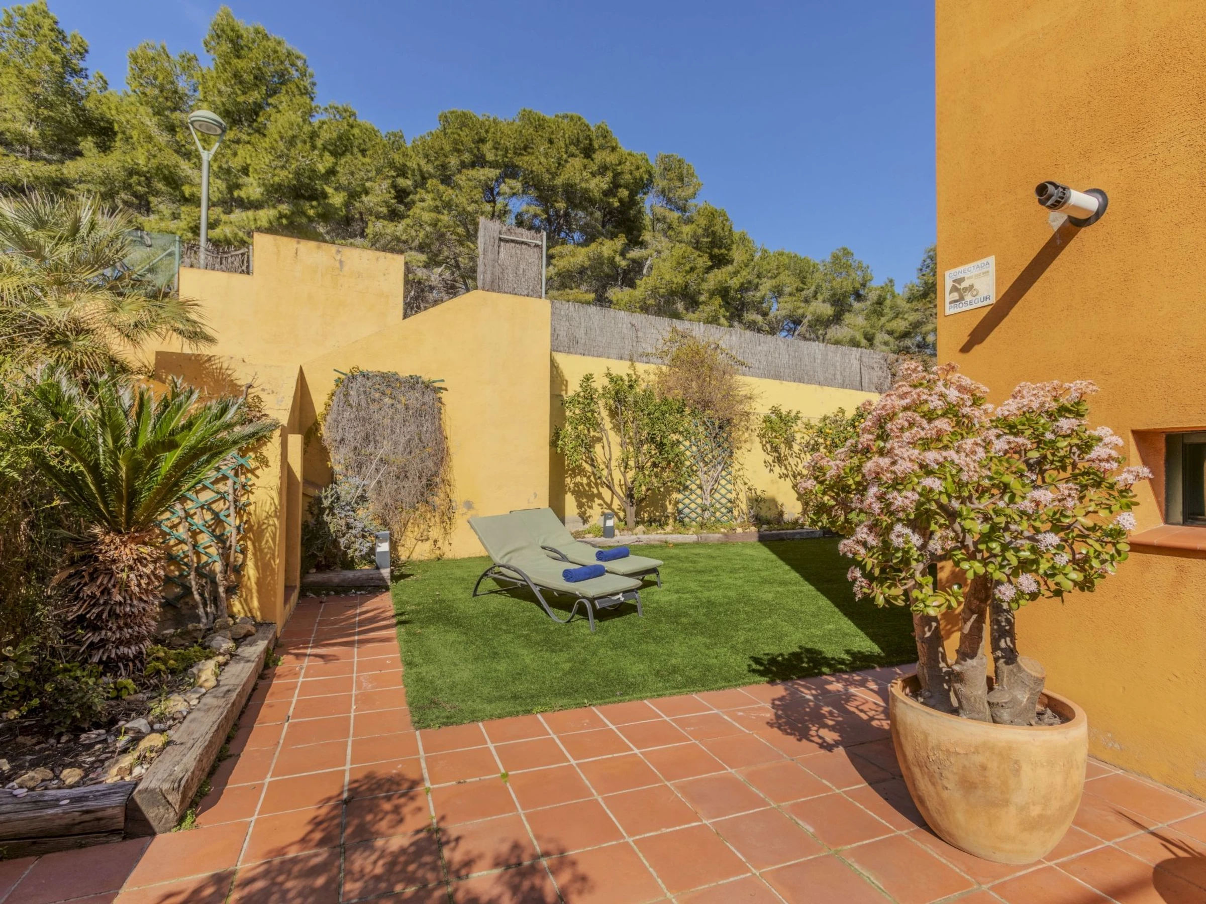 Tamarit 13 km from Tarragona: Very beautiful, comfortable terraced house "Vistamar", 2 storeys, semi-detached. 20 houses in the resort. In the district of Tamarit - La Mora, outside the resort, 13 km from the centre of Tarragona, in a quiet, sunny, elevated position residential area (villas), 10 m from the edge of the forest, 1 km from the sea, 1 km from the beach, in a cul-de-sac. For shared use: garden (fenced) with lawn, swimming pool kidney-shaped (seasonal availability: [hidden] - [hidden] pool opening hours: 10:00-22:00). Outdoor shower. Private: beautiful garden with lawn and trees. In the house: WiFi. Public parking on the road. Shop 1.4 km, grocery 1.4 km, supermarket 2.3 km, shopping centre 2.3 km, restaurant 1.4 km, bar 1.4 km, bakery 1.4 km, café 1.4 km, bus stop "Passeig de l'Esquirol" 350 m, railway station "AVE Camp de Tarragona" 25 km, sandy beach "Tamarit" 1.4 km. Sports harbour 6 km, marina 6 km, golf course (19 hole) 8 km, surf school 4 km, tennis 1 km, riding stable 11 km. Nearby attractions: Port Aventura 25 km, Aquopolis 25 km, Parque de aventura Jungle Trek 200 m, Pista de básquet y fútbol 800 m. Hiking paths: El Medol 3 km. Please note: car recommended. Suitable for families, baby equipment on request (extra). The owner does not accept any youth groups. Loading and unloading of baggage is possible at the holiday house. Neighbourhood highly sensitive to noise. Quietness and good behaviour expected.