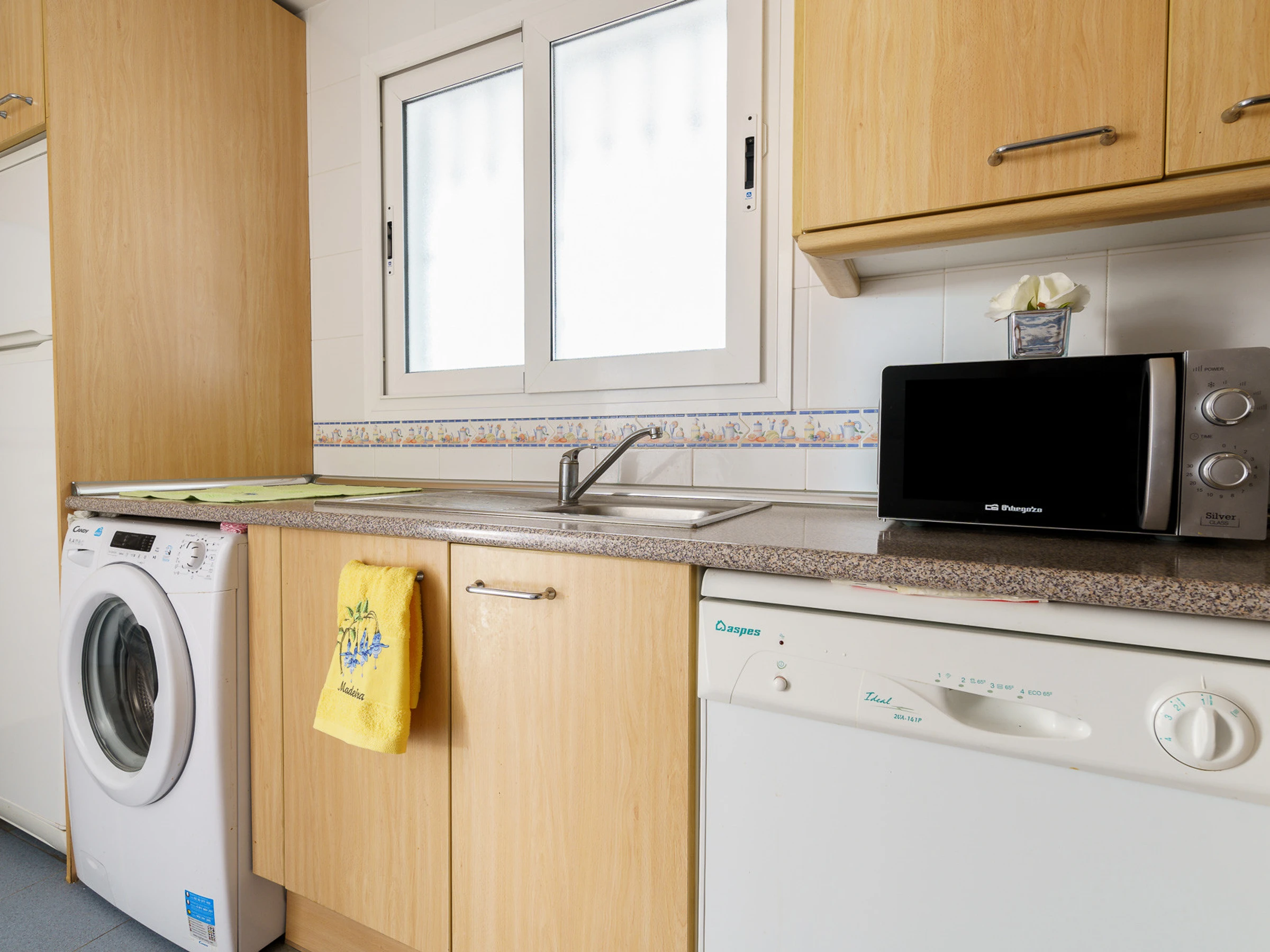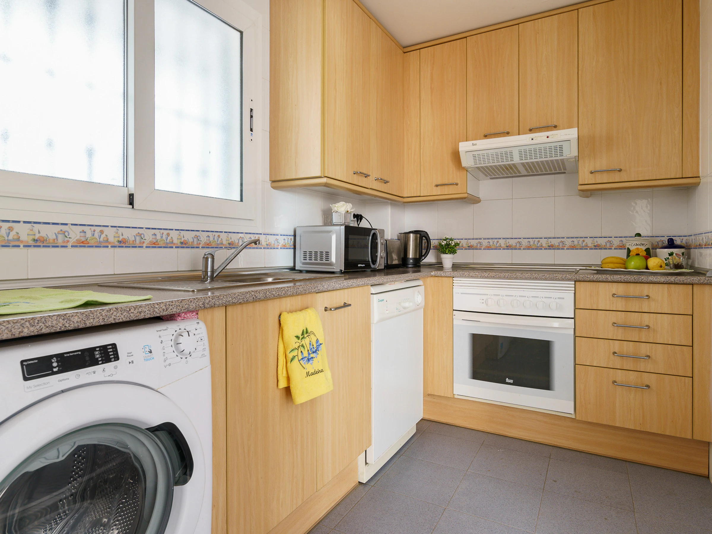 The fully equipped kitchen includes a fridge, dishwasher, oven, microwave, kettle, washing machine, coffee maker, toaster, and all necessary utensils.