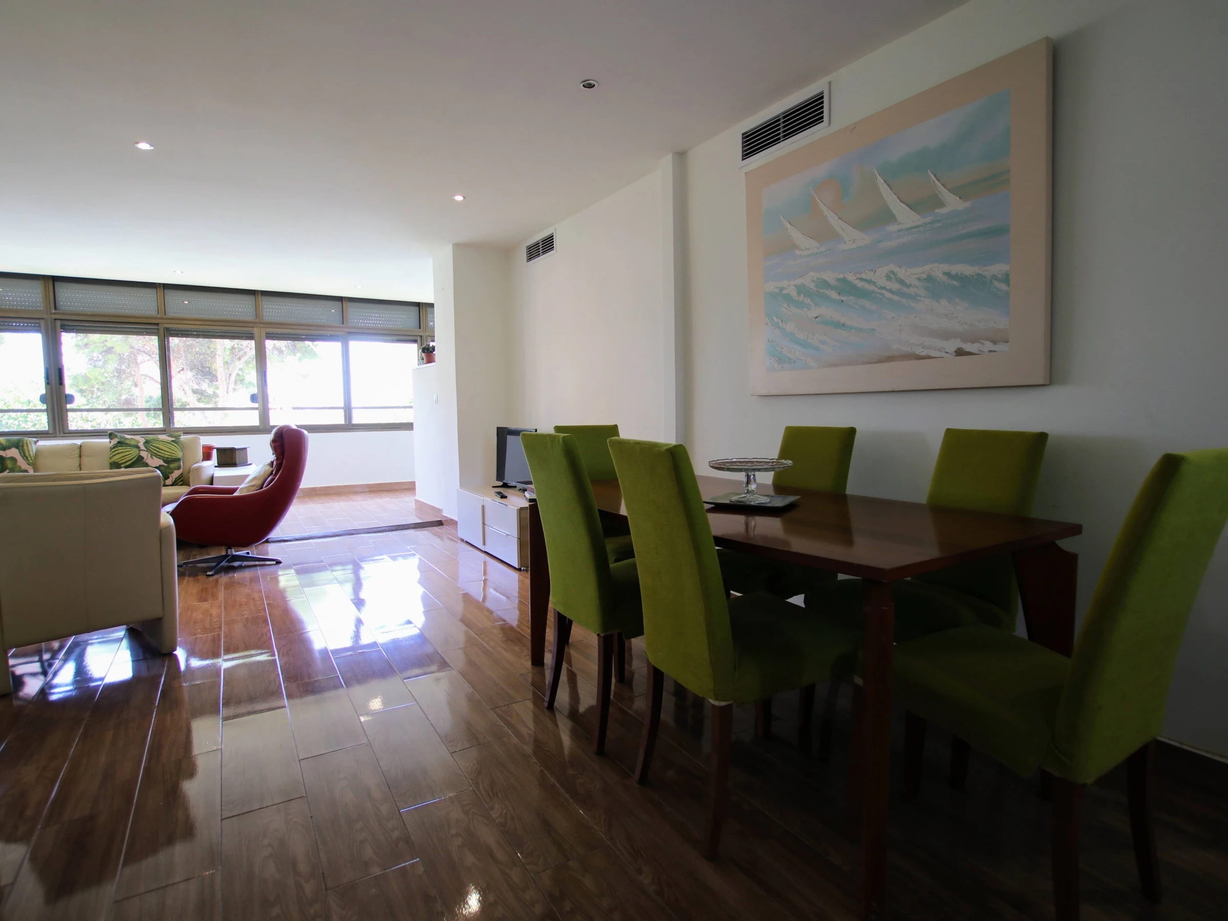 Upon entering the property, you will find a cozy and tastefully decorated living room, offering an ideal space to relax and unwind after a day of exploration. Here, you will find comfortable sofas and a flat-screen TV, perfect for enjoying a family movie night. The living room also features large windows that provide abundant natural light and a lovely view of the surroundings.