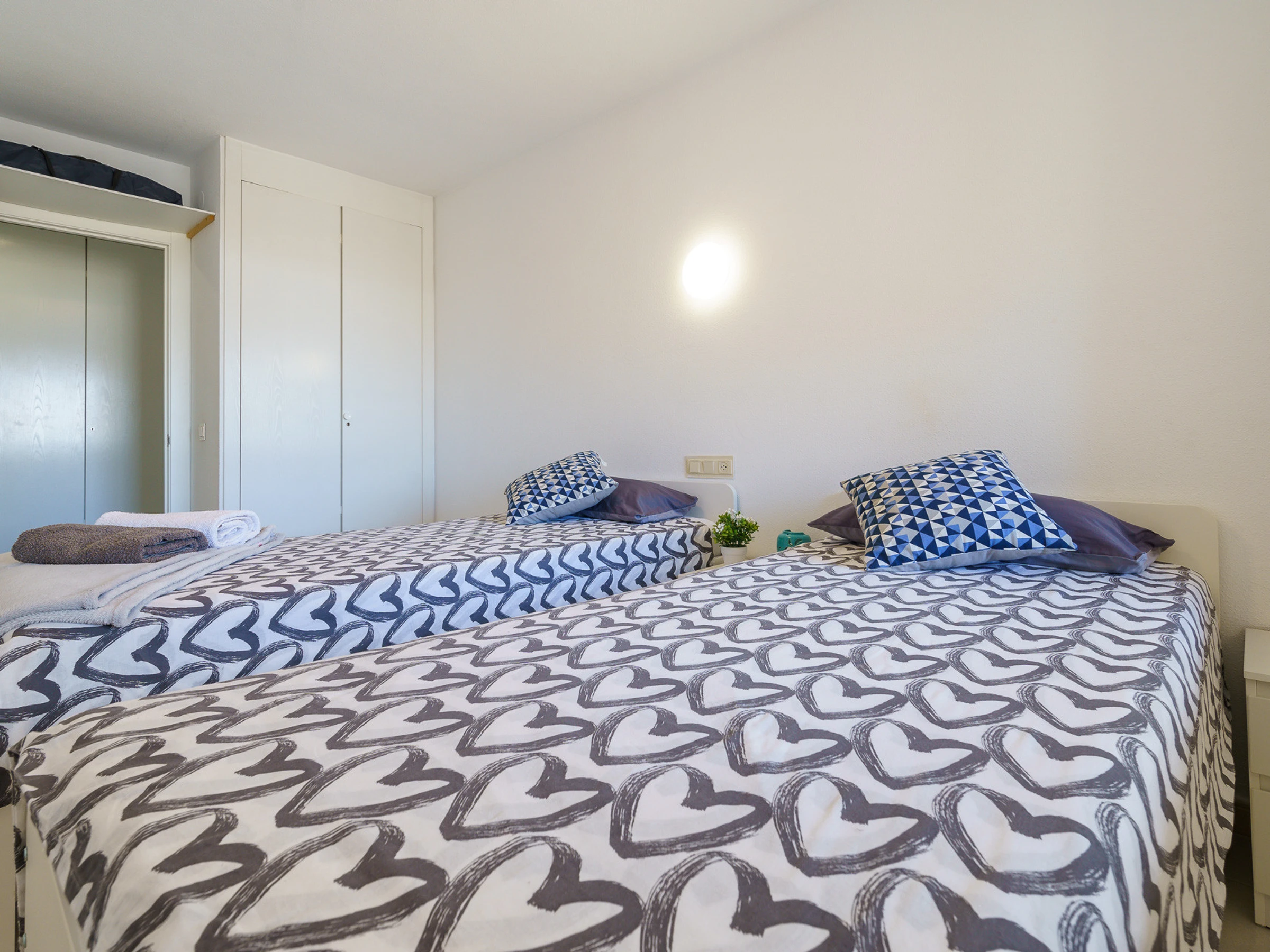 It has two bedrooms, both with two single beds. Additionally, the apartment has two full bathrooms with shower.