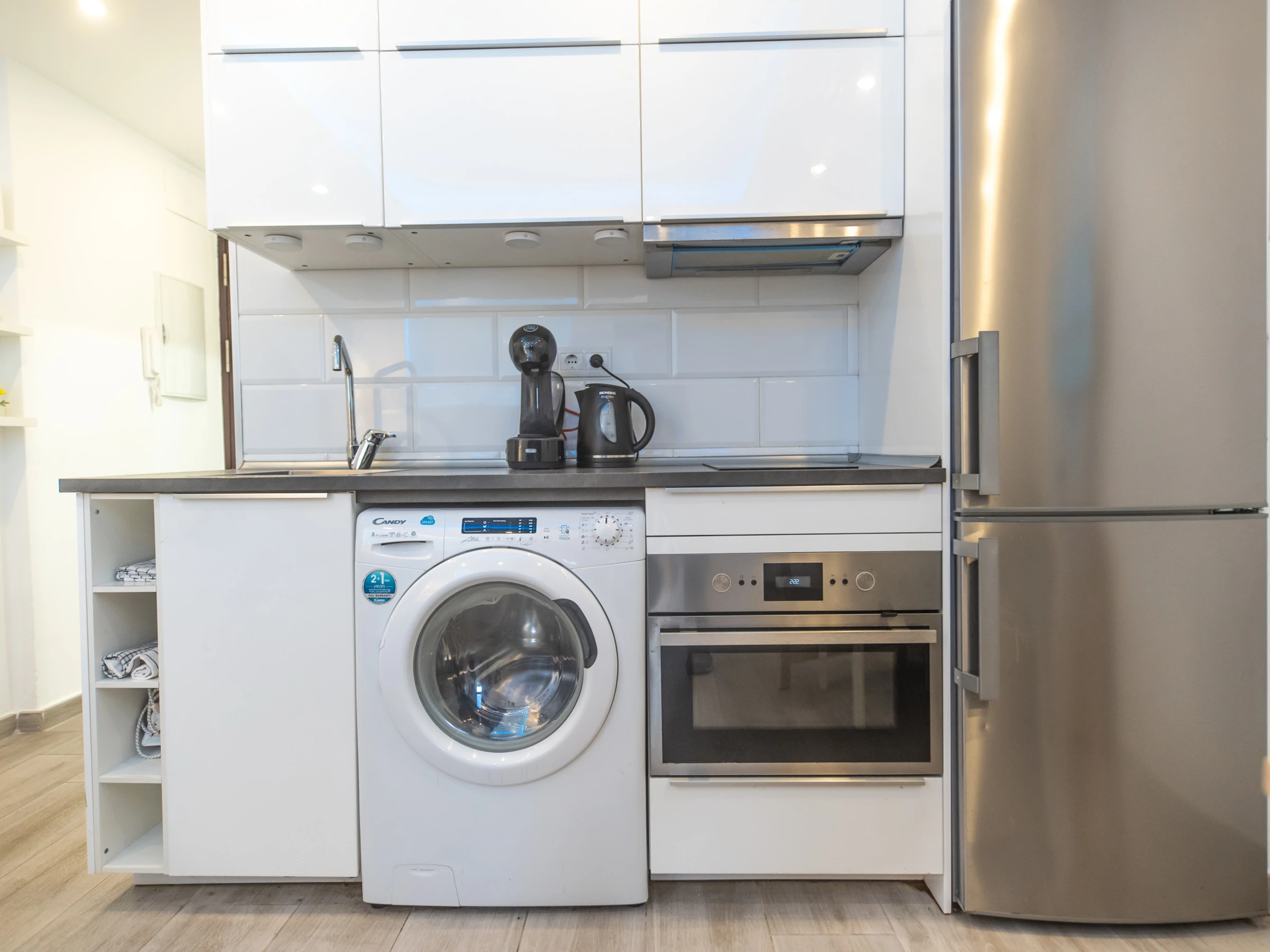 The open-plan kitchen is fully equipped with a fridge, freezer, coffee maker, oven and all the necessary utensils to prepare your own meals.