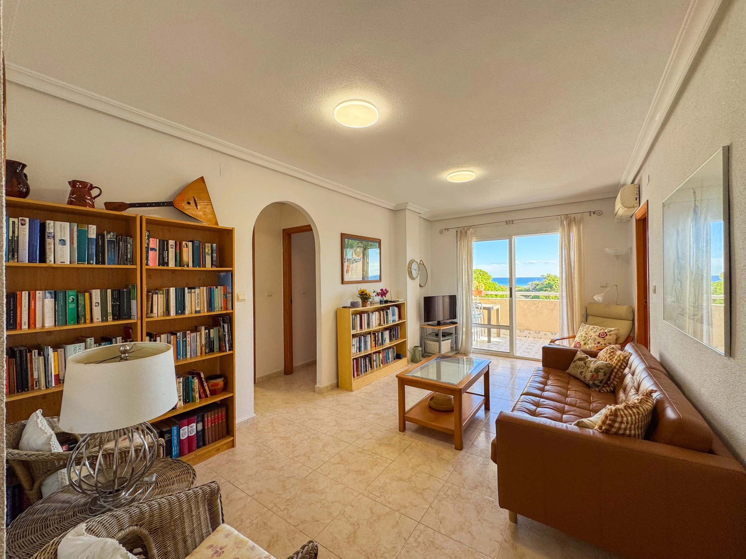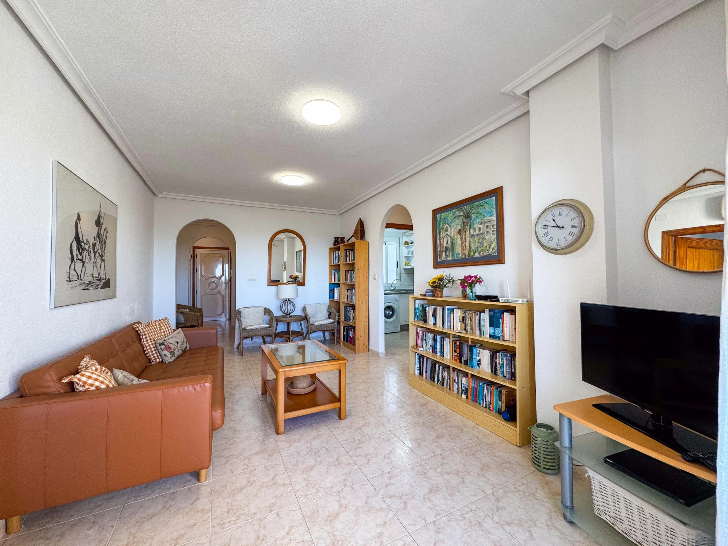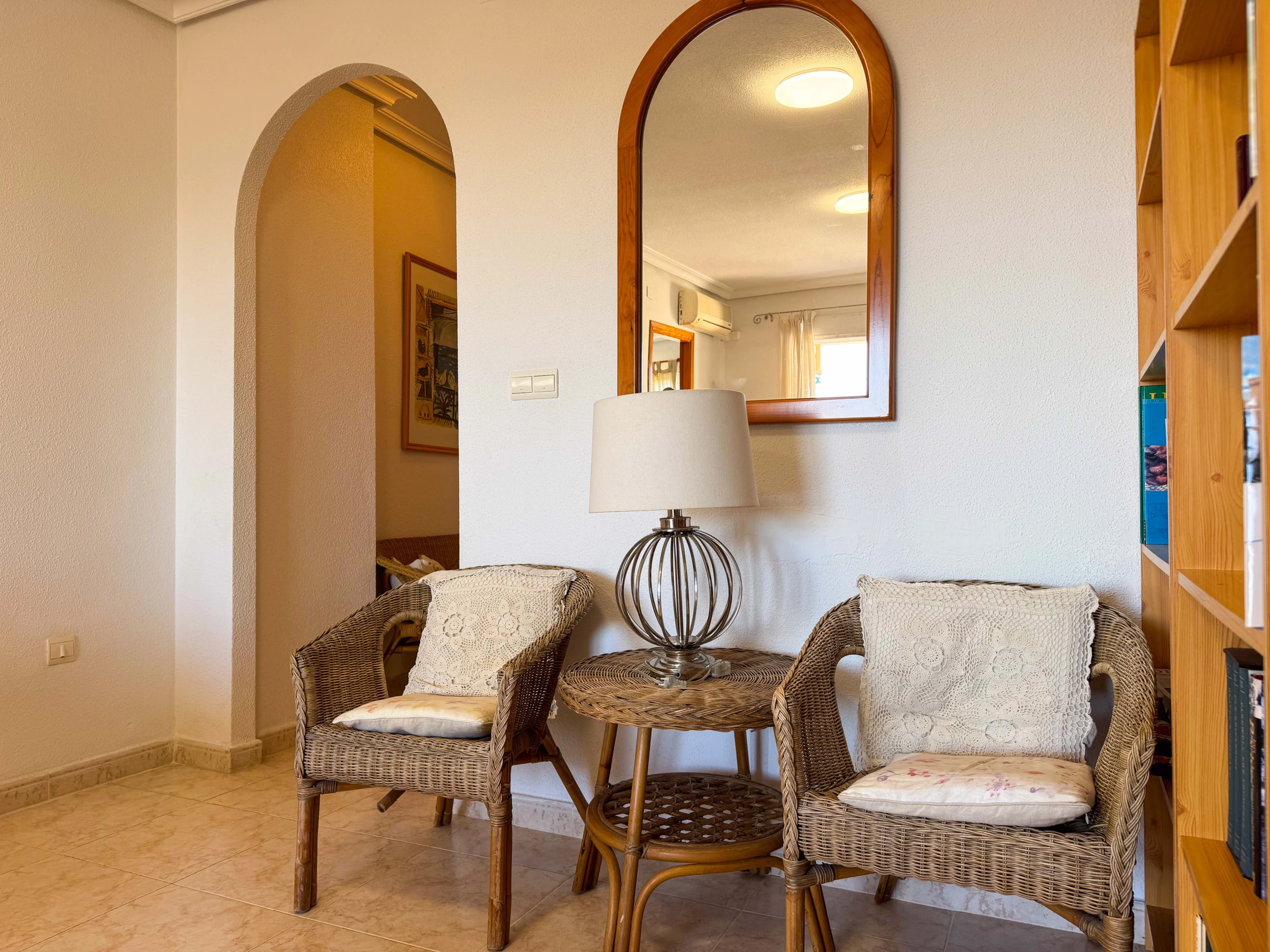 The living room is fully furnished for a comfortable stay: armchairs, sofa, tables, shelves with books.