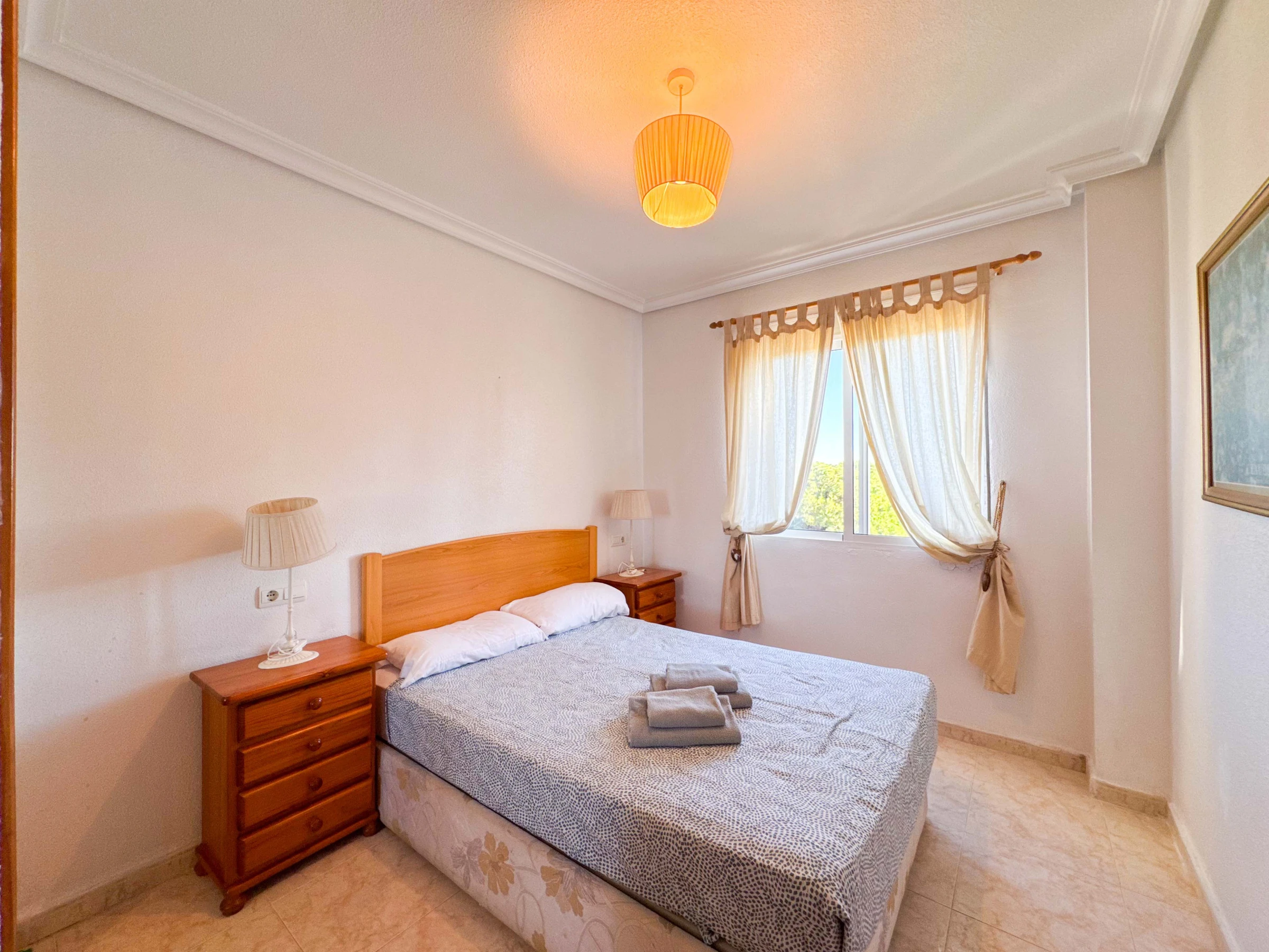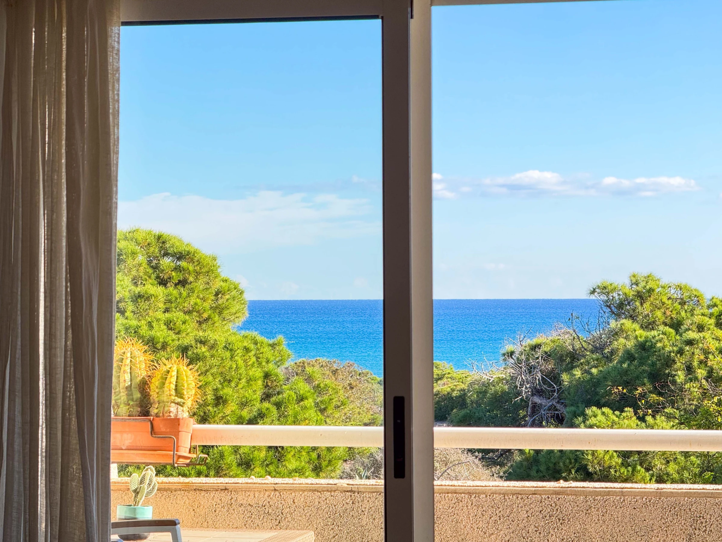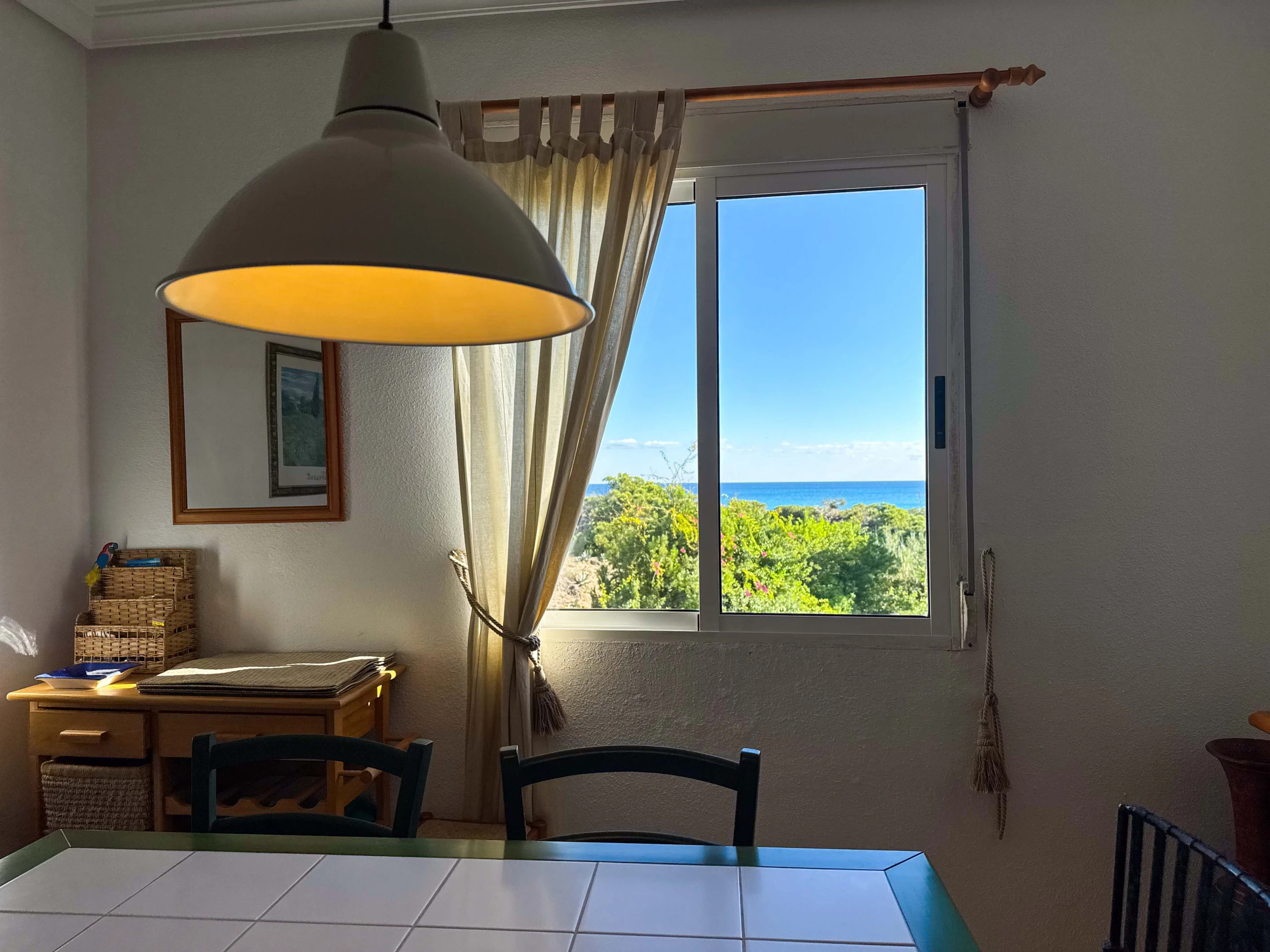 In the second bedroom there is a large bed, dresser and wardrobe; the view from this bedroom opens to the sea.