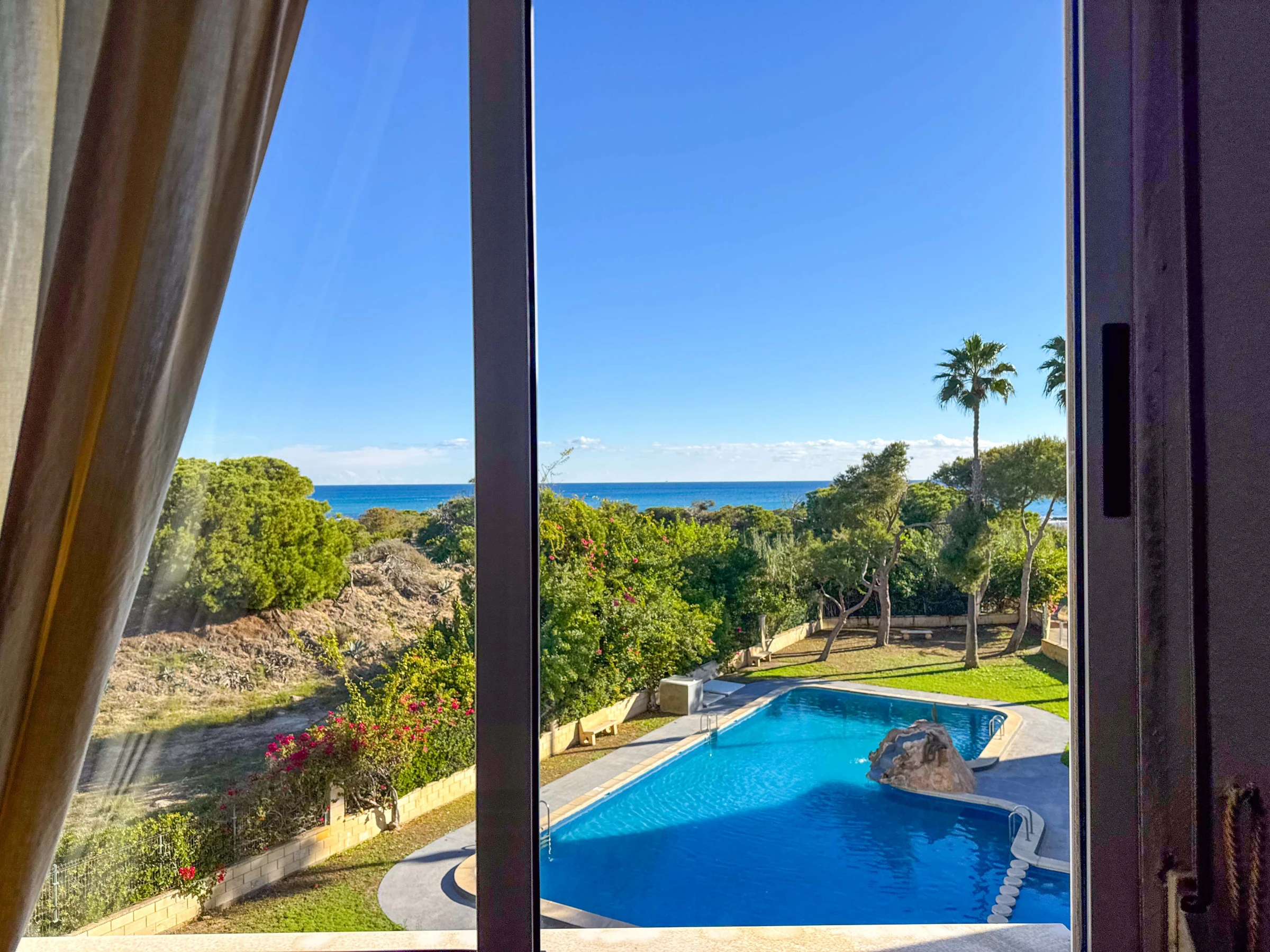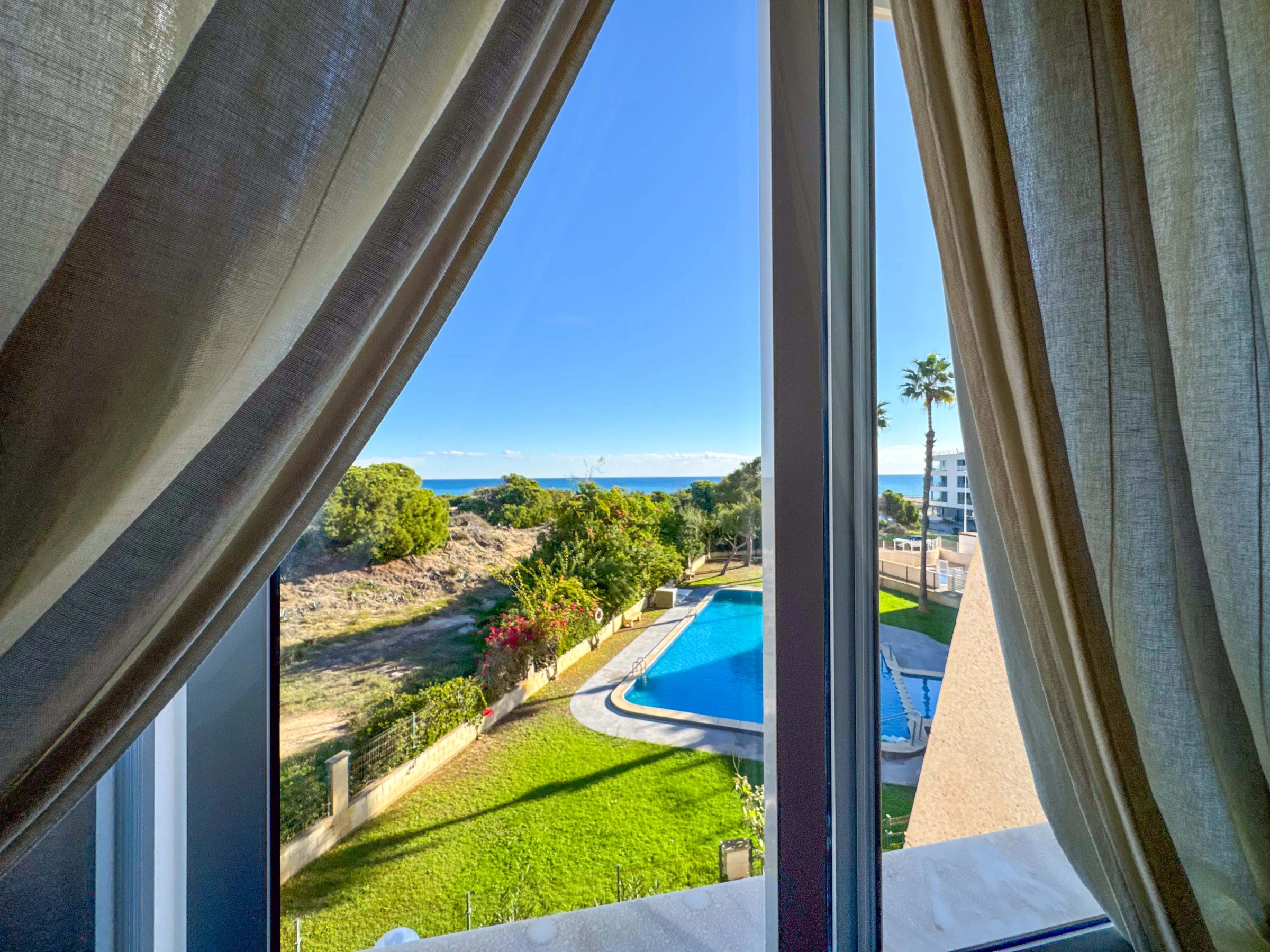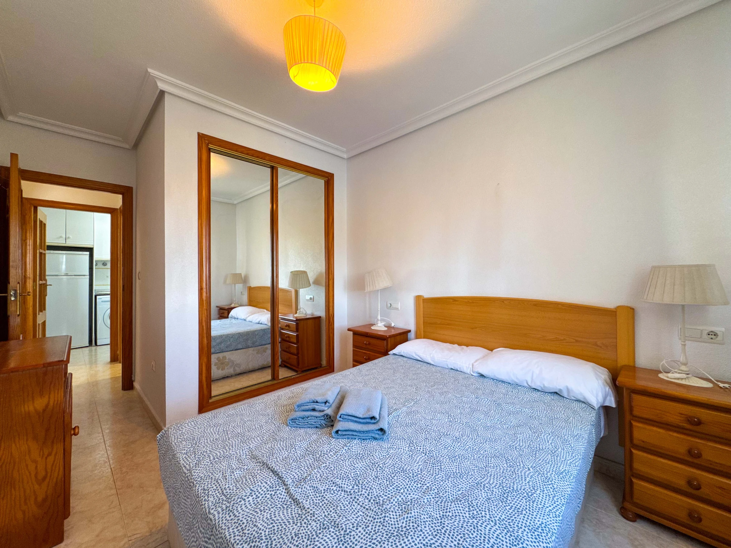 In the second bedroom there is a large bed, dresser and wardrobe; the view from this bedroom opens to the sea.