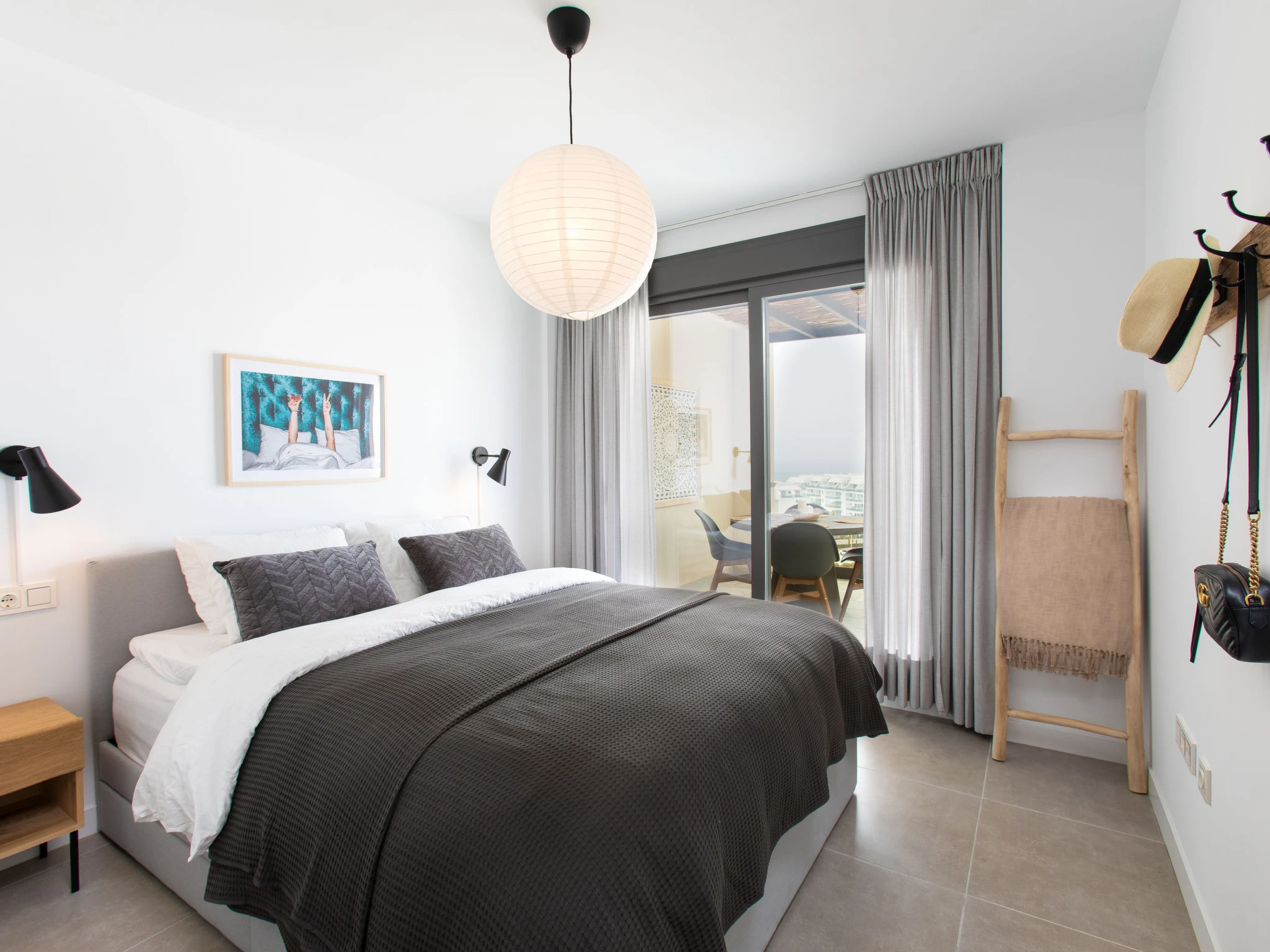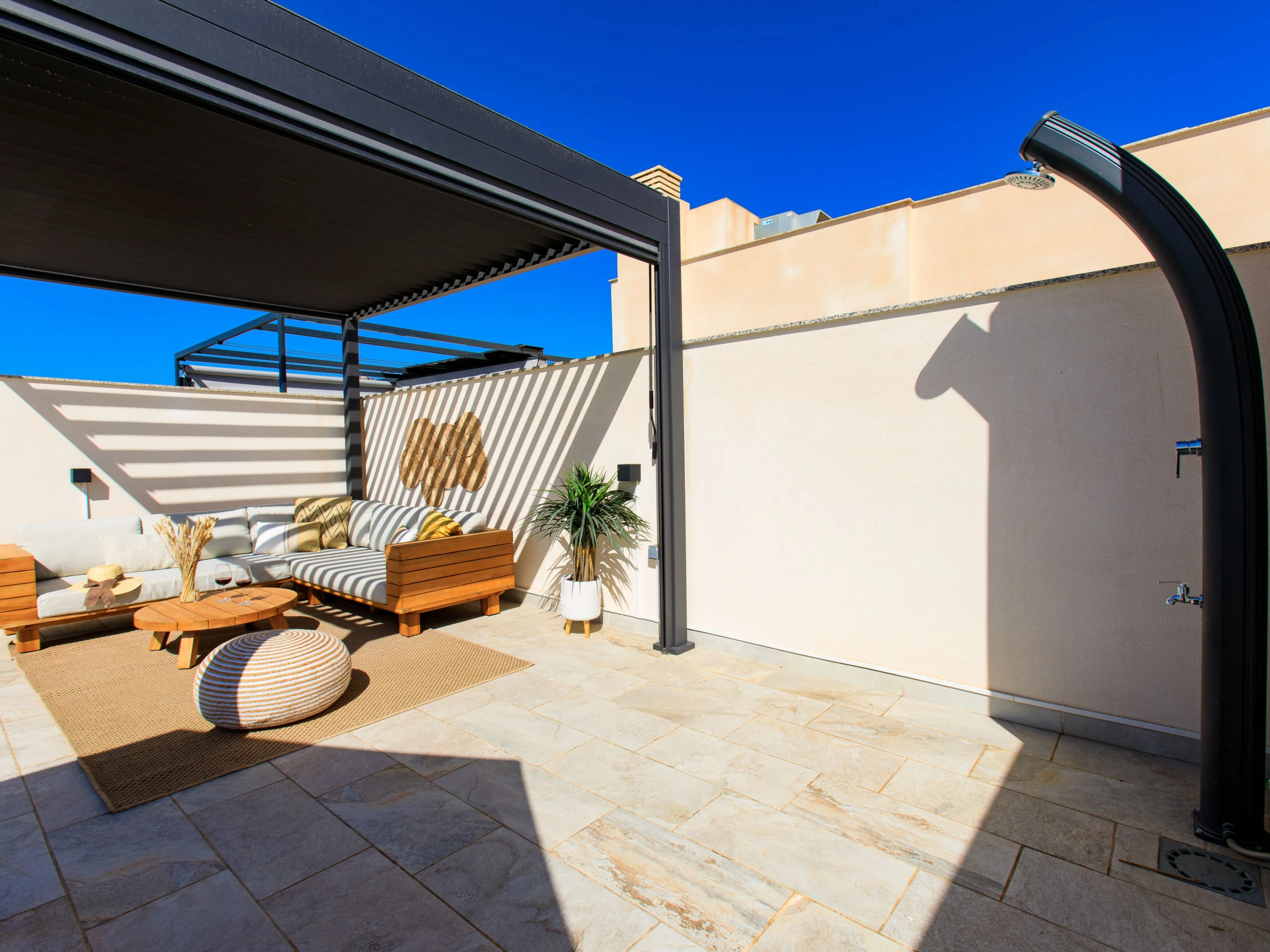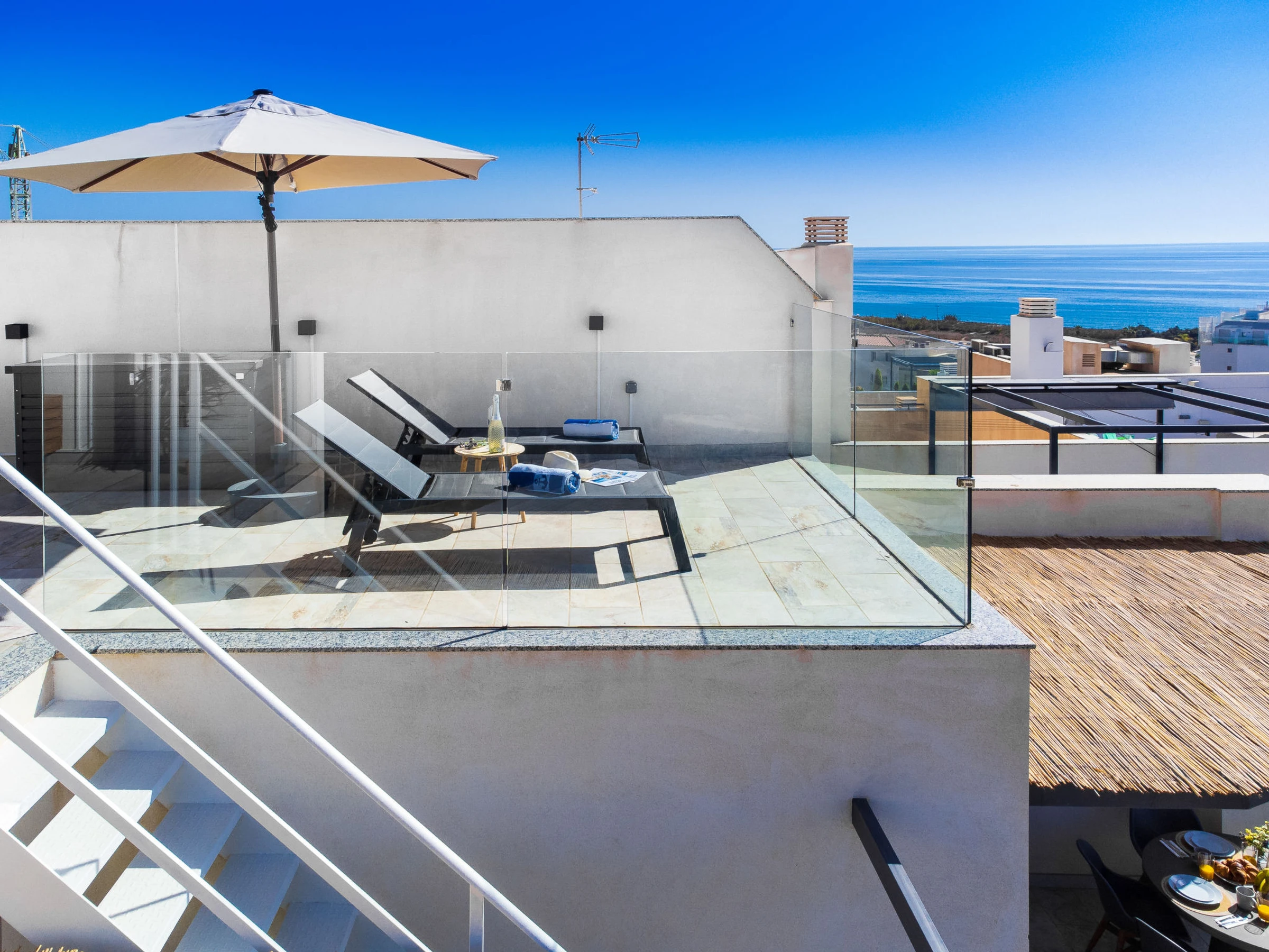 "Marinsa Beach, Sea View/Roof terrace", 3-room apartment 95 m2 on 3rd floor. Comfortable and cosy furnishings: living/dining room with digital TV, international TV channels, air conditioning, forced-air heating and electric shutters. Exit to the terrace. 1 room with 2 beds (90 cm, length [hidden] cm), air conditioning, forced-air heating and electric shutters. 1 room with 1 bed ([hidden] cm, length [hidden] cm), shower/WC (private) electric shutters. Exit to the swimming pool. Open kitchen (oven, dishwasher, 3 induction hot plates, toaster, kettle, microwave, freezer, electric coffee machine, Capsules for coffee machine (Nespresso)) with dining table. Exit to the terrace. Shower/WC. Large terrace, small terrace. Terrace furniture, barbecue, deck chairs (2), sitting area. Panoramic view of the sea. Facilities: washing machine, dryer, safe, iron, children's high chair, baby cot for up to 2 year olds, hair dryer. Internet (WiFi, free). Parking space n 12 (roofed). Please note: smoke alarm, fire extinguisher. "Marinsa Beach", rooftop apartment 70 m2 on 3th floor. South facing position with a fantastic sea view and sunset view. Spacious, comfortable and modern furnishings: Living/dining room with air conditioning, smart-TV and bluetooth speaker. Exit to the terrace. 1 room with 2 beds (90 cm, length [hidden] cm), built-in wardrobe and air conditioning. 1 room with 1 french bed ([hidden] cm, length [hidden] cm), built-in wardrobe and air conditioning. Exit to the terrace. 2 showers/WC. Open kitchen (oven, microwave, wine cooler, dishwasher, induction hob, fridge/freezer, toaster, Nespresso coffee machine). 2 terraces (1 big terrace and 1 stunning roof terrace of 40 m2. Panoramic view of the sea. A perfect place to watch beautiful sunsets. Terrace furniture, including a big lounge sofa, sunbeds, a large pergola and an outdoor shower. Facilities: washing machine, dryer, iron, children's high chair, baby cot for up to 3 year olds, hair dryer. [hidden]