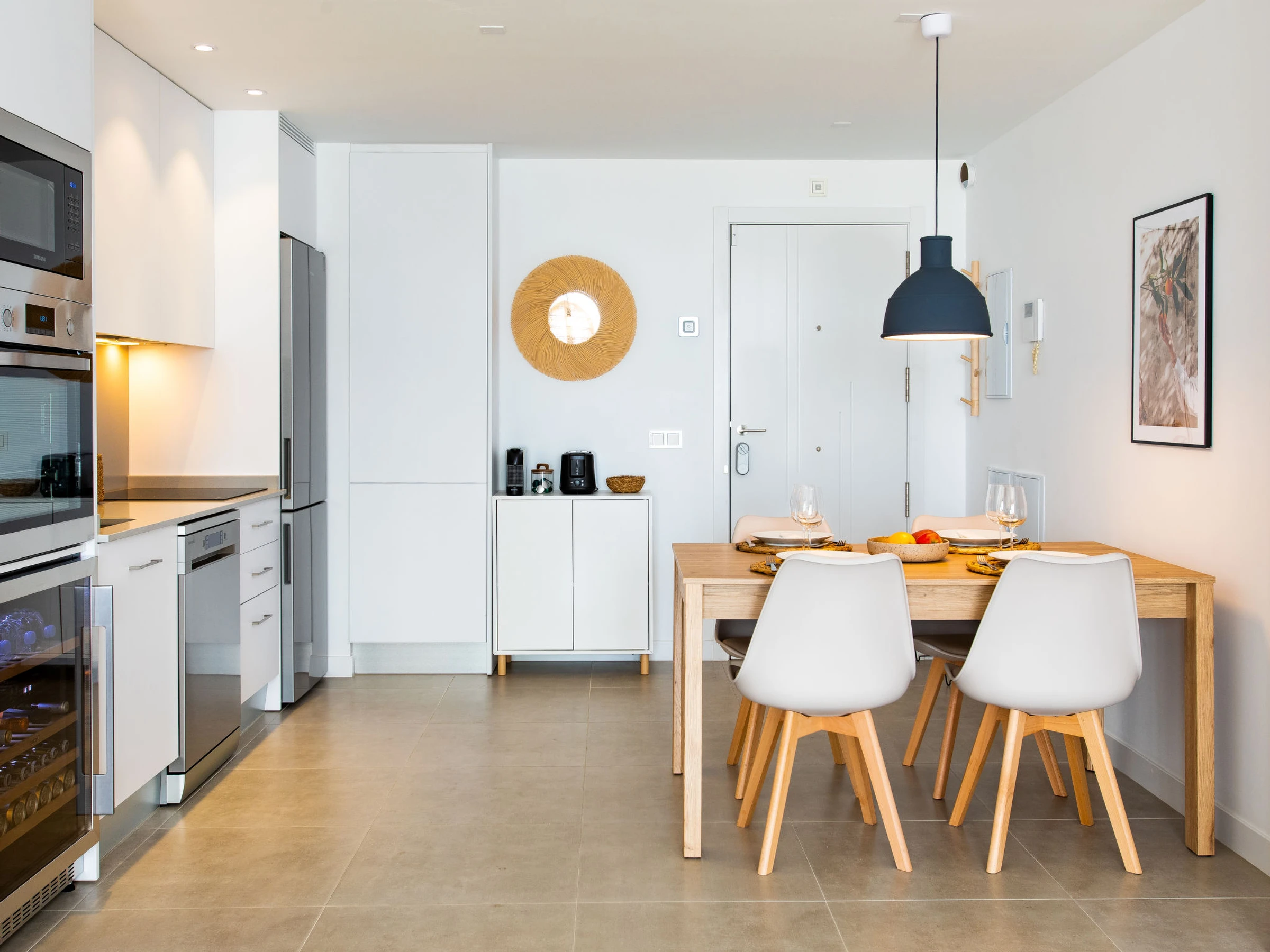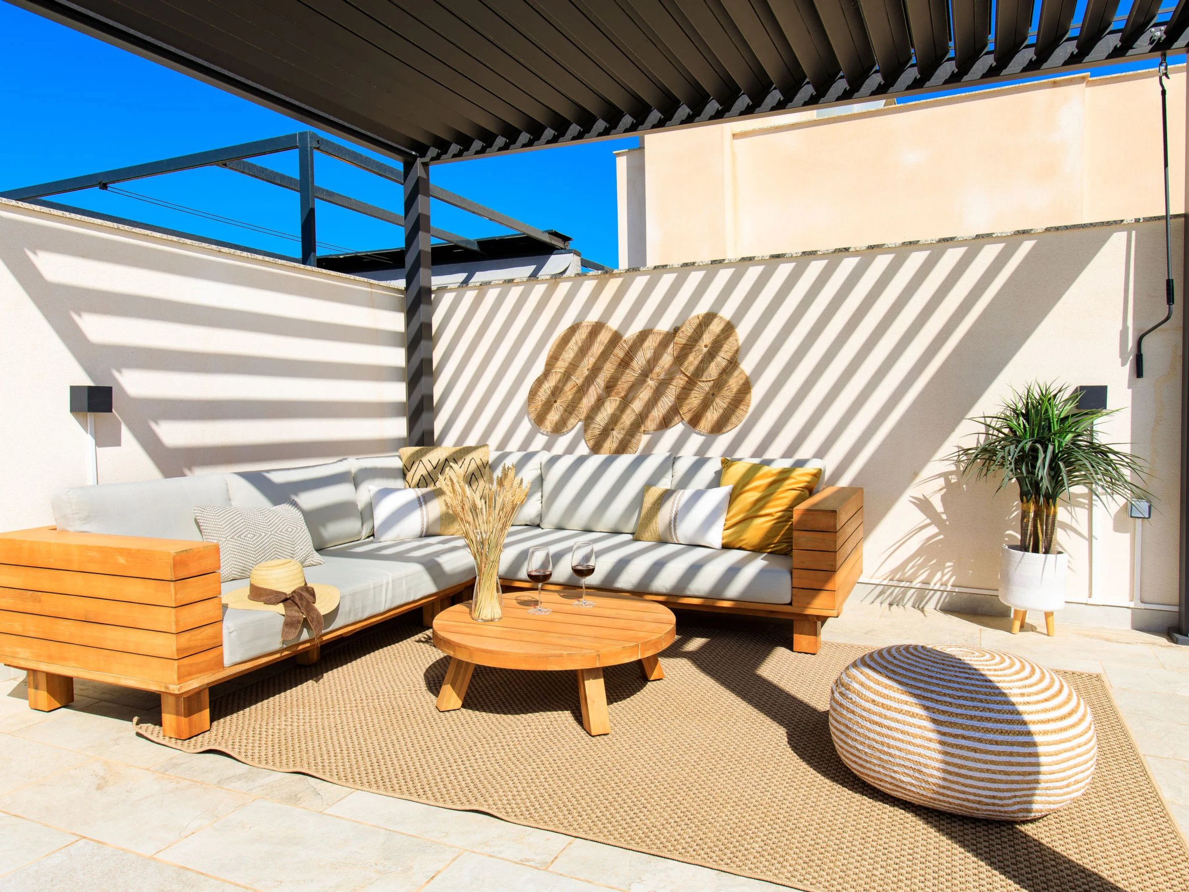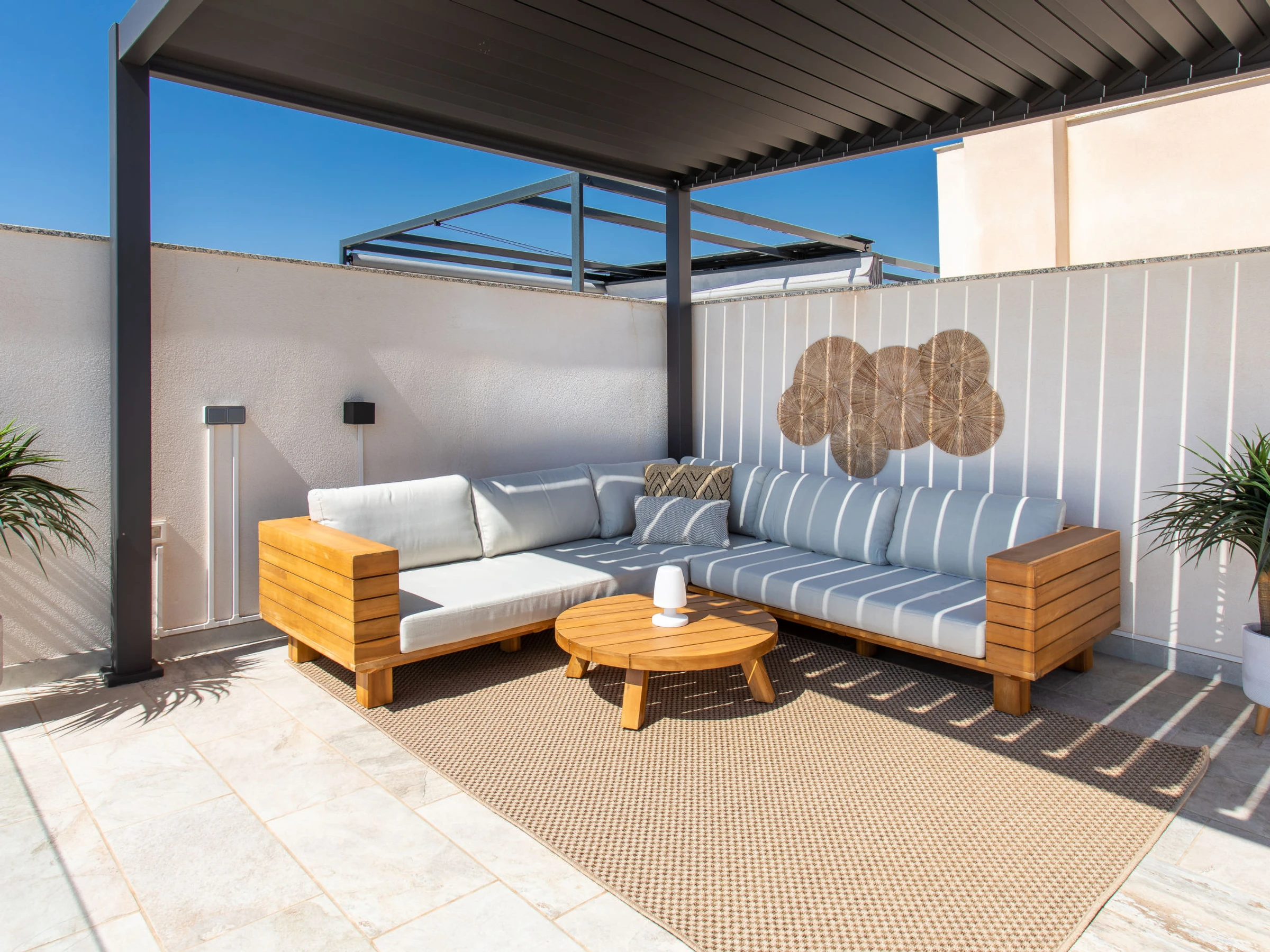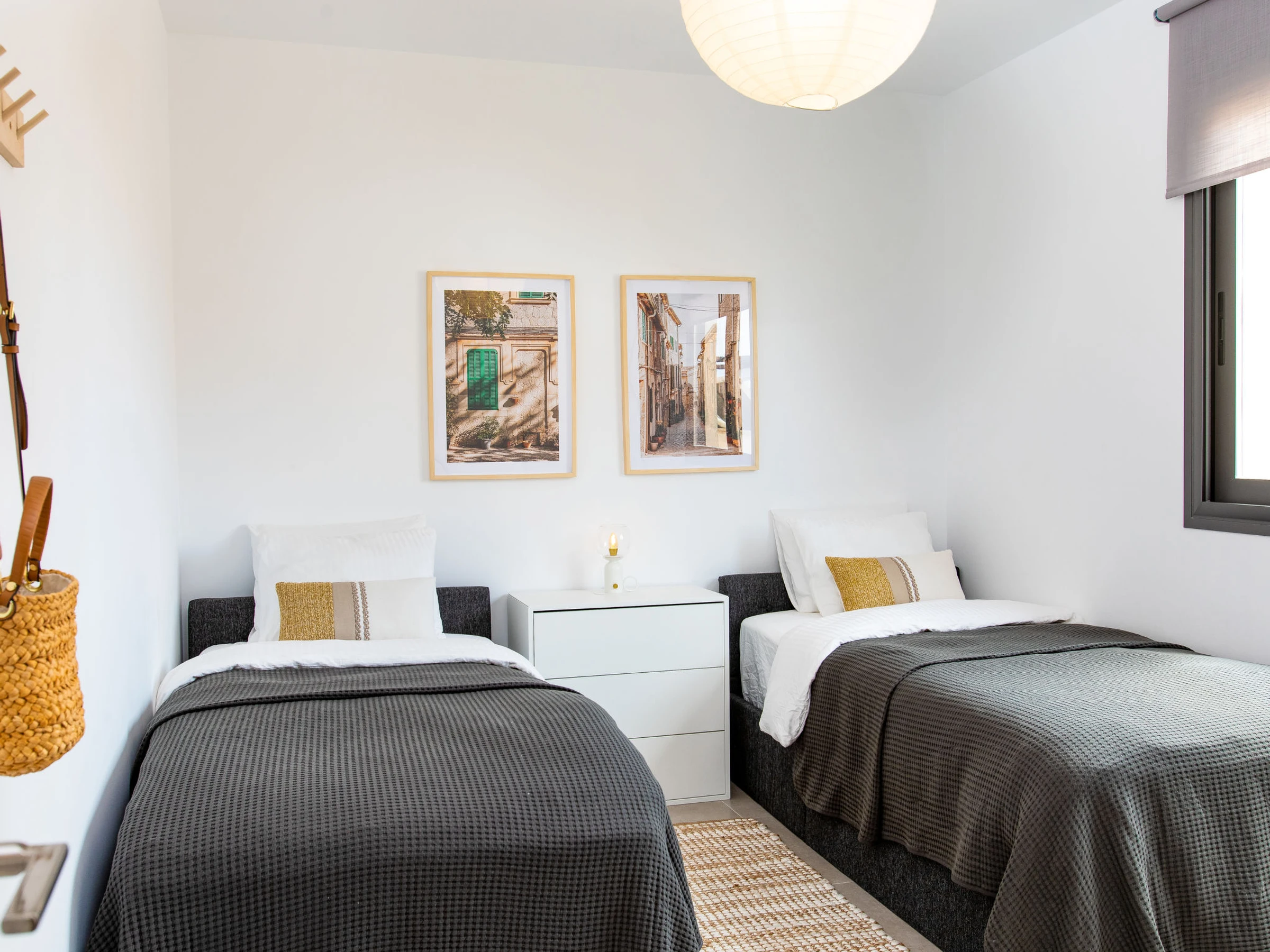 "Marinsa Beach, Sea View/Roof terrace", 3-room apartment 95 m2 on 3rd floor. Comfortable and cosy furnishings: living/dining room with digital TV, international TV channels, air conditioning, forced-air heating and electric shutters. Exit to the terrace. 1 room with 2 beds (90 cm, length [hidden] cm), air conditioning, forced-air heating and electric shutters. 1 room with 1 bed ([hidden] cm, length [hidden] cm), shower/WC (private) electric shutters. Exit to the swimming pool. Open kitchen (oven, dishwasher, 3 induction hot plates, toaster, kettle, microwave, freezer, electric coffee machine, Capsules for coffee machine (Nespresso)) with dining table. Exit to the terrace. Shower/WC. Large terrace, small terrace. Terrace furniture, barbecue, deck chairs (2), sitting area. Panoramic view of the sea. Facilities: washing machine, dryer, safe, iron, children's high chair, baby cot for up to 2 year olds, hair dryer. Internet (WiFi, free). Parking space n 12 (roofed). Please note: smoke alarm, fire extinguisher. "Marinsa Beach", rooftop apartment 70 m2 on 3th floor. South facing position with a fantastic sea view and sunset view. Spacious, comfortable and modern furnishings: Living/dining room with air conditioning, smart-TV and bluetooth speaker. Exit to the terrace. 1 room with 2 beds (90 cm, length [hidden] cm), built-in wardrobe and air conditioning. 1 room with 1 french bed ([hidden] cm, length [hidden] cm), built-in wardrobe and air conditioning. Exit to the terrace. 2 showers/WC. Open kitchen (oven, microwave, wine cooler, dishwasher, induction hob, fridge/freezer, toaster, Nespresso coffee machine). 2 terraces (1 big terrace and 1 stunning roof terrace of 40 m2. Panoramic view of the sea. A perfect place to watch beautiful sunsets. Terrace furniture, including a big lounge sofa, sunbeds, a large pergola and an outdoor shower. Facilities: washing machine, dryer, iron, children's high chair, baby cot for up to 3 year olds, hair dryer. [hidden]