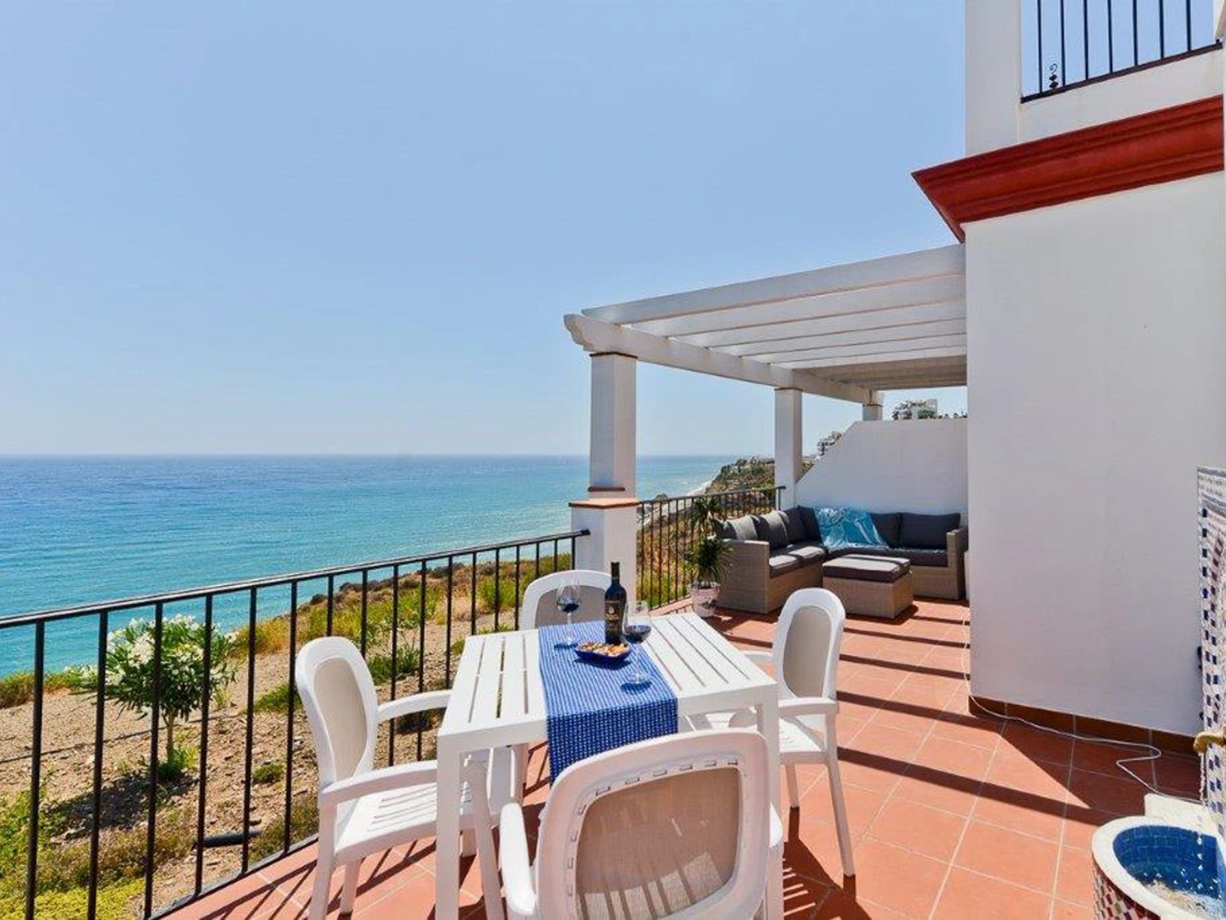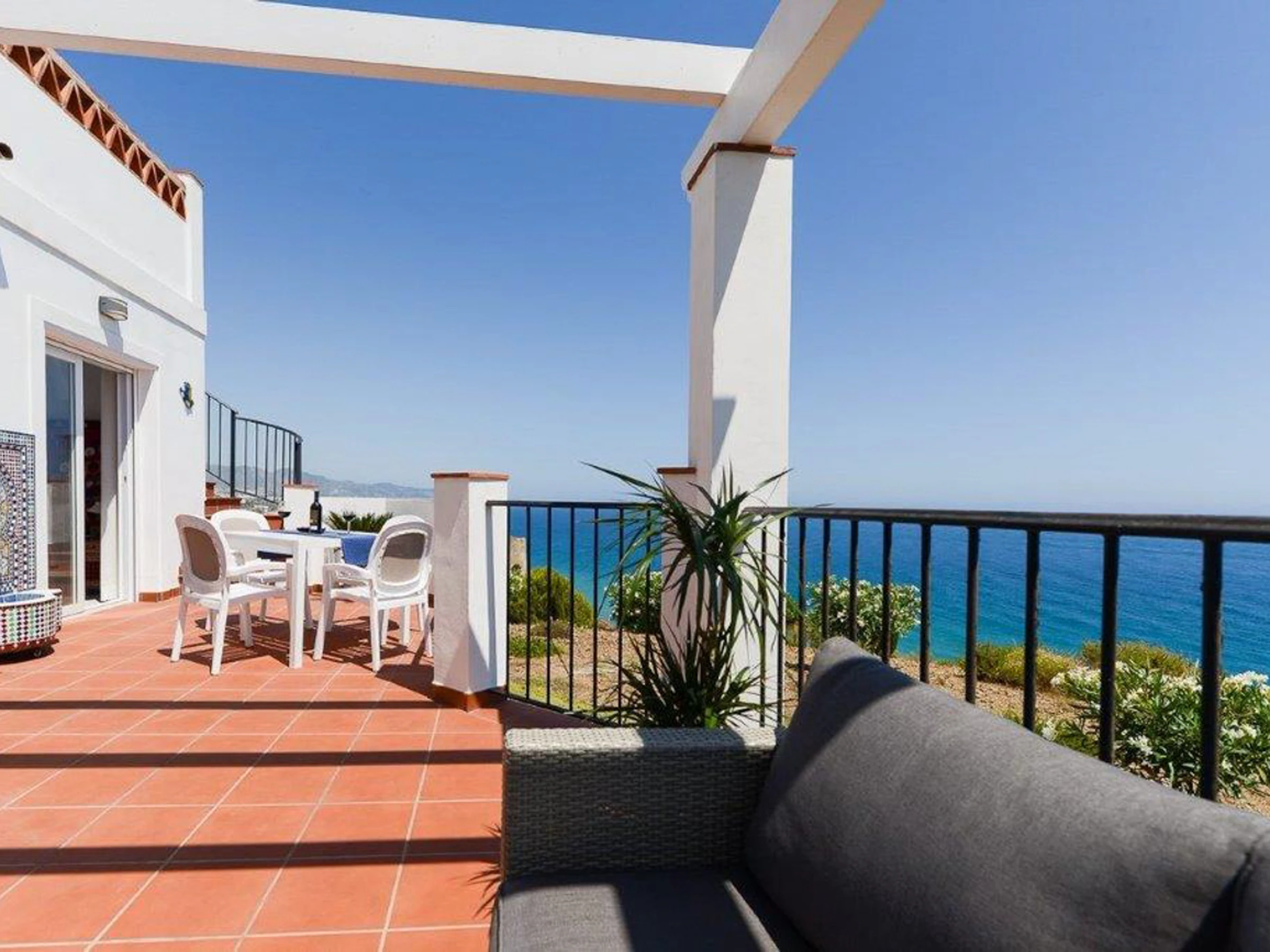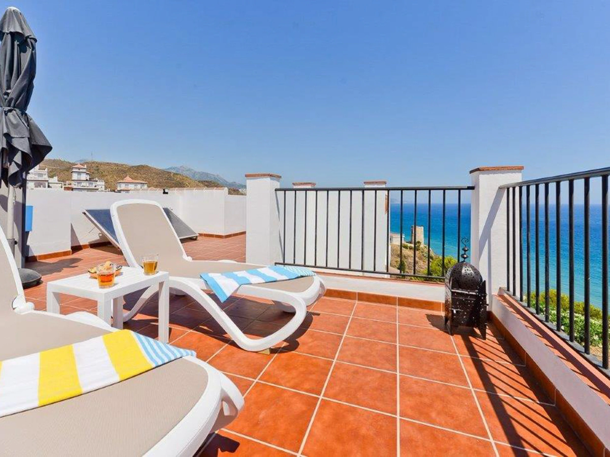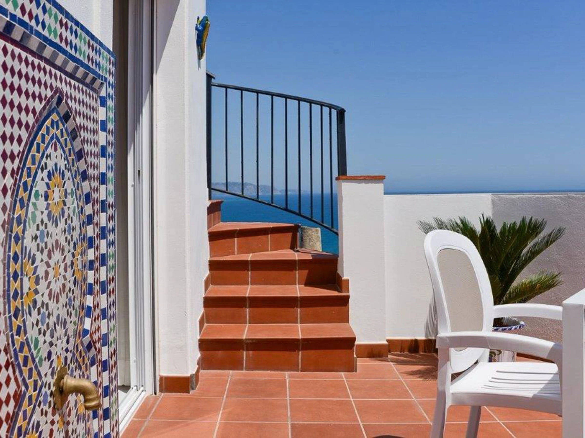 A curved staircase leads to the expansive 36 sq. meter rooftop terrace, perfect for all-day sunbathing and panoramic sea views stretching from Nerja to Torrox-Costa.