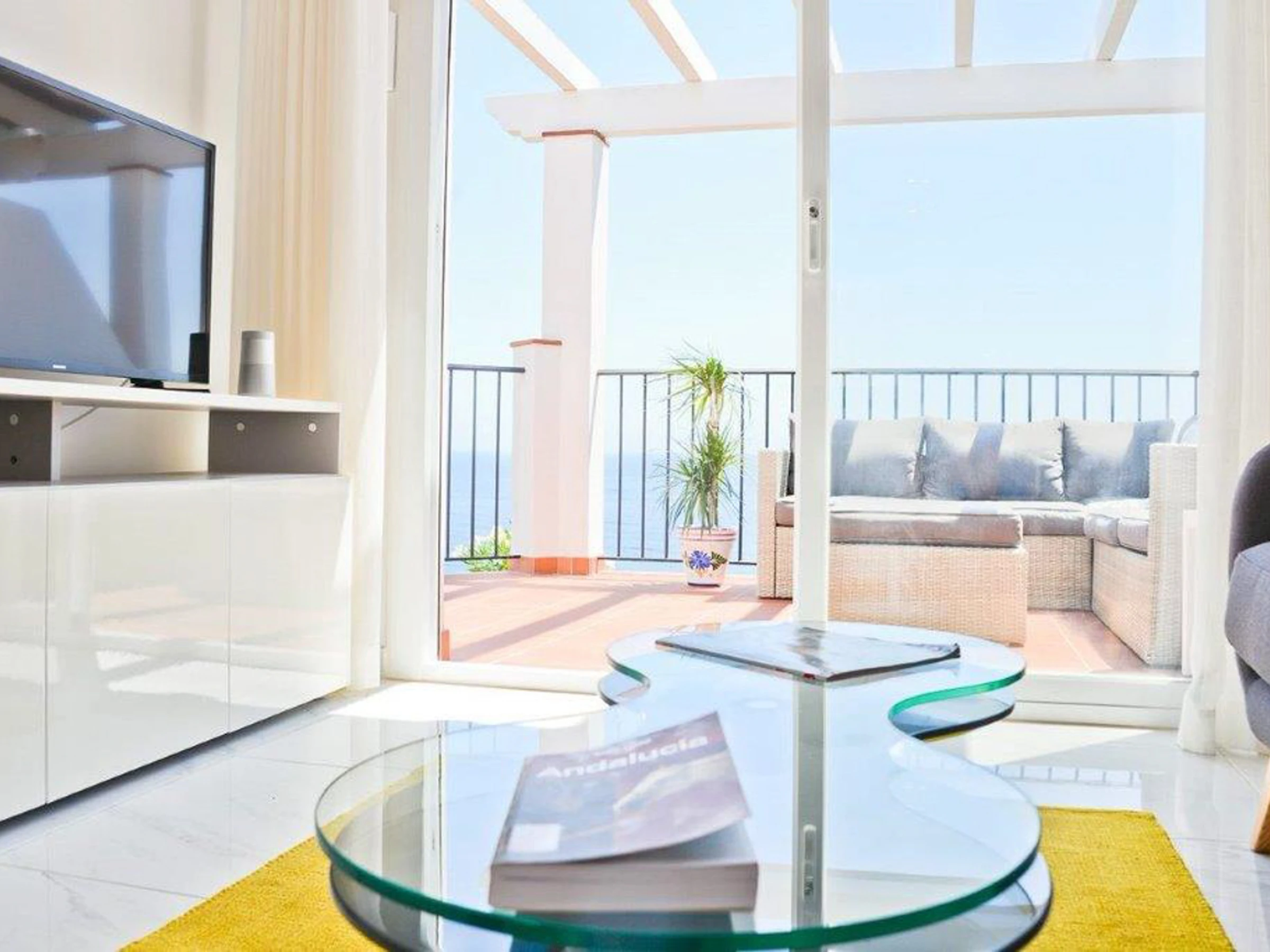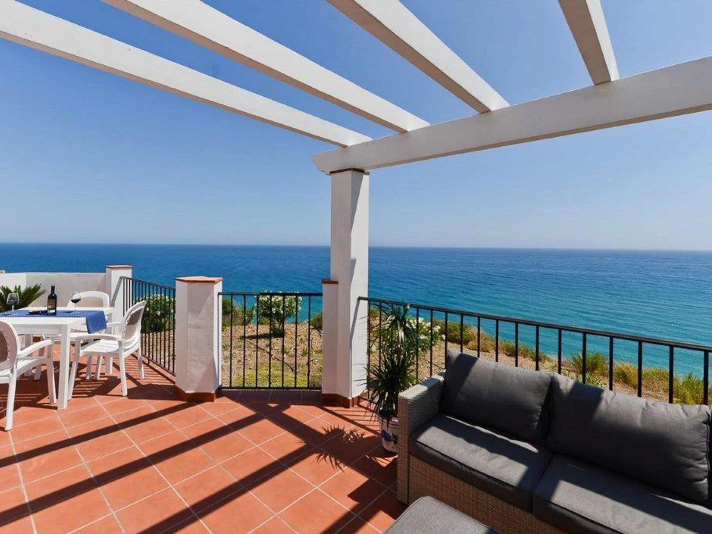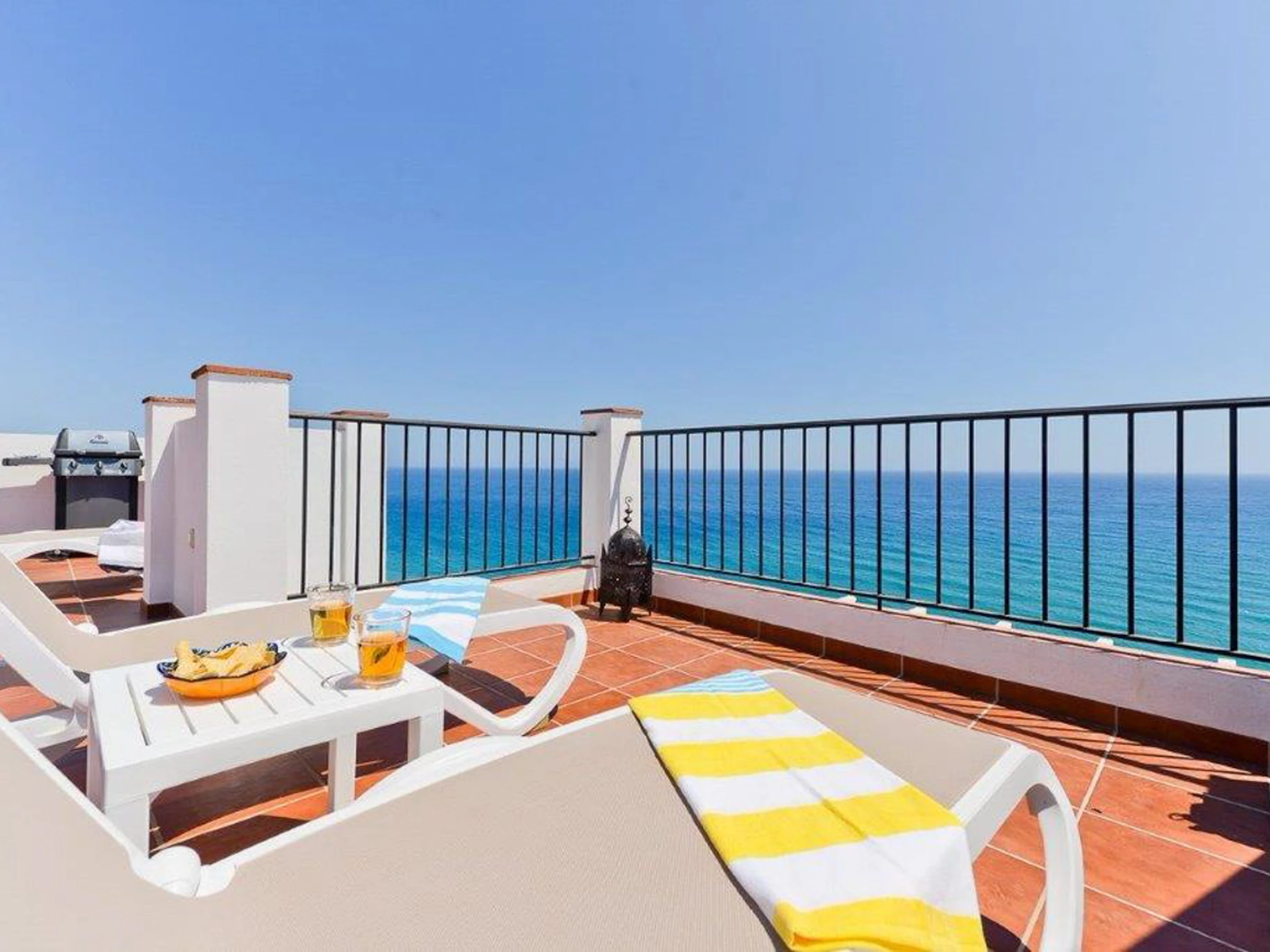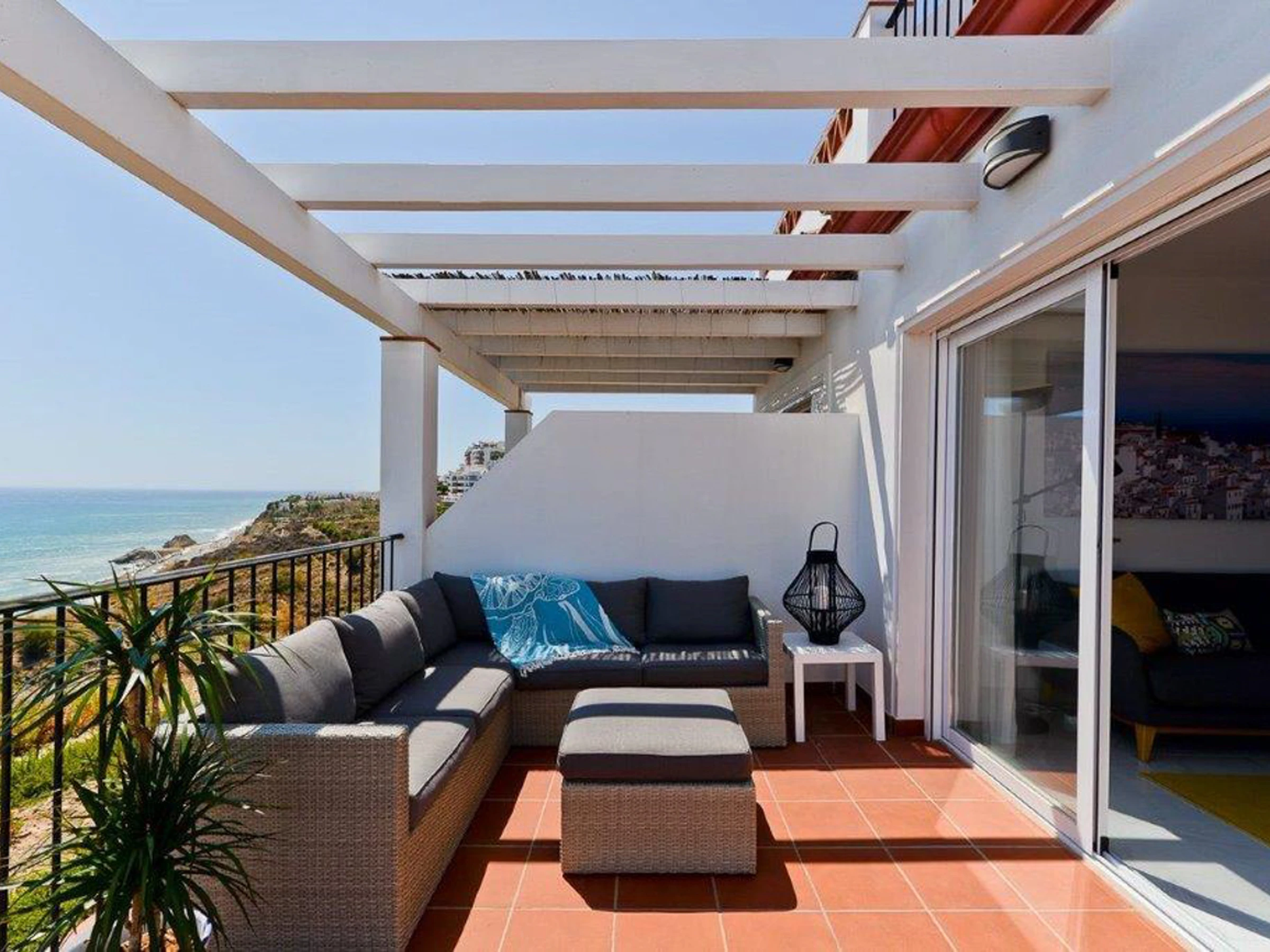 A curved staircase leads to the expansive 36 sq. meter rooftop terrace, perfect for all-day sunbathing and panoramic sea views stretching from Nerja to Torrox-Costa.
