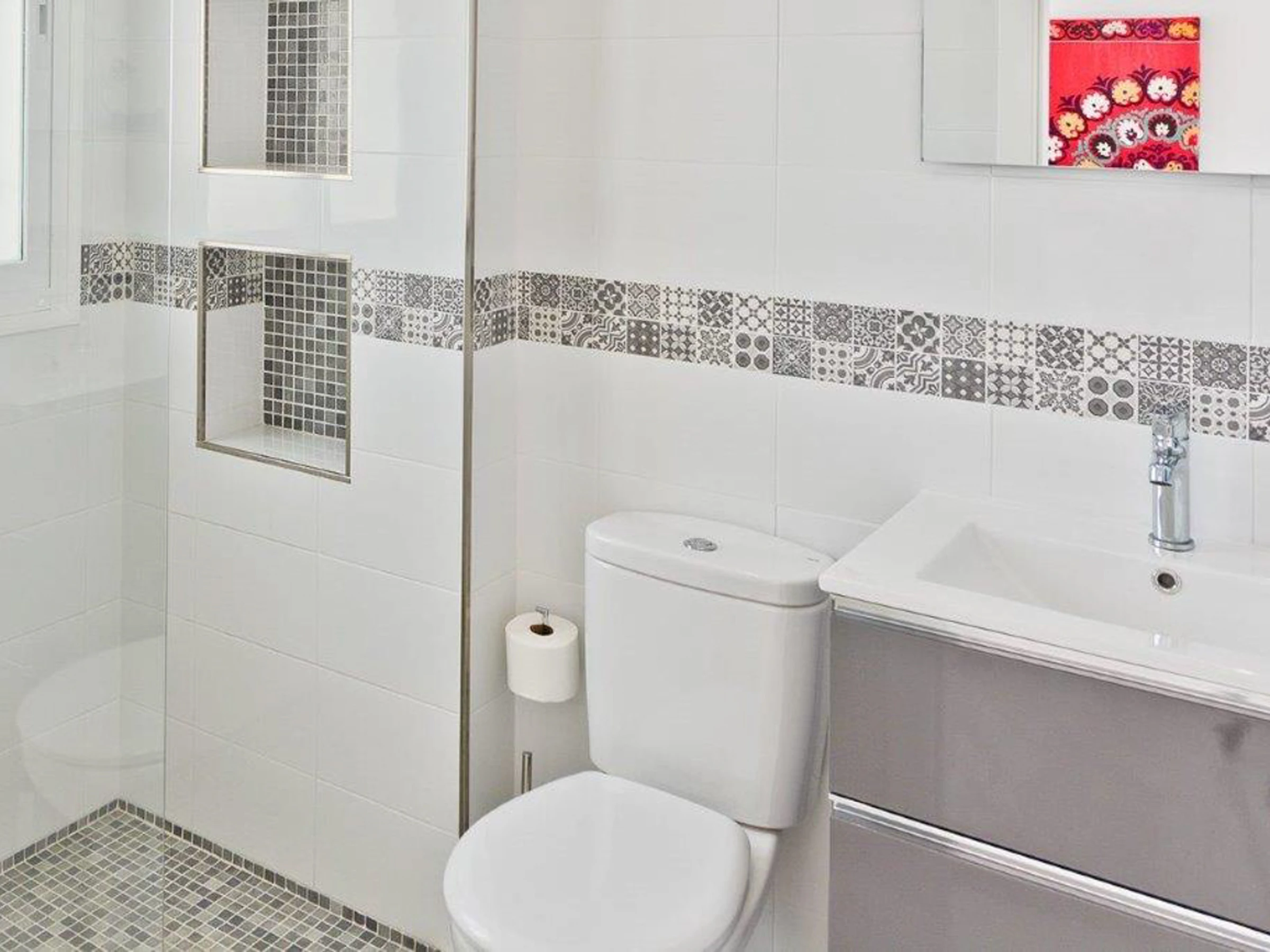 Both bathrooms are designed with walk-in showers and ample storage, ensuring convenience and modern comfort.
