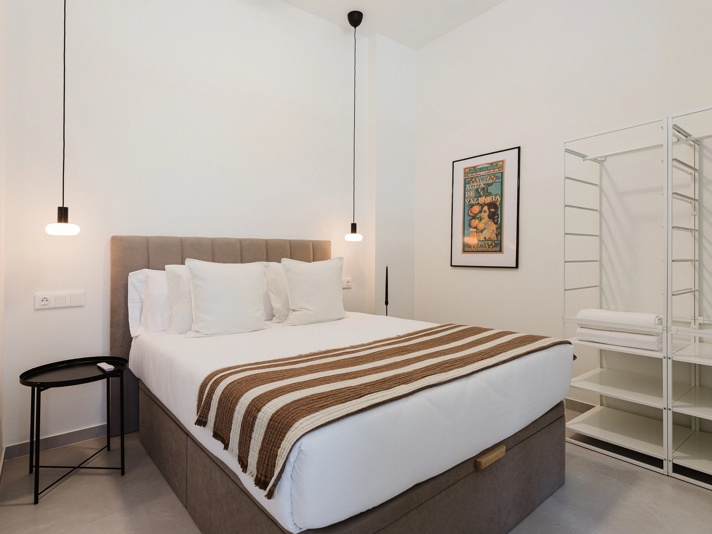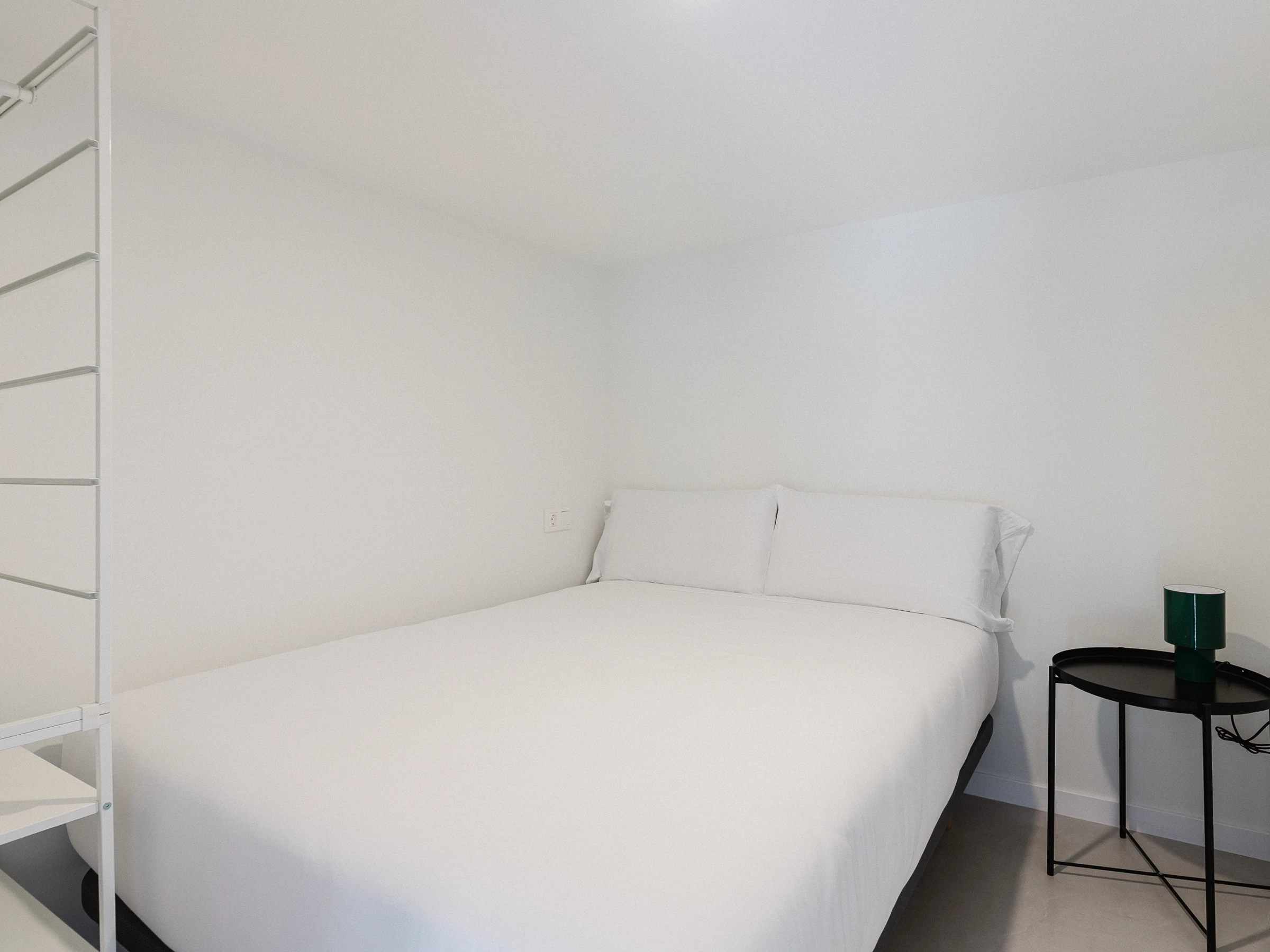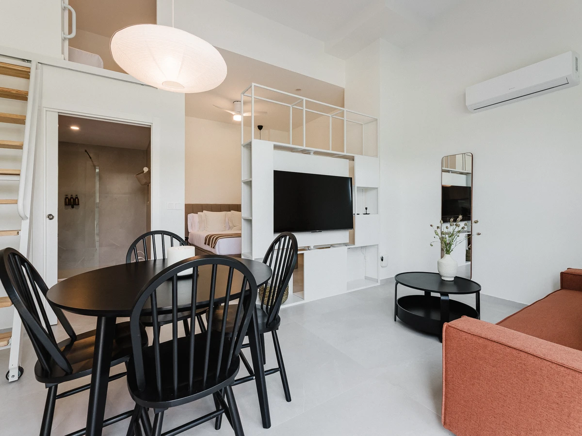• Semi-private bedroom with a queen-size bed (1.60 m), located in the main space and delimited from the living room by a rotating TV furniture.