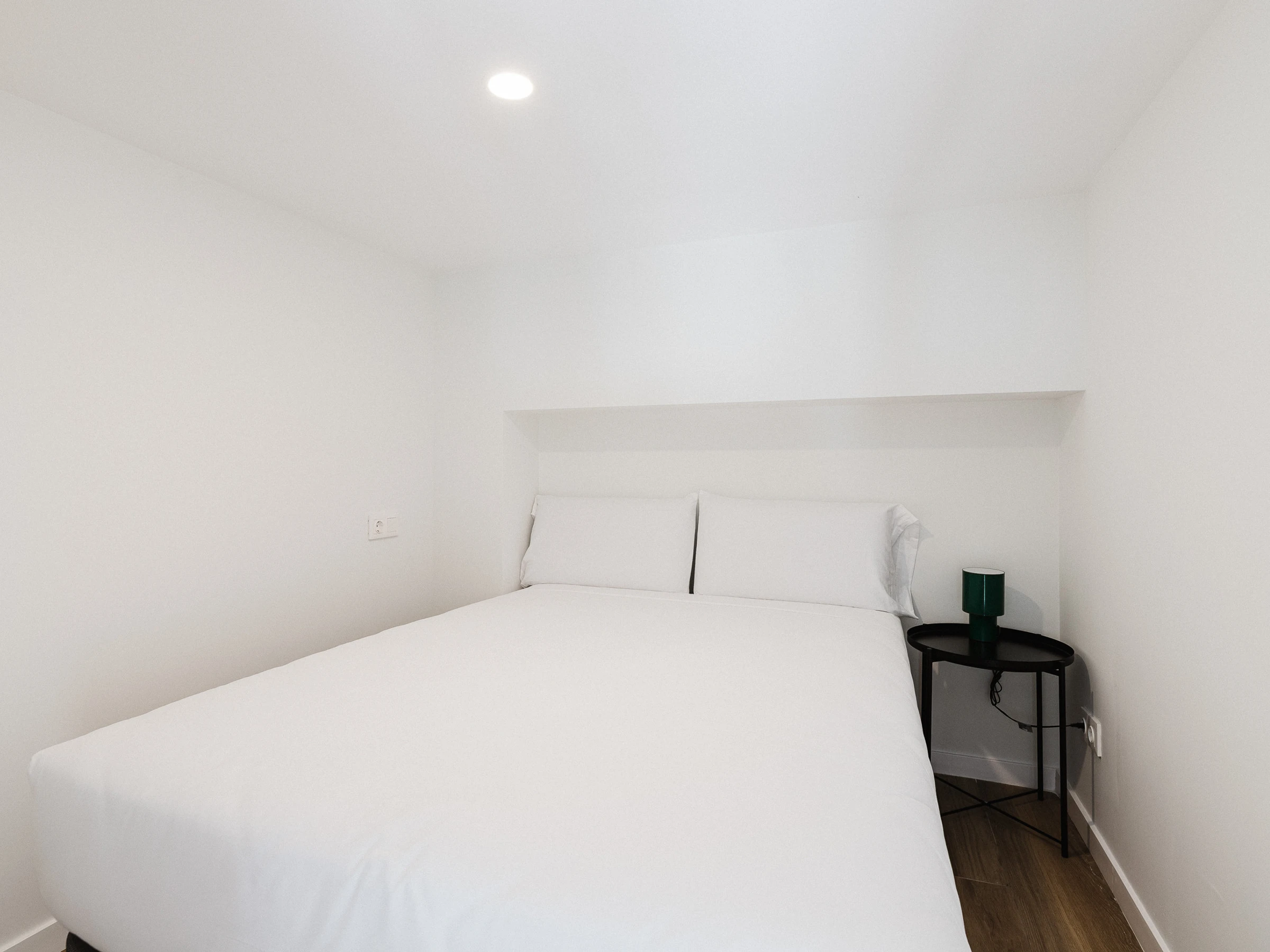 - Semi-private main bedroom in the central space, separated from the living room by a rotating TV furniture that visually divides both environments.