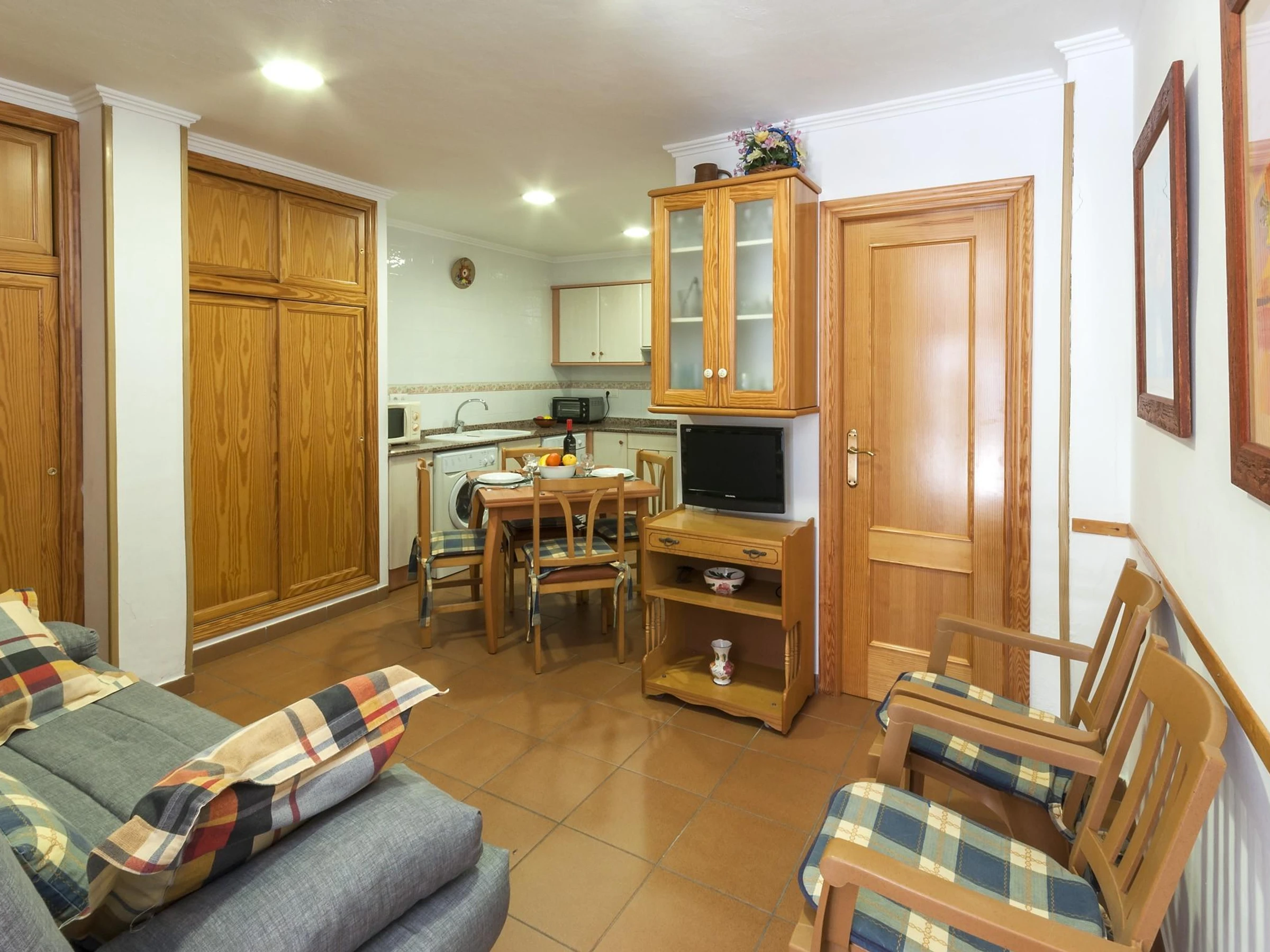 The living room, dining room and kitchen are in the same room. There, you can relax cooling, thanks to the air conditioning at your disposal, while watching TV or reading a book. In the furnished dining room you can enjoy lunch and dinner with your loved ones. The kitchen has everything you need to cook up a feast, including electric stove. The property also features 1 washer machine, 1 dryer, 1 iron and 1 ironing board. The house has 1 bedroom with 1 double bed, 1 wardrobe and access to 1 [hidden] sofa bed the living room can be prepared for a third guest. Also, in the apartment you have access to one full bathroom with shower, 1 fan and 2 radiators.