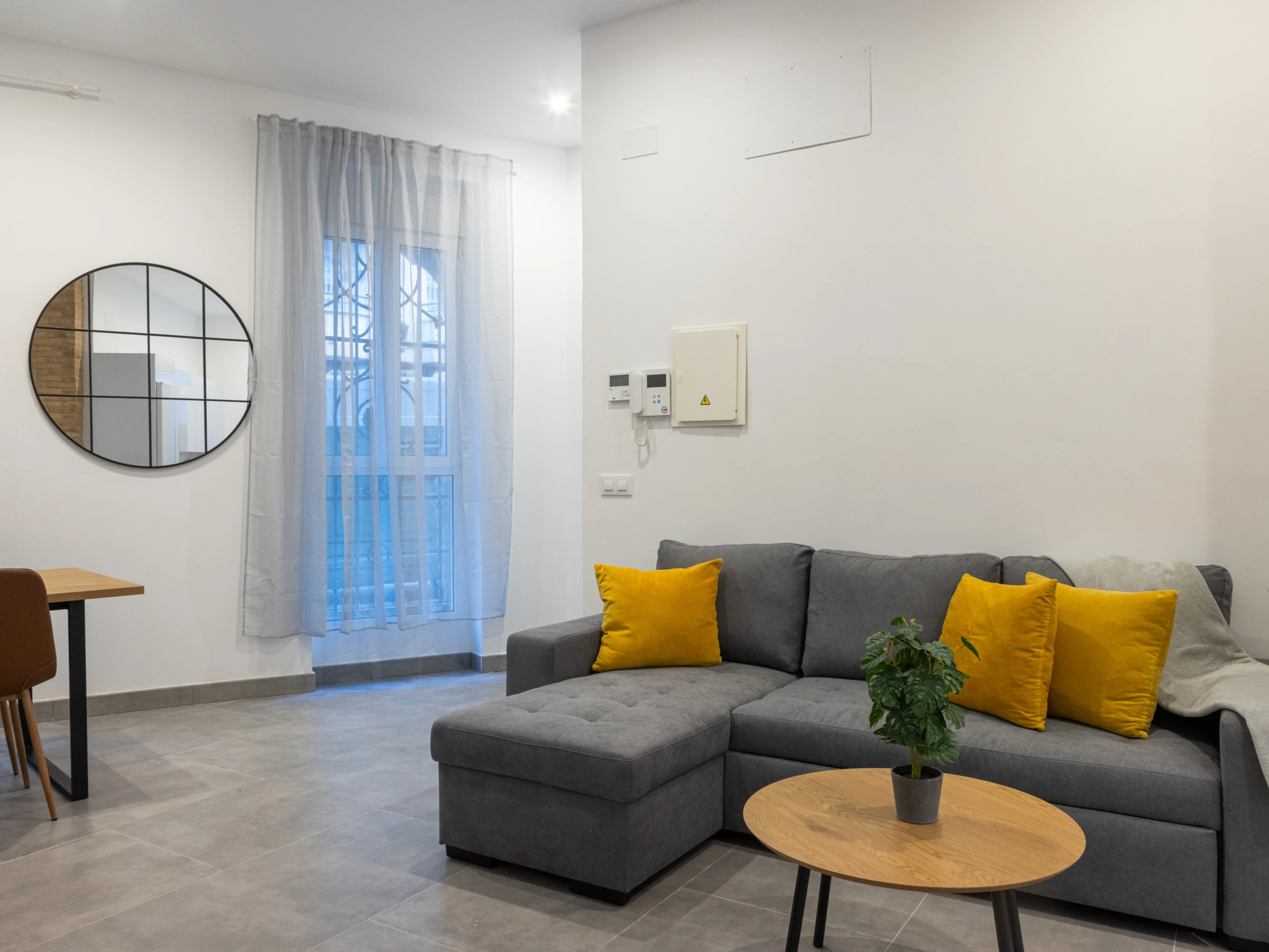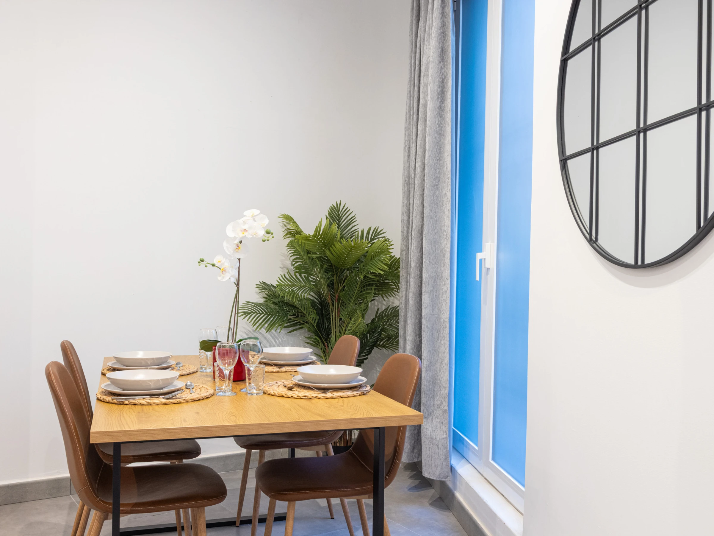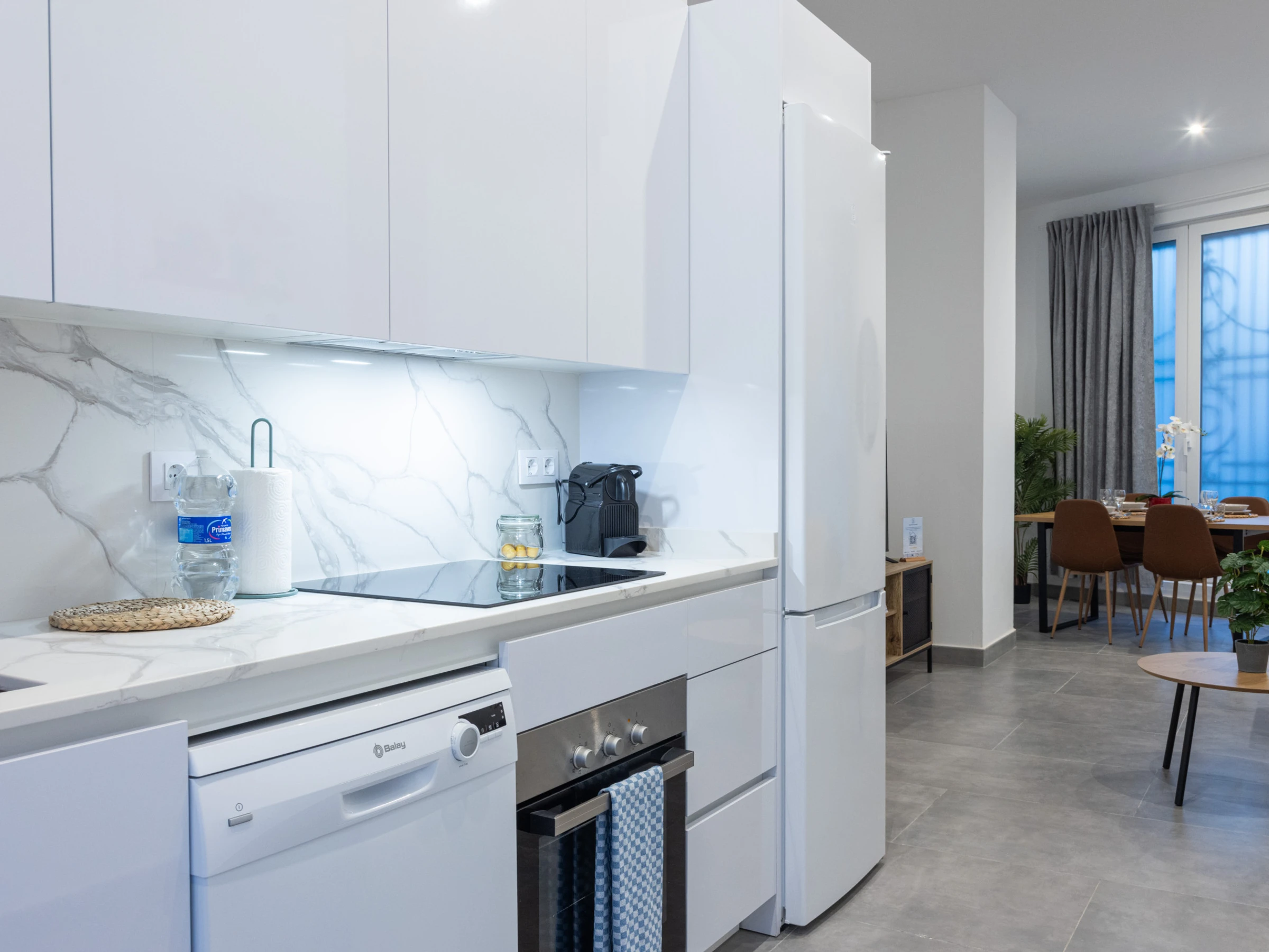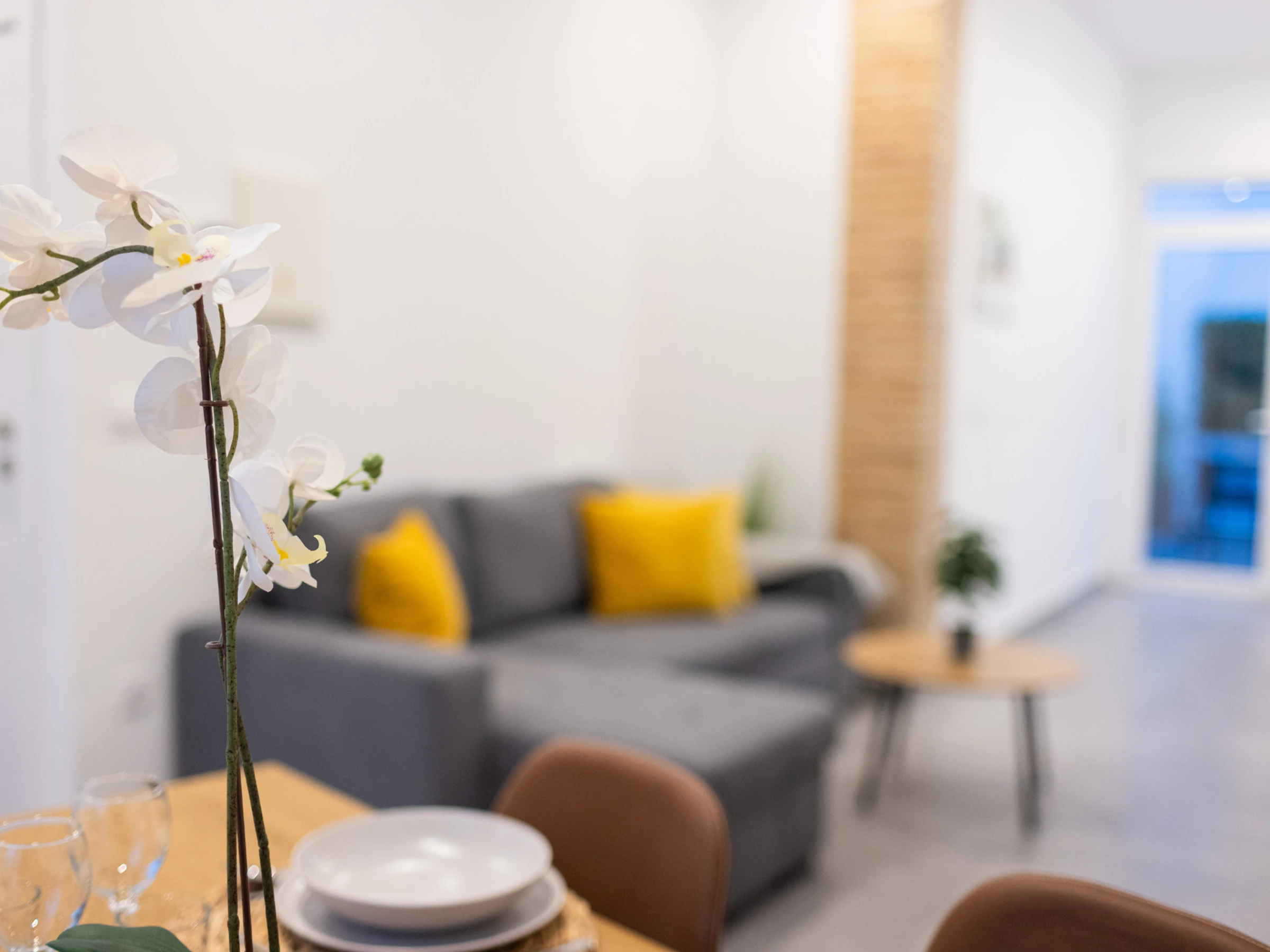 Upon entering the apartment, you will be greeted by a bright living room with a comfortable sofa bed for one or two people. The décor is inspired by nature with minimalist and relaxing touches that will make you feel at home from the moment you arrive.