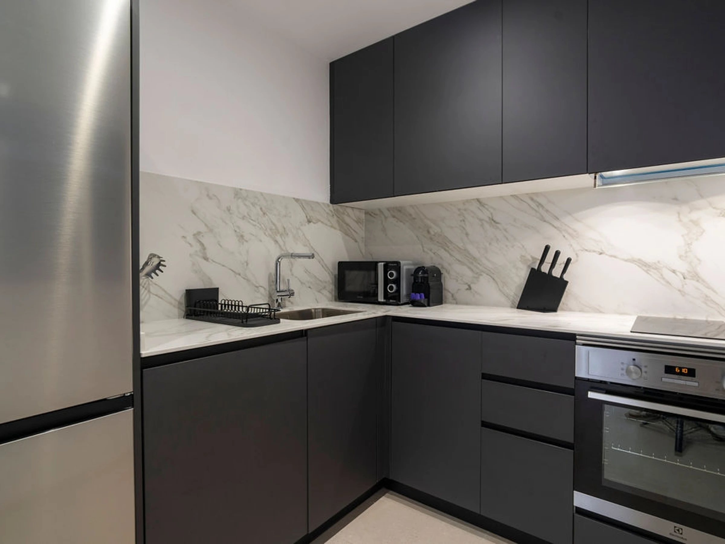 The kitchen has an oven, microwave, toaster, kettle, induction hob and all the necessary amenities.