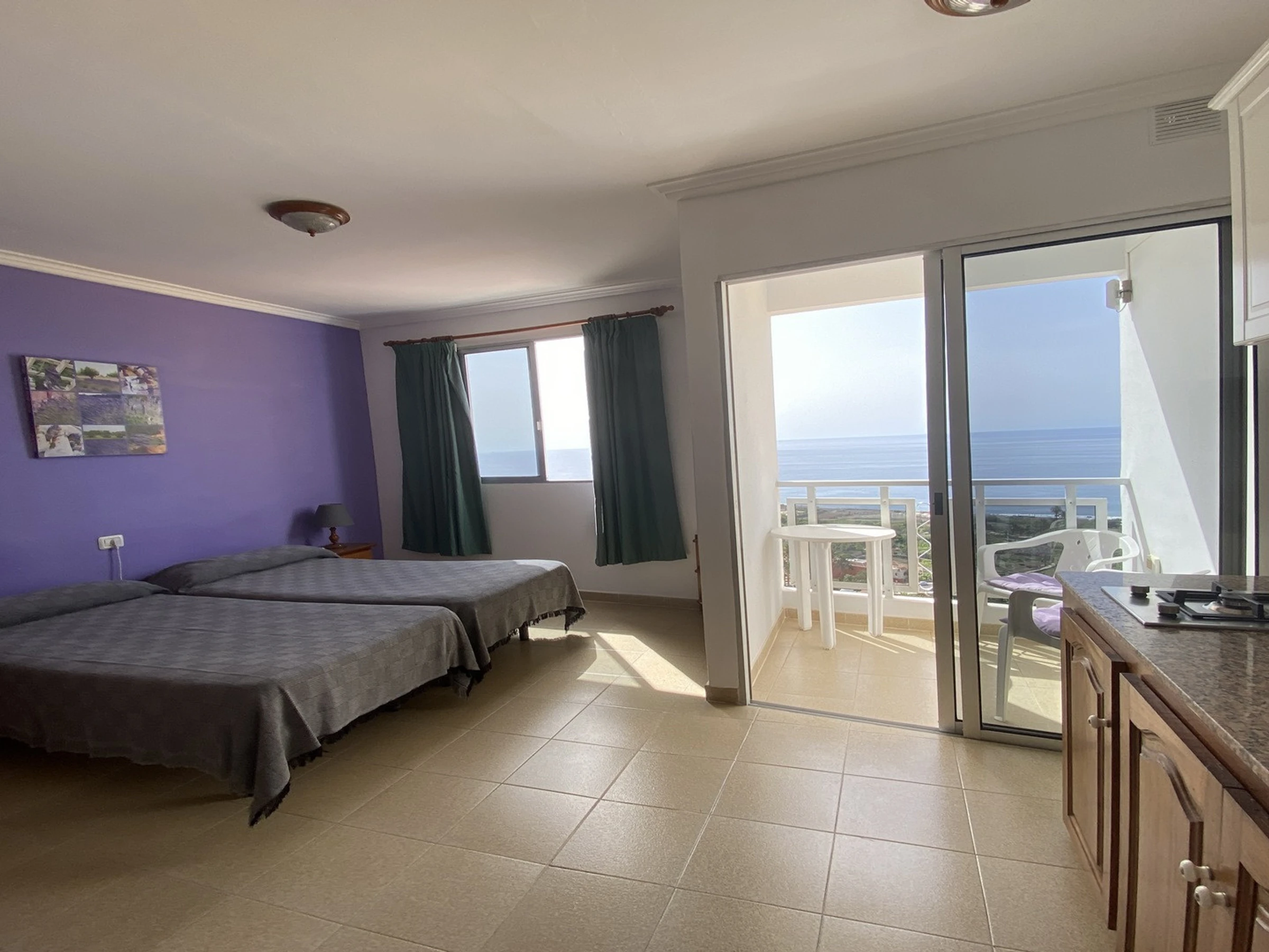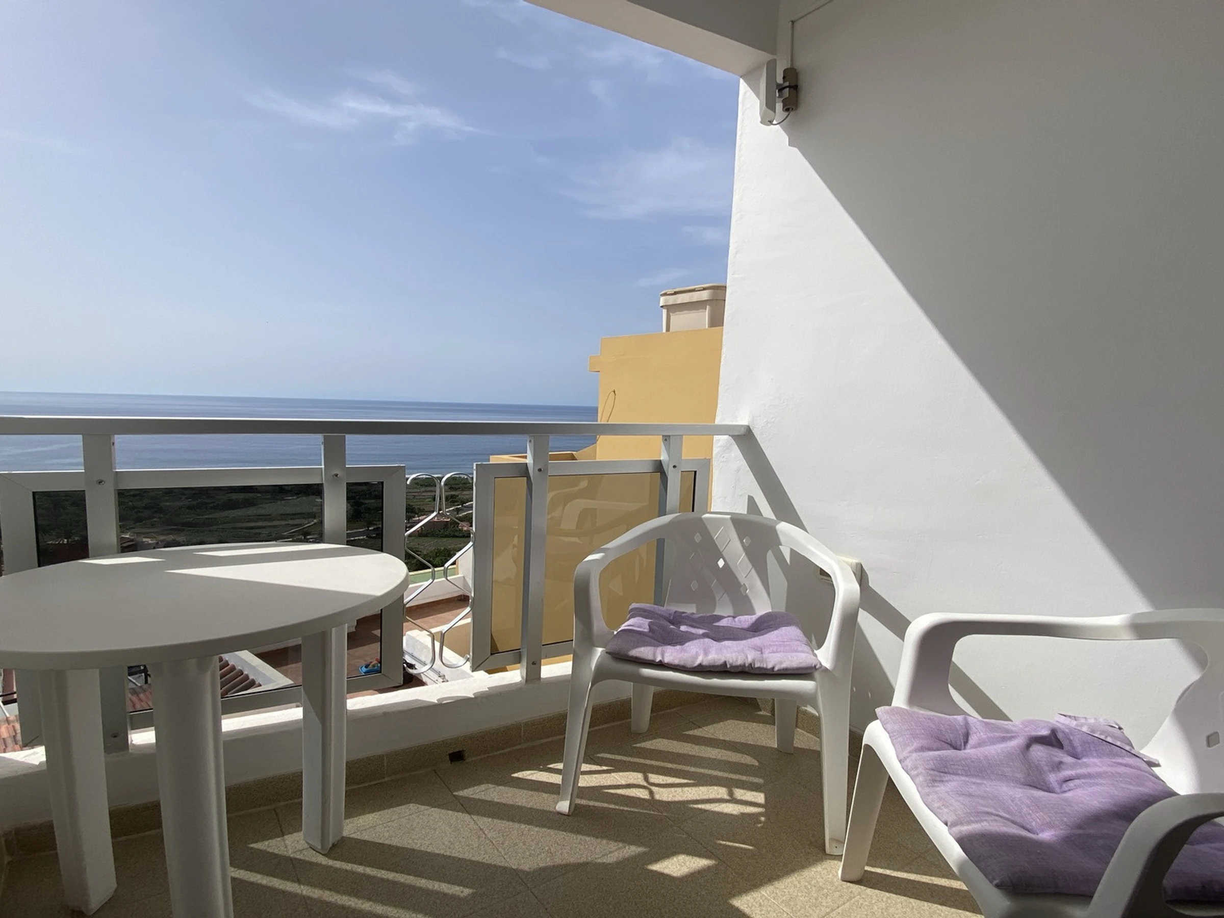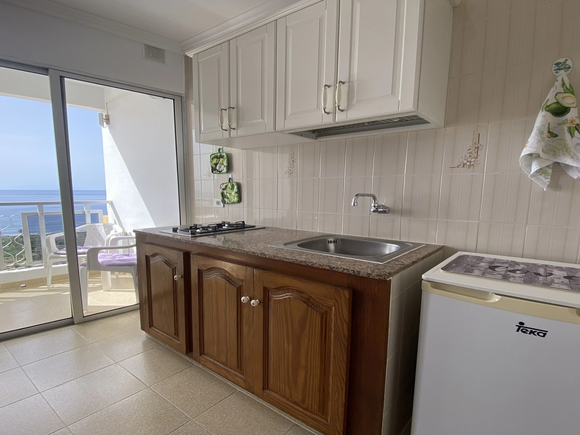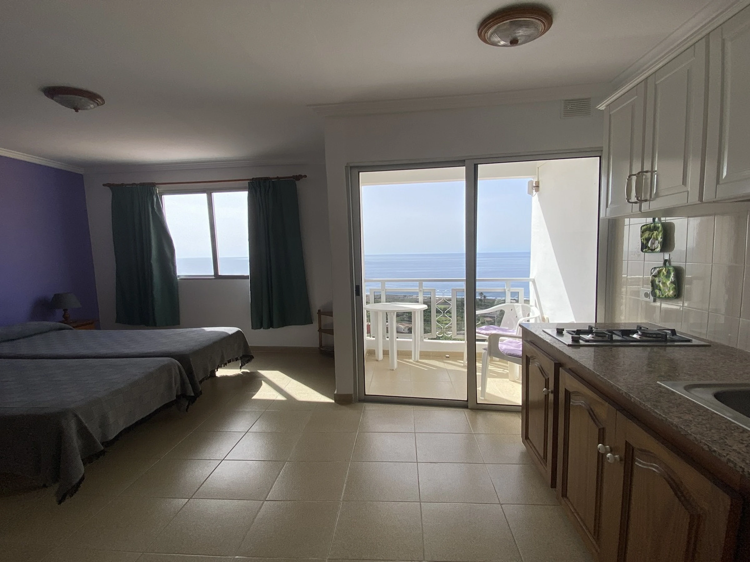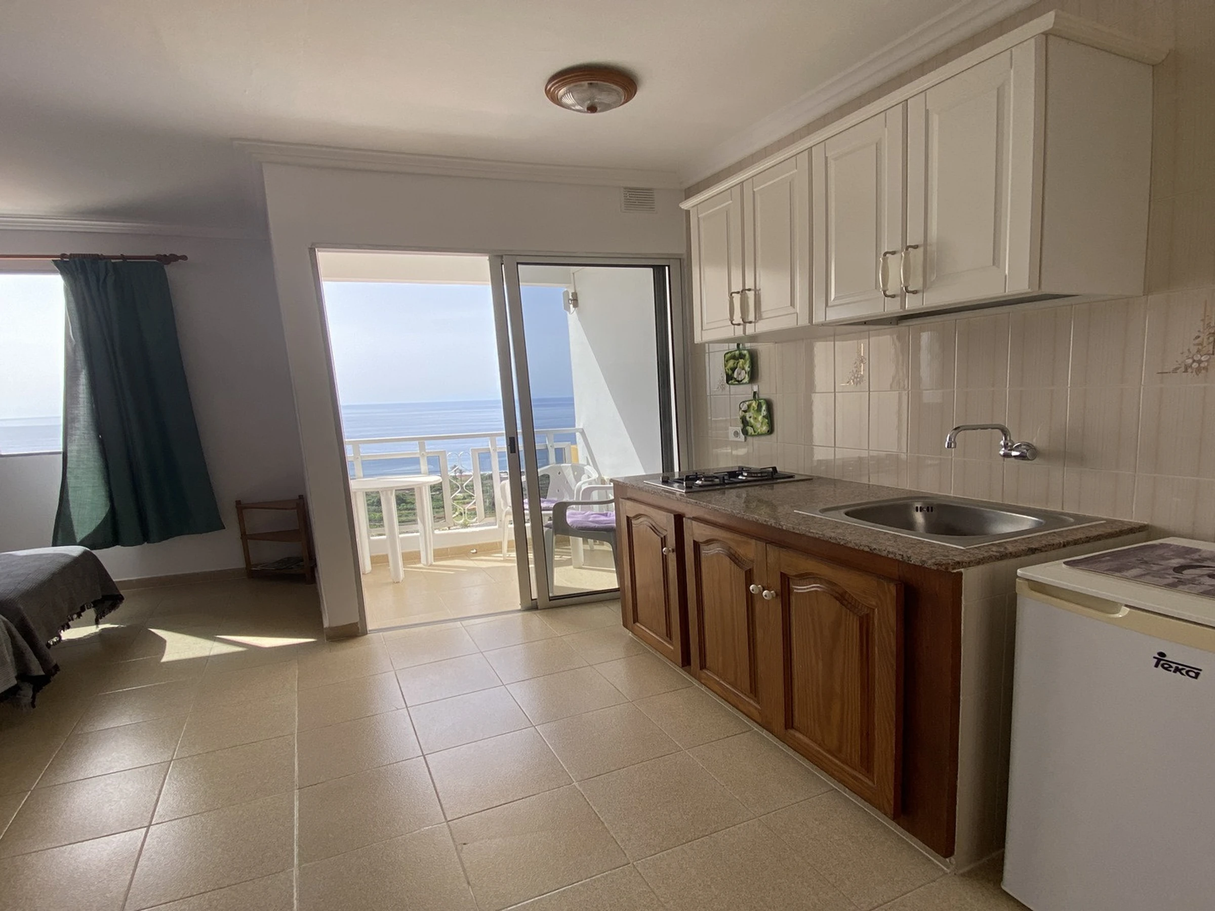 It is part of a traditional building with several flats. Studio No. 2 is located on the second floor. It has one room with a kitchen, living and sleeping area, and a bathroom. The small balcony is equipped with a table and chairs and offers sea views.