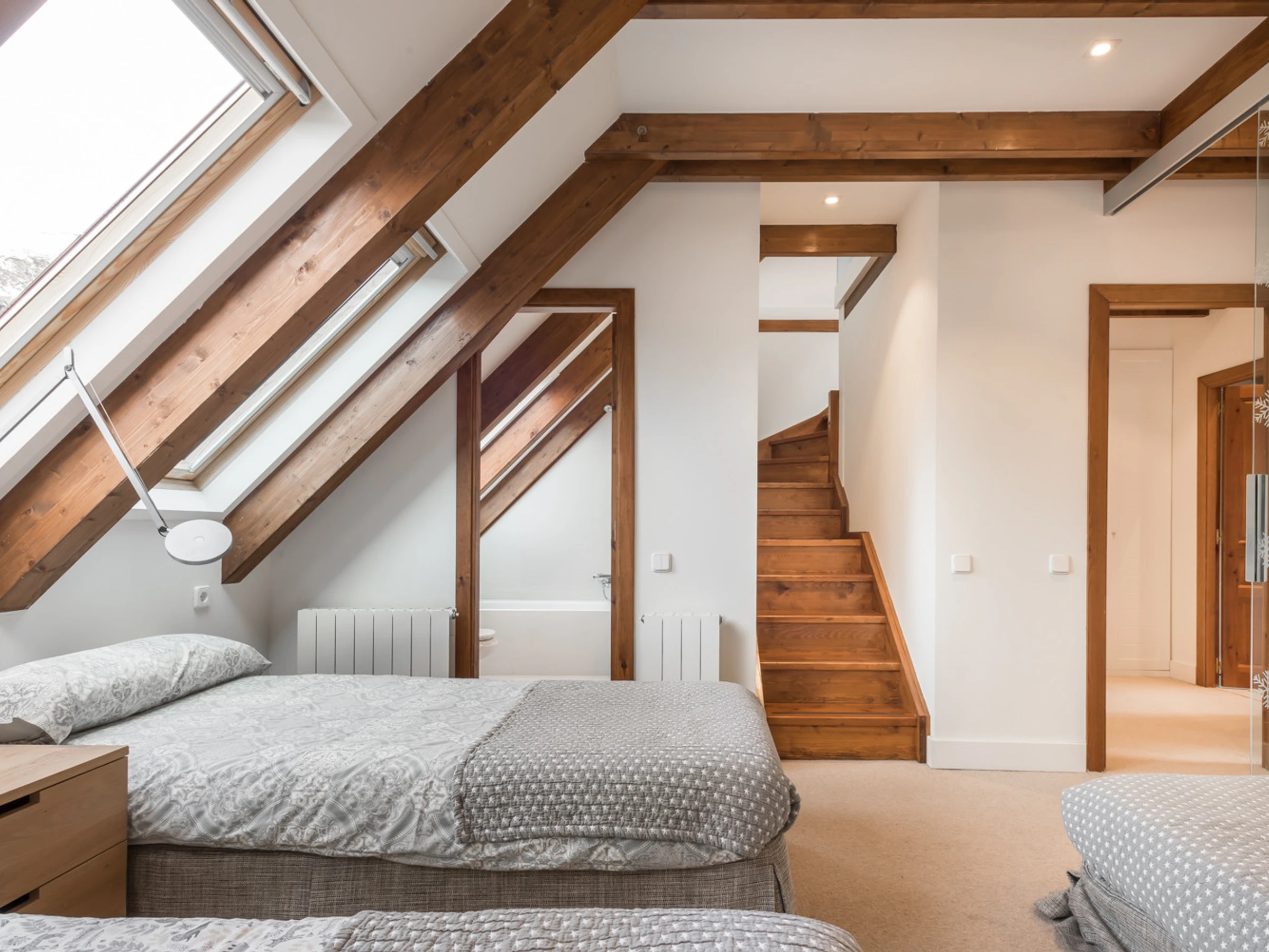 On the second floor, there are two other rooms, a main one with a double bed of 150 cm, carpet flooring, built-in wardrobes, smart TV and spectacular views of the mountains. The second room has 3 single beds and access to the mezzanine, which functions as the fifth room and offers 3 individual sofa beds ideal for children, as well as another television. Both rooms share a full bathroom.