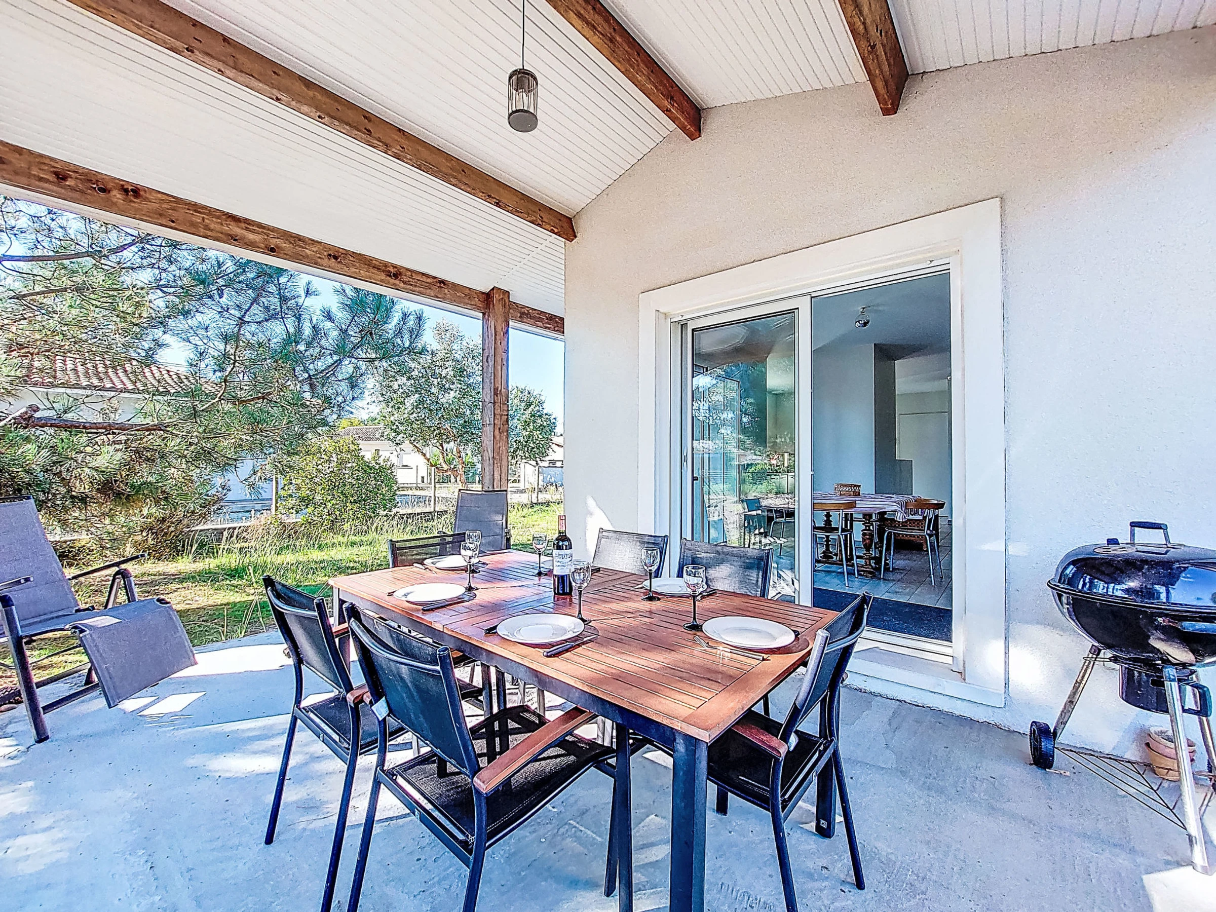 "Les Arbousiers", 4-room house 83 m2. Bright, practical furnishings: living/dining room with dining table and TV (flat screen). Exit to the terrace. 3 rooms, each room with 1 french bed (140 cm, length 190 cm). Open kitchen (oven, dishwasher, 3 induction hot plates, toaster, kettle, microwave, freezer, electric coffee machine). Shower, sep. WC. Wood heating. Terrace roofed. Terrace furniture, barbecue (portable), deck chairs. Facilities: iron. Internet (WiFi, free). Please note: non-smoking house. Maximum 1 pet/ dog allowed. Smoke alarm. Offer by a private individual according to Art. 155, IV of CGI.
