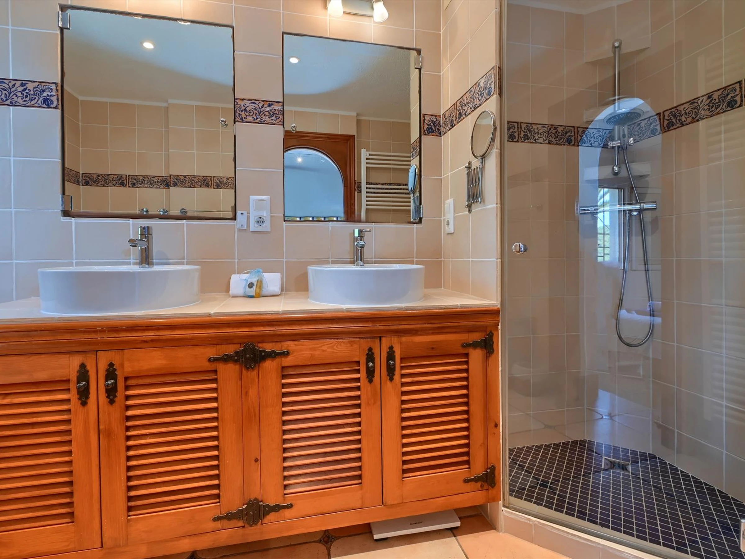 * en-suite bathroom with double washbasin, bath, shower and toilet