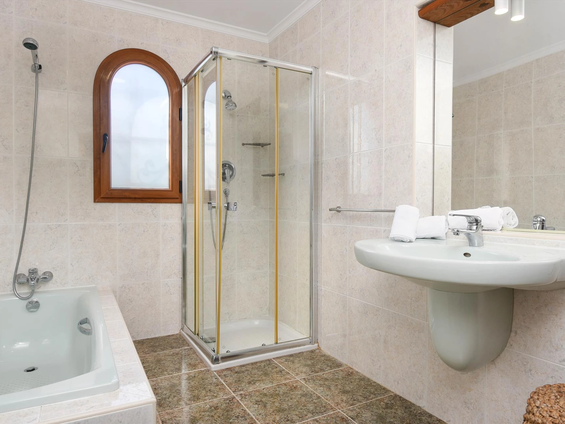 * bathroom with single washbasin, shower and toiletExterior of the villa