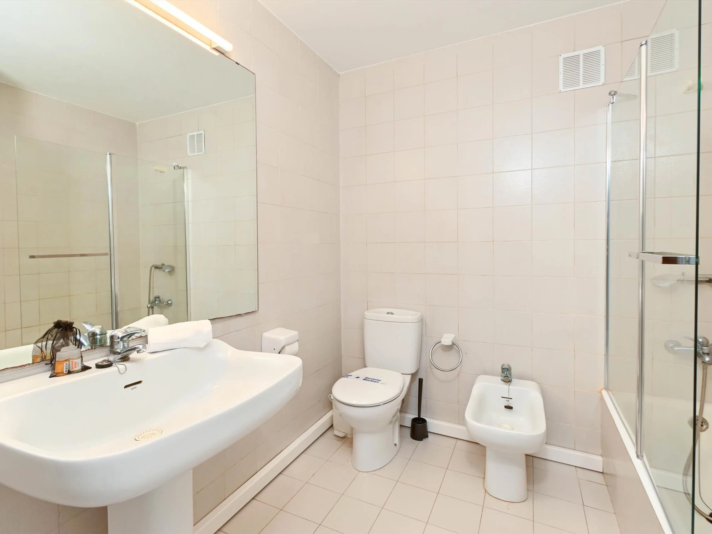 * Bathroom with single washbasin, bath/shower combination, bidet and toilet