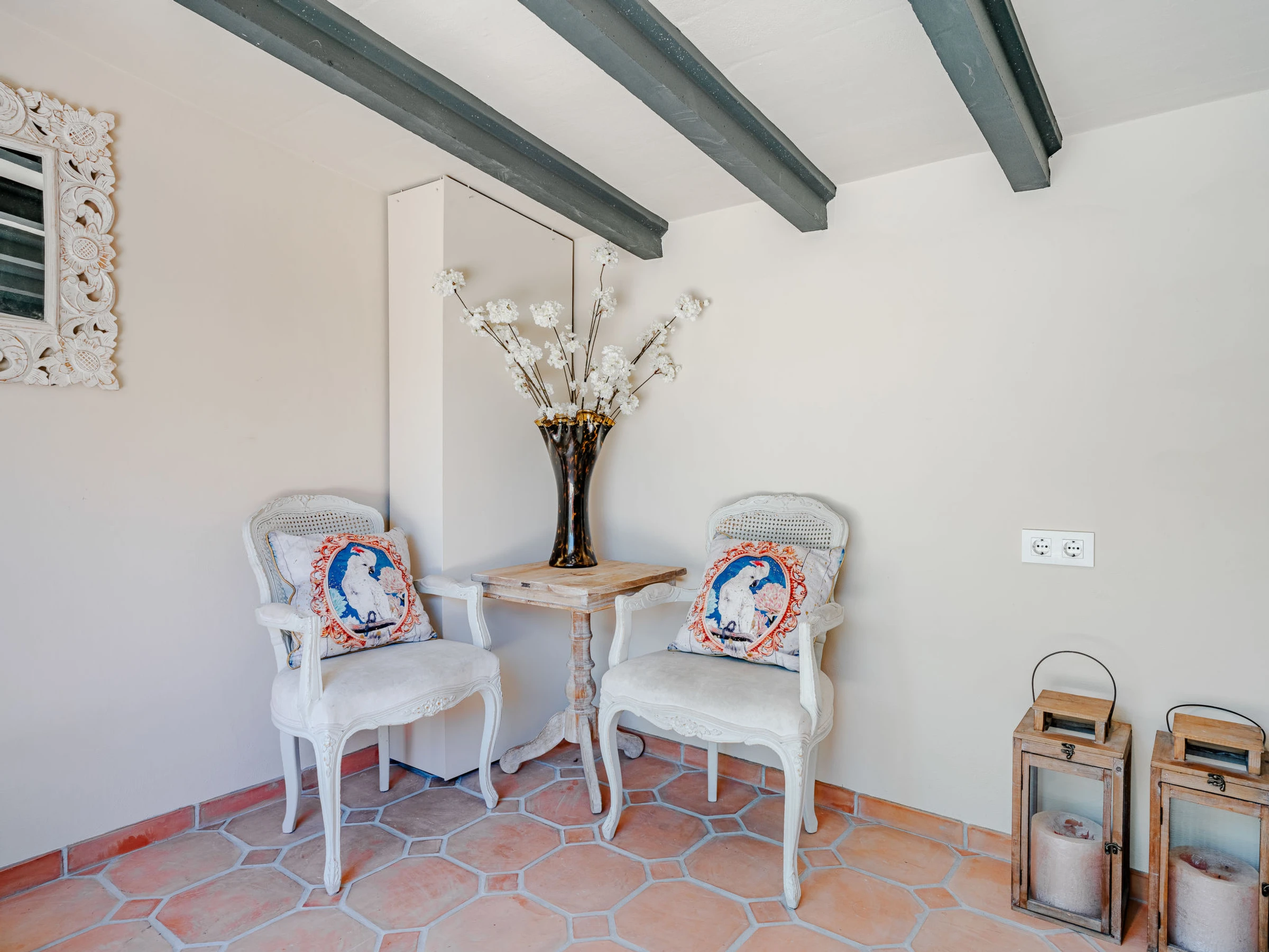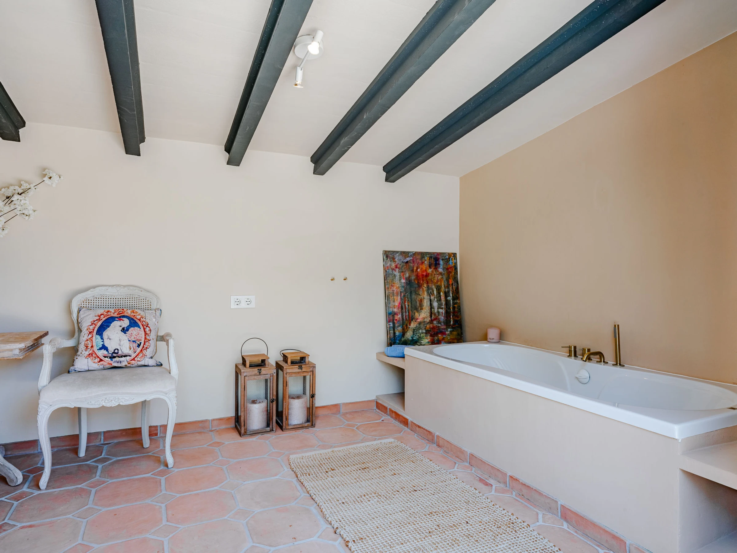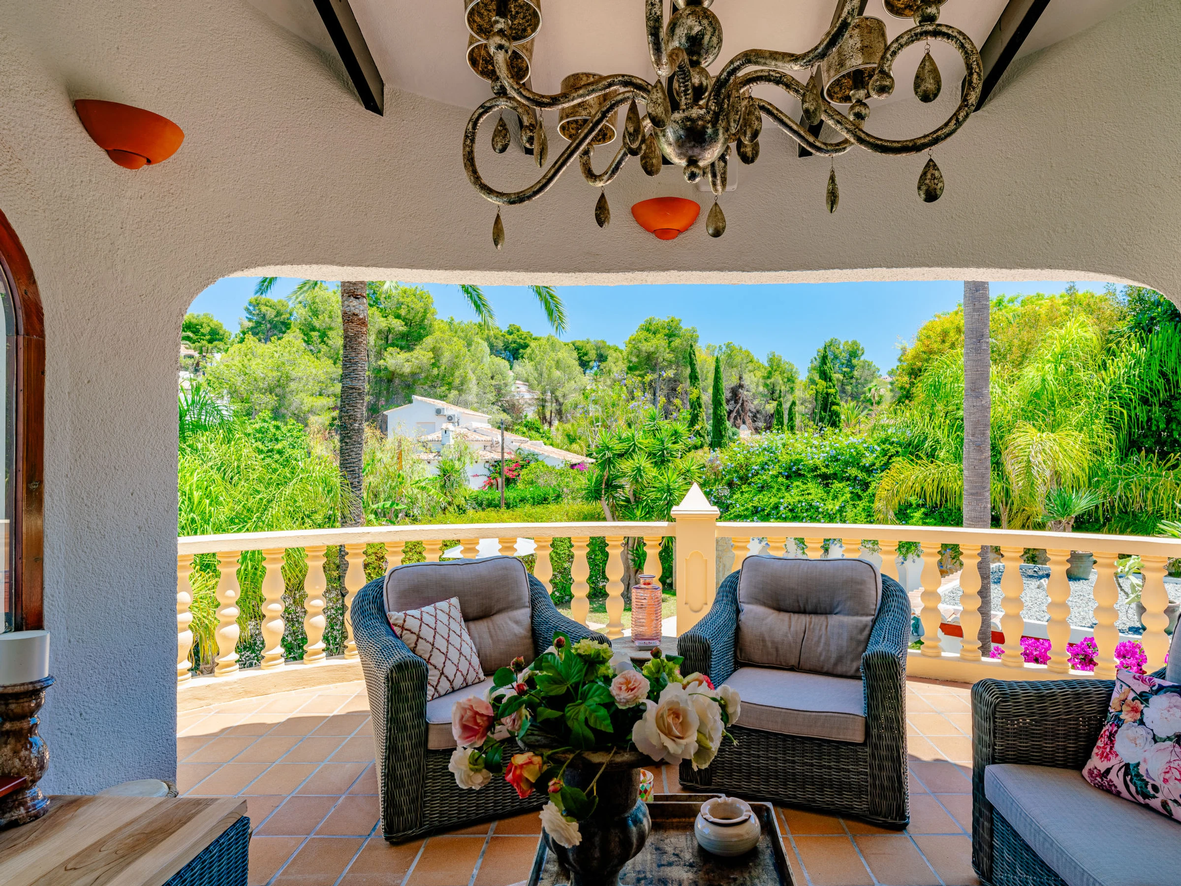 Very beautiful, luxurious villa "Charme", 2 storeys, renovated. In the district of Entre Pinos, in a quiet, sunny position, 3 km from the sea, 3 km from the beach. Private: large, beautiful, well-kept terraced garden wildlife garden and trees, swimming pool angular (8 x 4 m, depth 110 - 200 cm, seasonal availability: [hidden] - [hidden] with internal staircase. Outdoor shower, patio, pergola, garden furniture, barbecue, parking on the premises. Shop 1.5 km, supermarket 1.5 km, restaurant 1.5 km, bar 1.5 km, bus stop "Toscamar" 1.6 km, sandy beach "El Arenal" 3.5 km. Golf course (9 hole) 8 km, surf school 3.5 km, sailing school 3.5 km, tennis 3.5 km. The owner does not accept any youth groups.