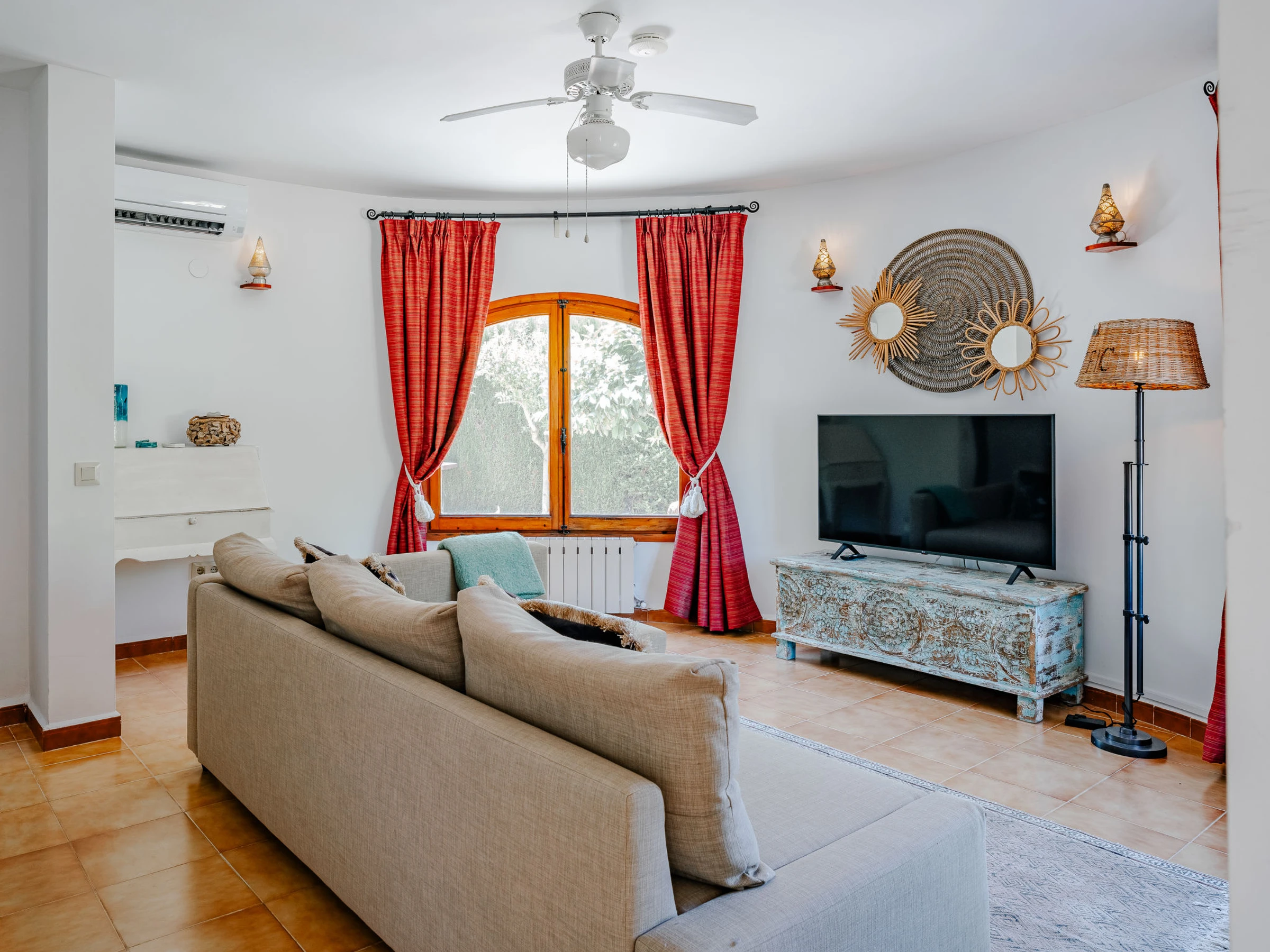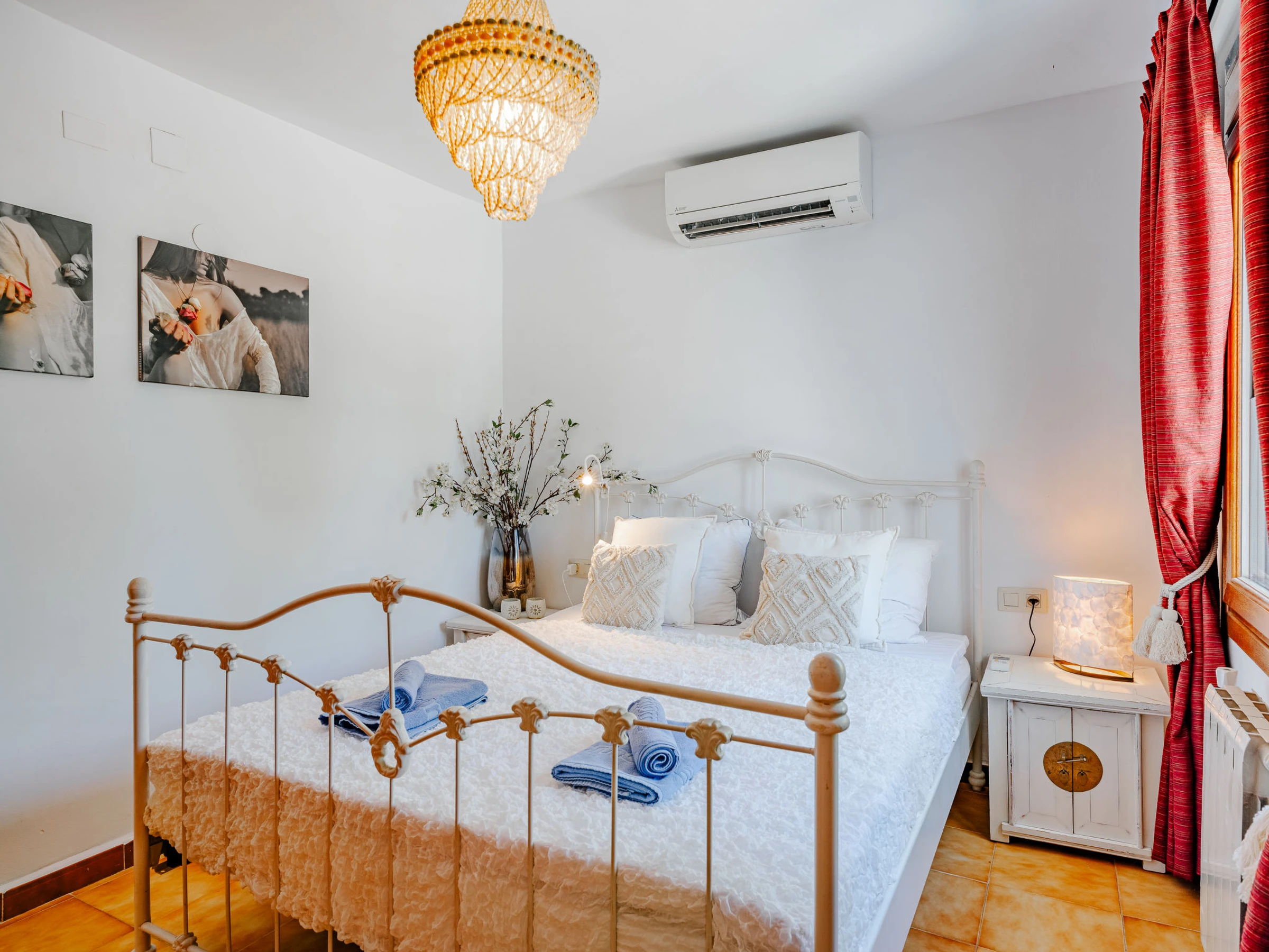 "Villa Charme", 7-room villa 300 m2 on 2 levels. Object suitable for 6 adults + 2 children. Spacious and bright, renovated, very beautiful and stylish furnishings: living/dining room with satellite TV, air conditioning and forced-air heating. Exit to the terrace. 1 room with 1 french bed (180 cm, length 210 cm), shower/WC, air conditioning and forced-air heating. Exit to the terrace. 1 room with 1 double bed (2 x 80 cm, length 200 cm), air conditioning and forced-air heating. 1 room with 1 x 2 bunk beds (80 cm, length 200 cm), fan. Exit to the terrace. Large, open kitchen (oven, dishwasher, 4 induction hot plates, toaster, kettle, microwave, freezer, electric coffee machine). Shower/WC. On the lower ground floor: (exterior staircase) living/dining room with satellite TV, air conditioning and forced-air heating. Exit to the patio, to the swimming pool. 1 room with 1 french bed (160 cm, length 200 cm), shower/WC, air conditioning and forced-air heating. (exterior staircase) lounge with hydro massage bath. Open kitchen (oven, 3 ceramic glass hob hotplates, toaster, freezer, electric coffee machine). Large terrace. Terrace furniture, balcony furniture, barbecue, deck chairs (6), covered balcony, sitting area. Very beautiful view of the mountains and the valley. Facilities: washing machine, dryer, iron, children's high chair, baby cot for up to 2 year olds, hair dryer. Internet (WiFi, free). Parking. 2 small pets/ dogs allowed. [hidden] // Reg. Nr.: ESFCTU0000030710003633240000000000000000000VT467072A1