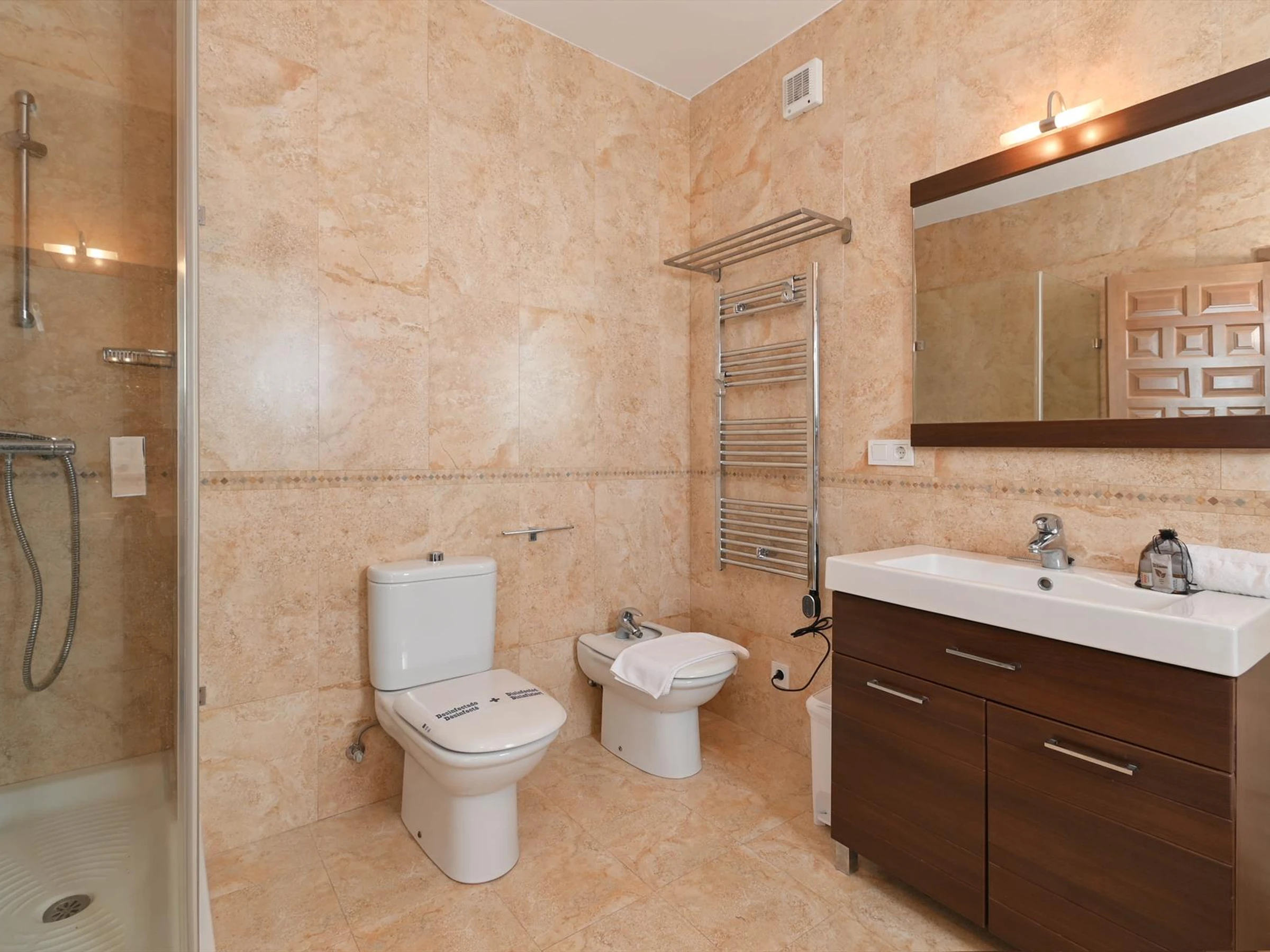 * en-suite bathroom with single washbasin, shower, bidet and toilet