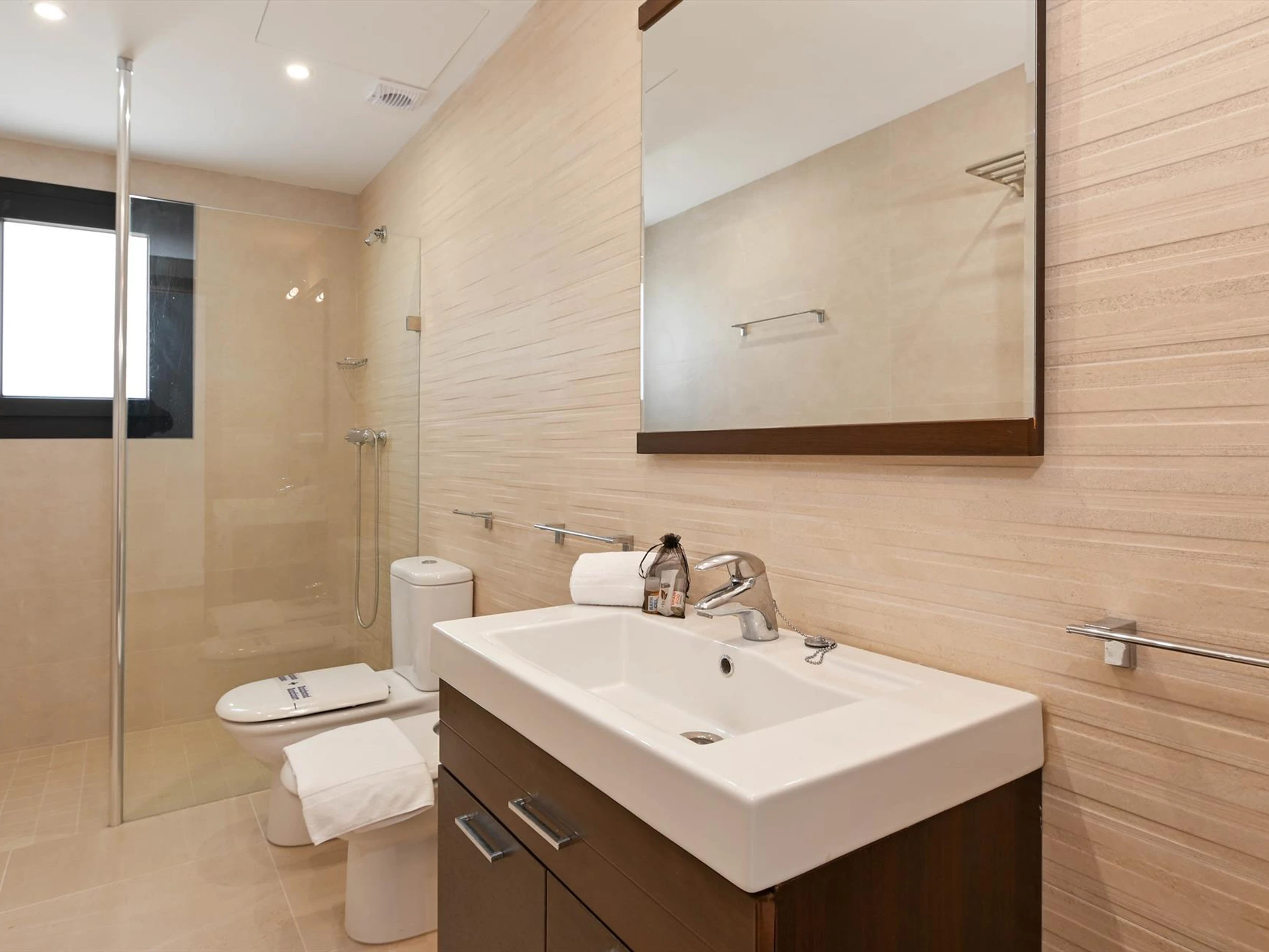 * bathroom with single washbasin, shower and toilet Exterior of the villa