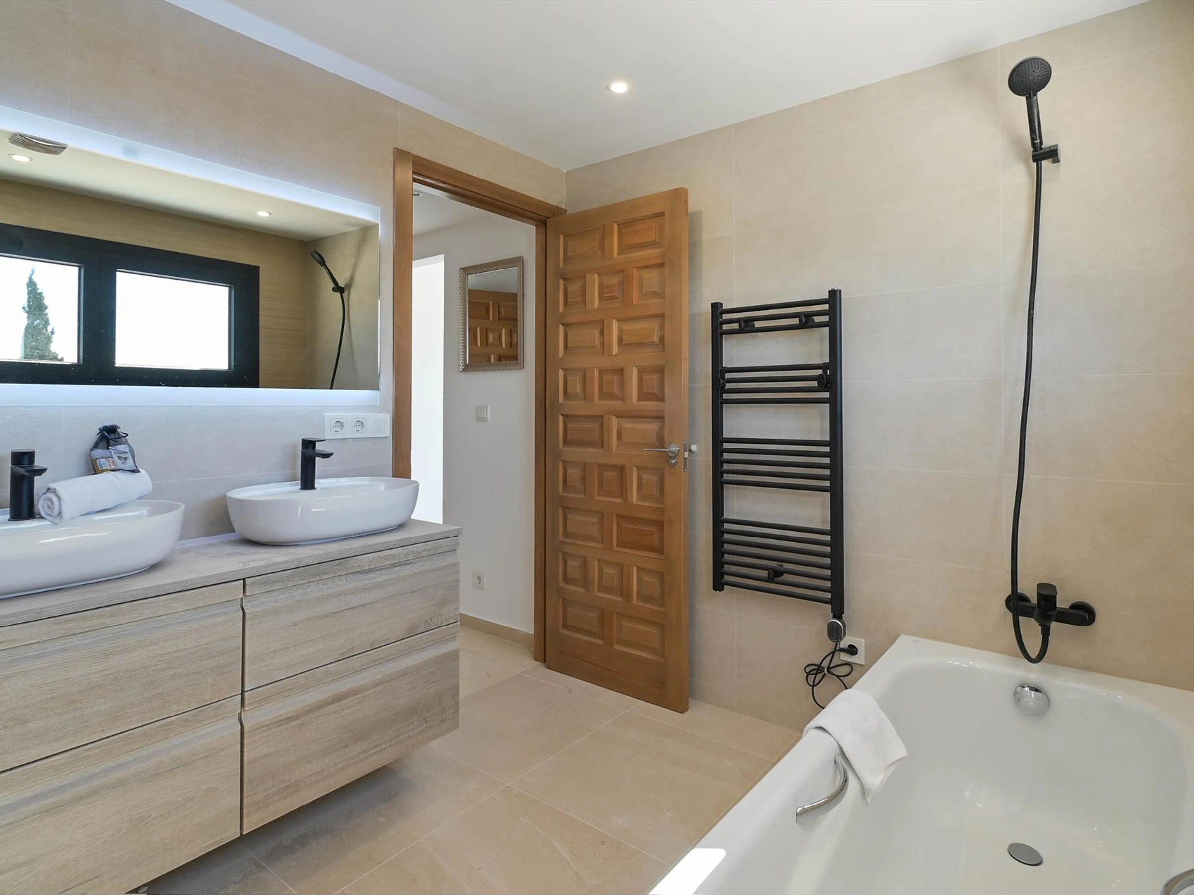 * en-suite bathroom with double washbasin, bath and toilet