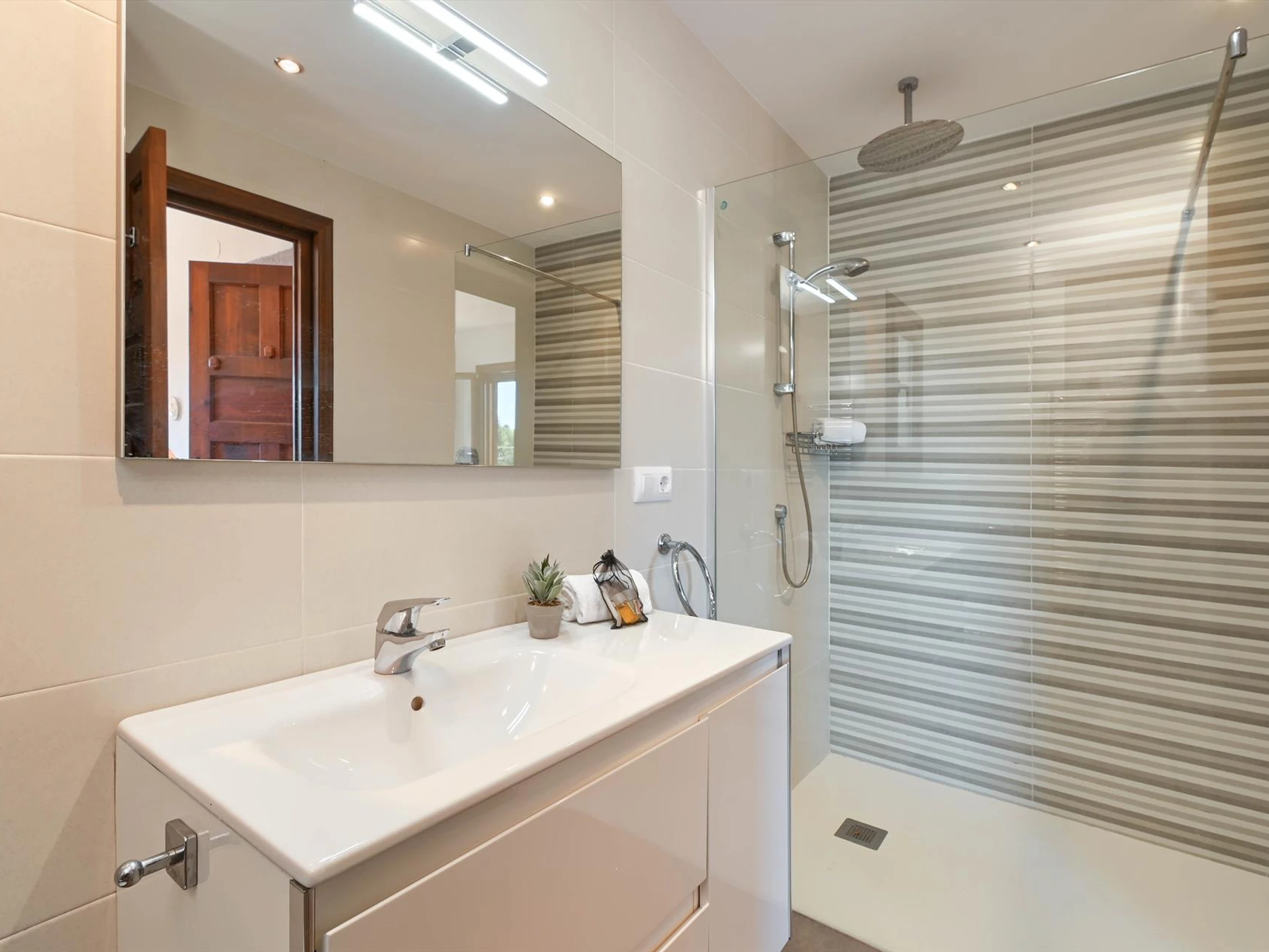 * bathroom with single washbasin, shower and toilet Exterior of the villa