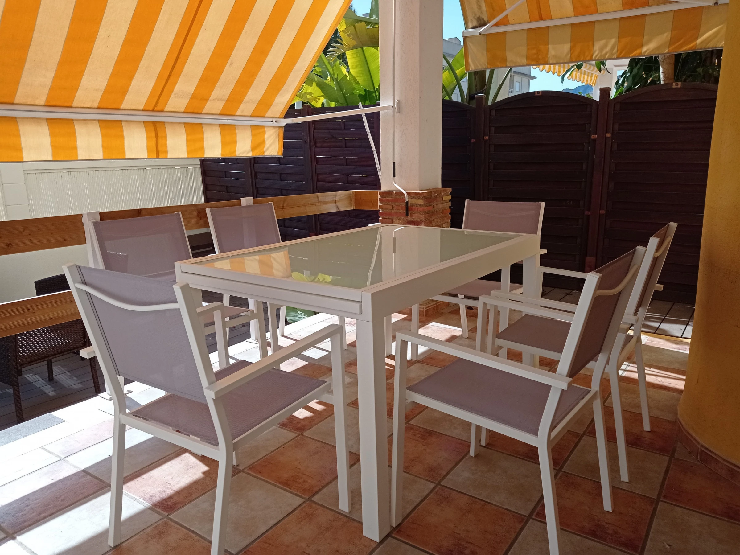 The apartment has a south-facing terrace with awnings. It has two double bedrooms, both with ceiling fans, one full bathroom, living-dining room, kitchen and laundry gallery with access to a private 20 m2 patio with barbecue and stone table/chairs. Additionally, next to the terrace with access from the living-dining room, there is a second chill-out terrace with furniture, ideal for enjoying during the nights. NO PETS ALLOWED. Capacity 4 people.