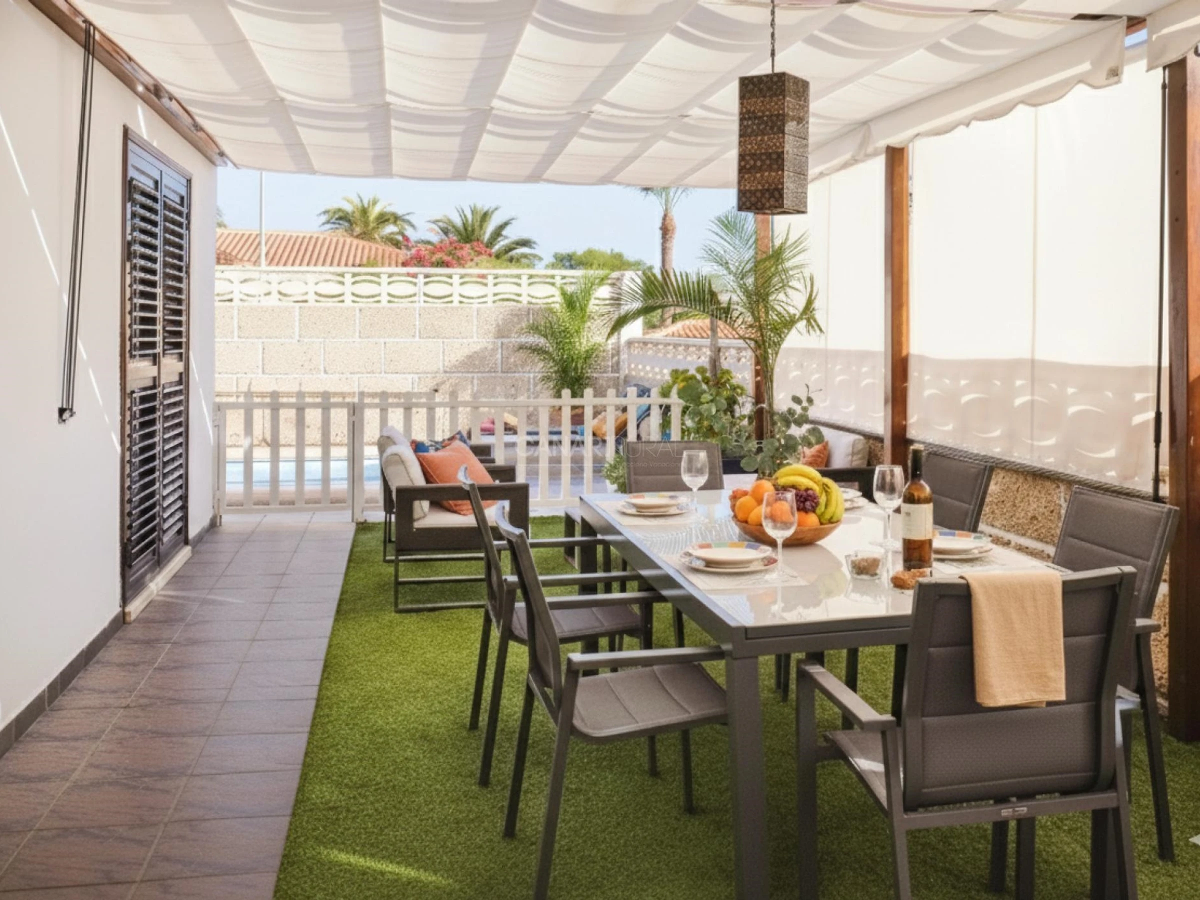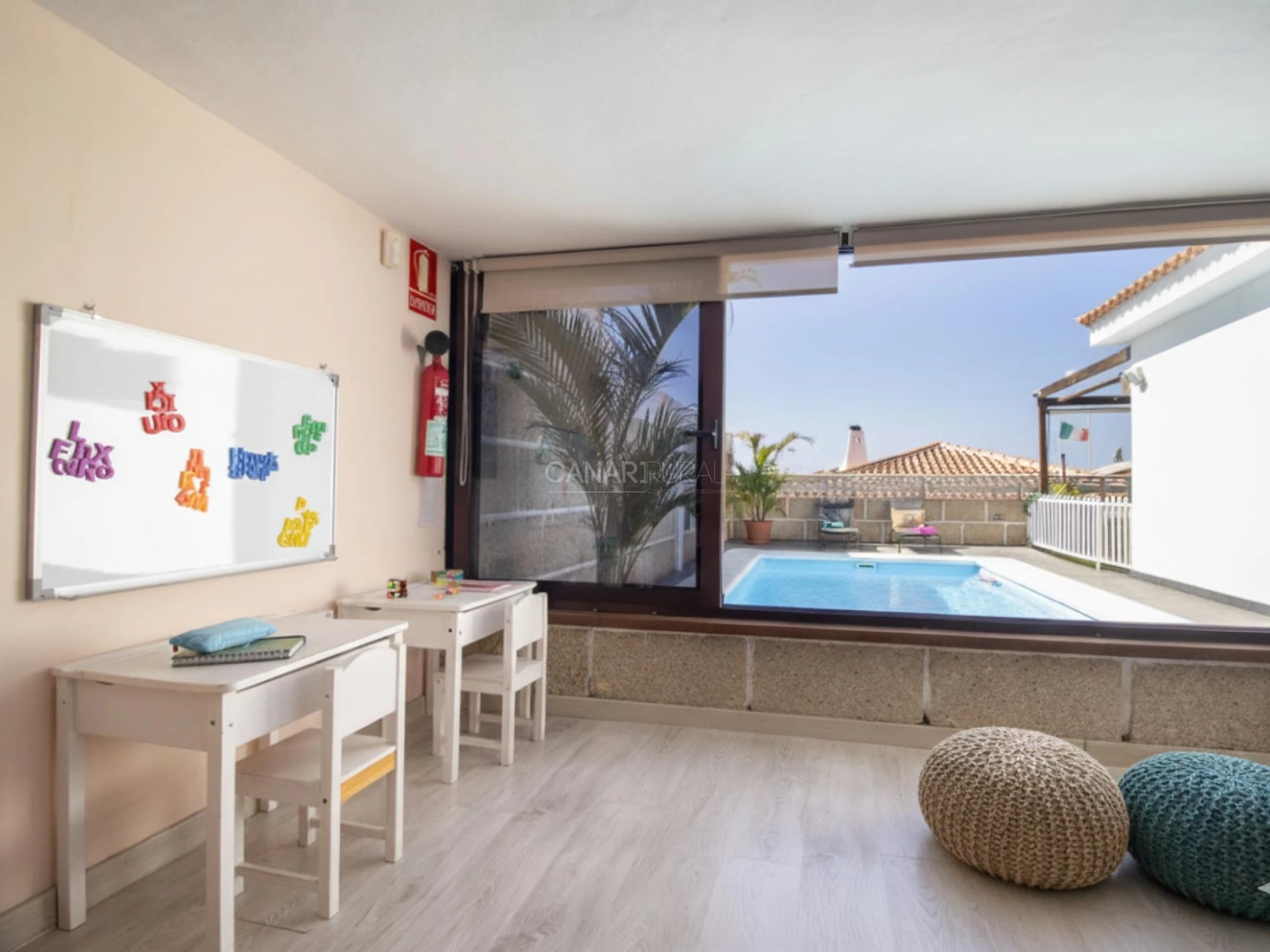 - Espacio exterior cerrado con ventanales ideal para usar como zona de trabajo o ideal para nómadas digitales que quieren combinar el ocio con el trabajo o trabajar pudiendo observar como los niños juegan en la piscina.