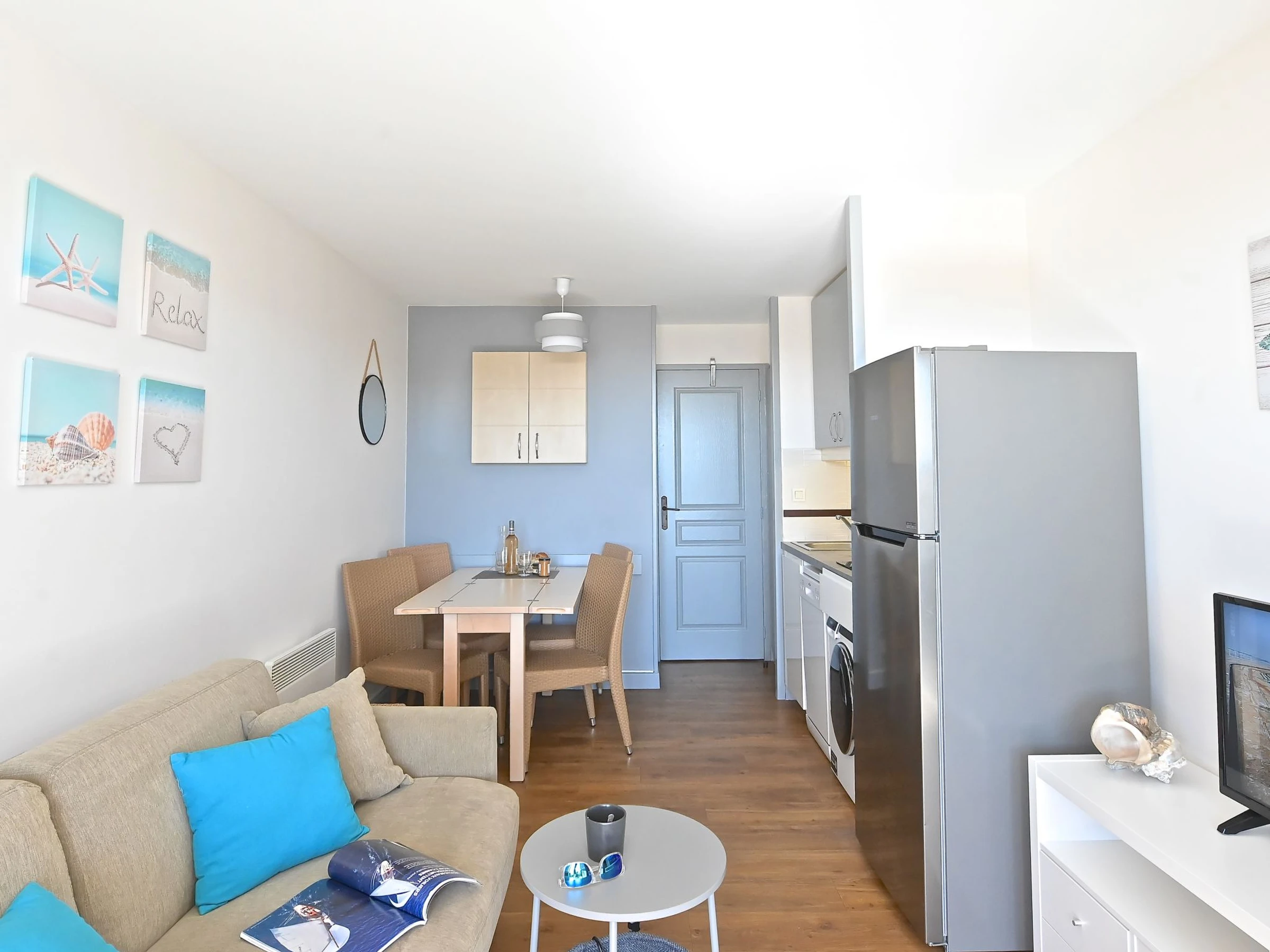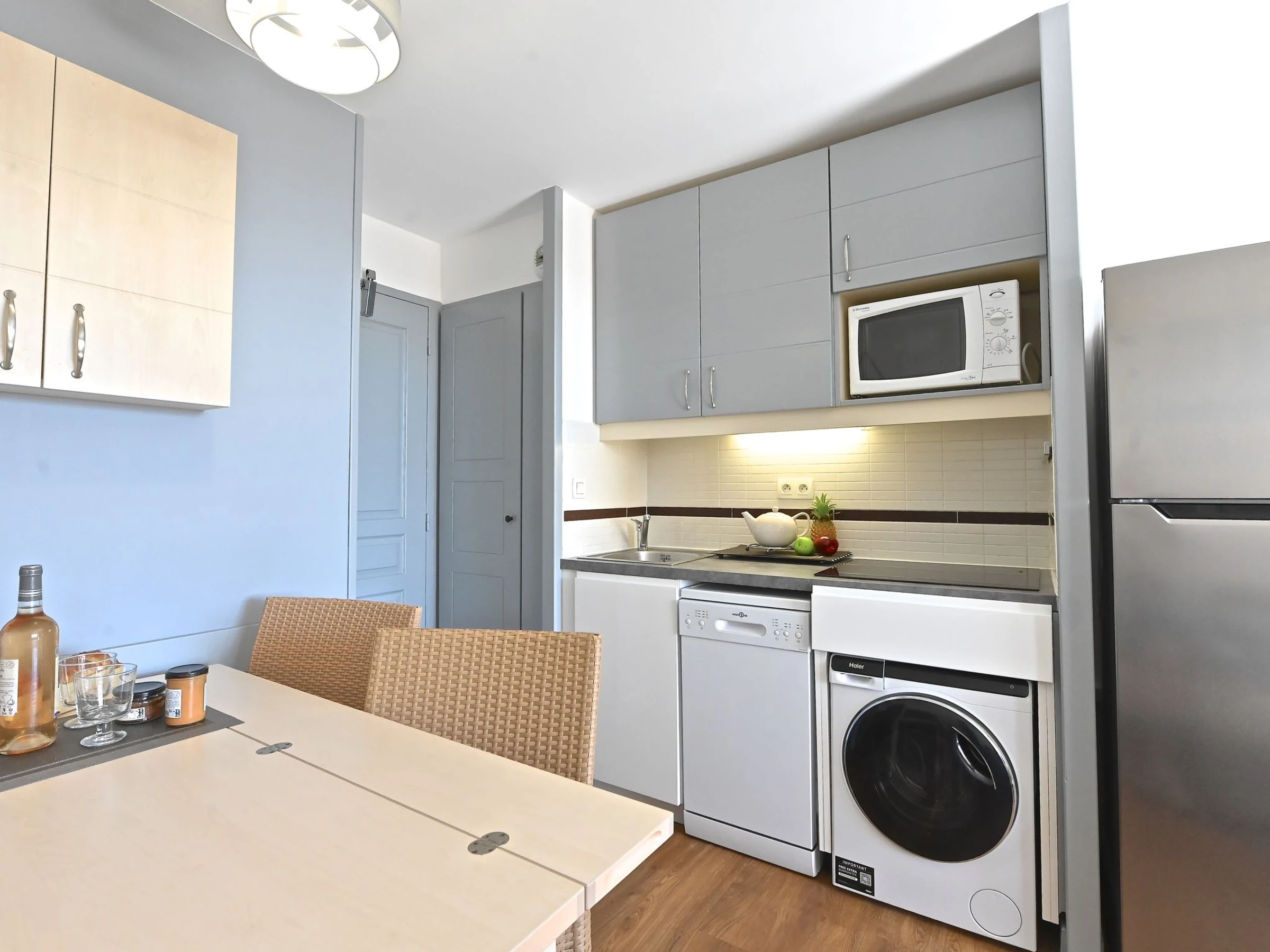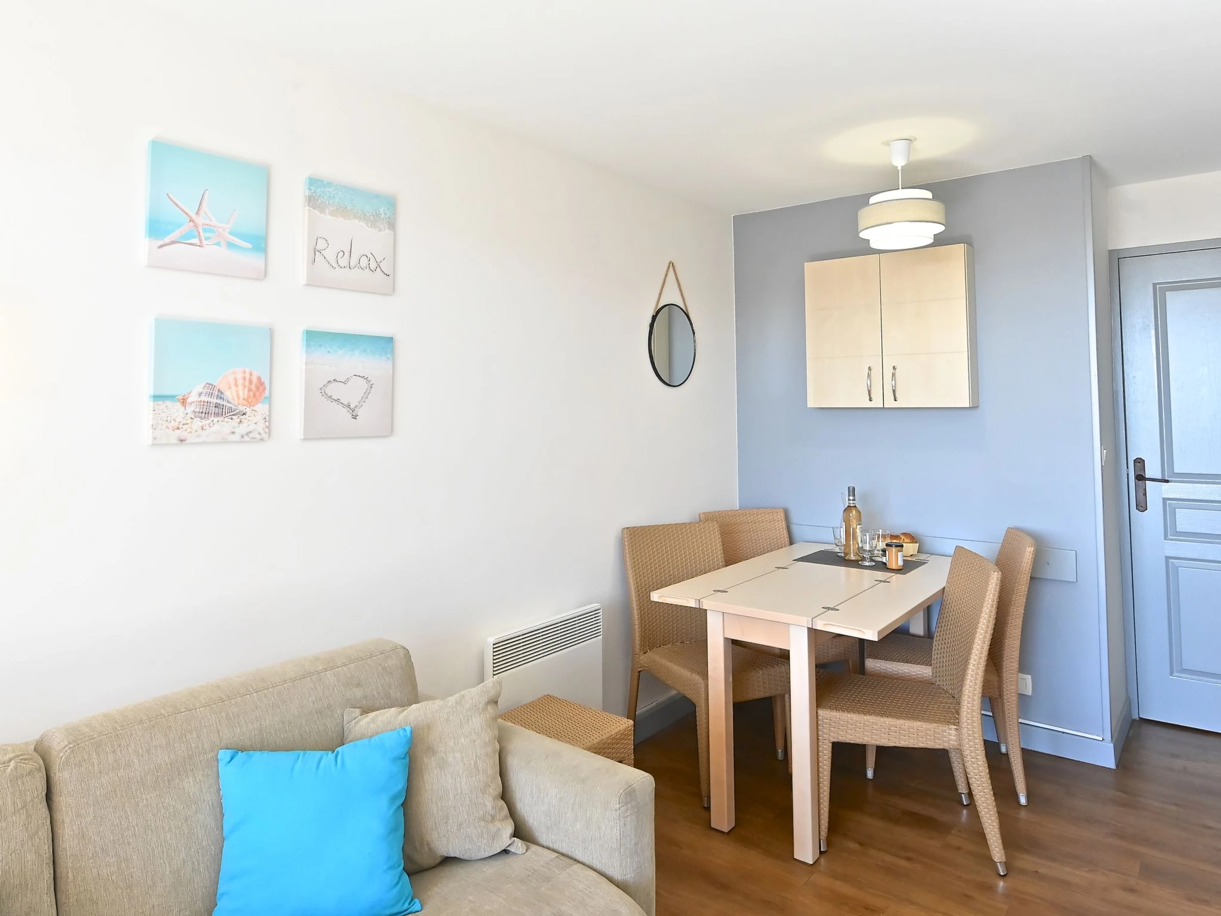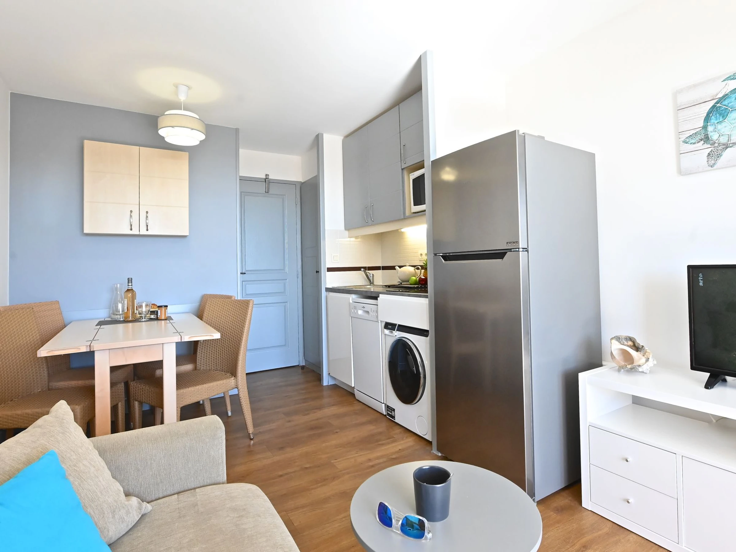 "L'Esquinade (G2 115)" estudio 23 m2 en el 1° piso. Vivienda adecuada para 2 adultos + 2 niños. Luminoso, completamente reformado en 2025, con mobiliario confortable: salón con 1 sofá-cama doble (1 x 140 cm, 190 cm de longitud), TV (pantalla plana), aire acondicionado. Salida a la terraza. Cabina con 1 x 2 literas (90 cm, 190 cm de longitud). Rincón-cocina (lavavajillas, 4 placas de vitrocerámica, tostadora, hervidor de agua eléctrico, microondas, congelador, cafetera eléctrica, Cápsulas de café (Dolce Gusto) extra). Baño/WC. Calefacción eléctrica. Terraza 10 m2, cubierta, orientación sur. Muebles de terraza. Vista parcial al mar, a las montañas y Campo de golf. El alojamiento dispone de: lavadora. Internet (Wifi, extra). Plaza de aparcamiento (1 coche). A tener en cuenta: apartamento para no fumadores. Permitido máximo 1 mascota / perro. Detector de humo. Oferta de un particular según el art. 155, IV del CGI.