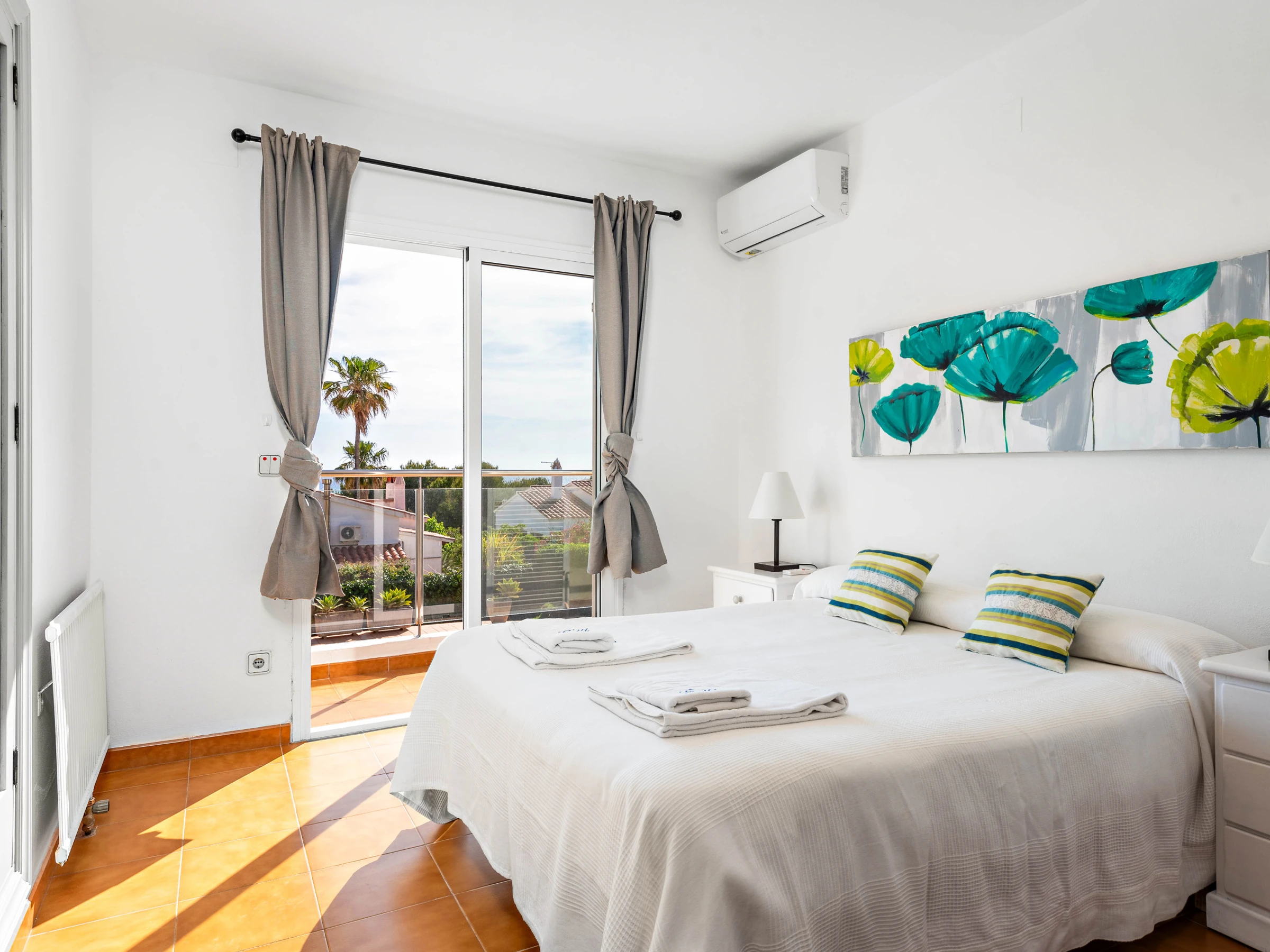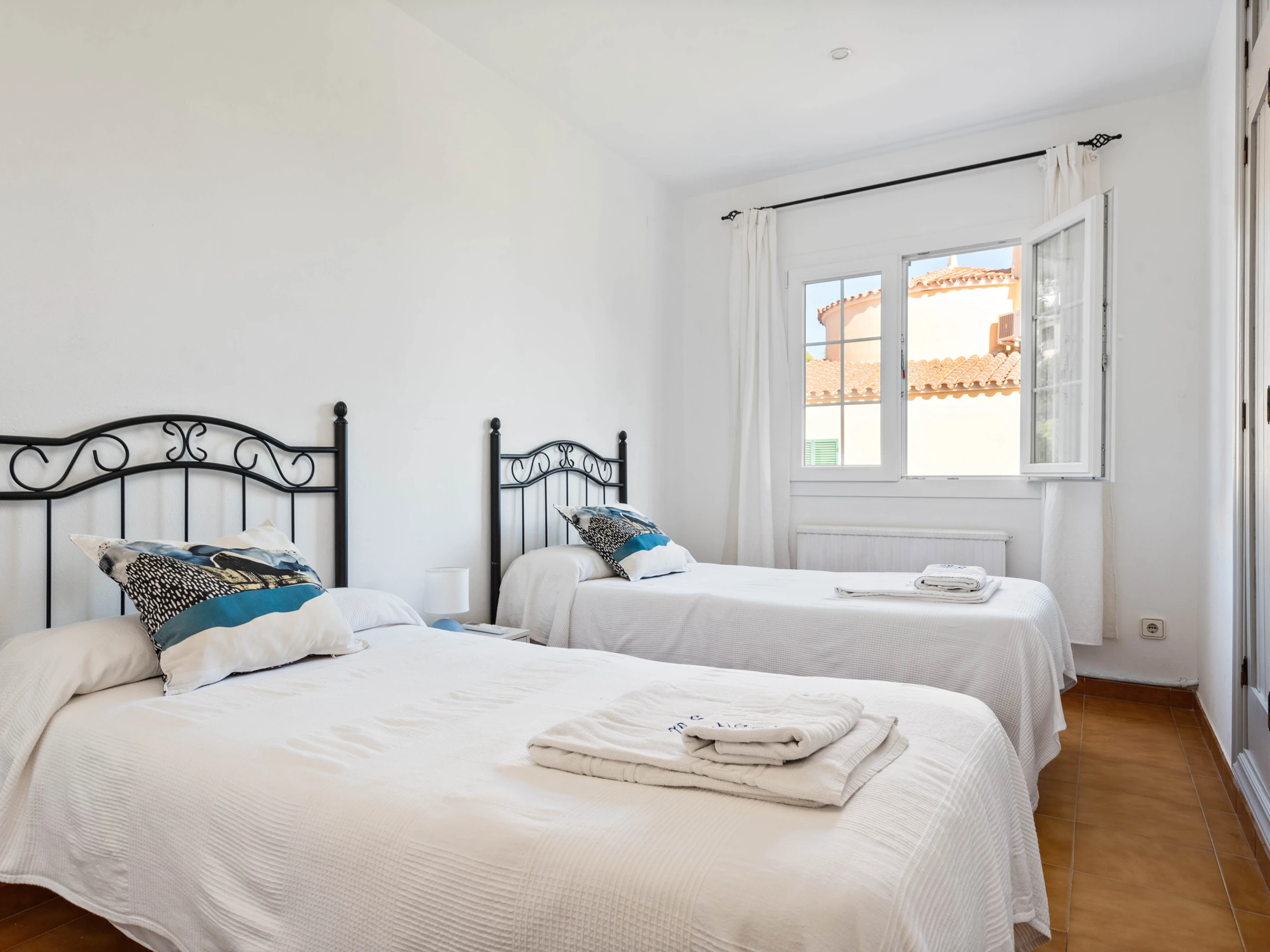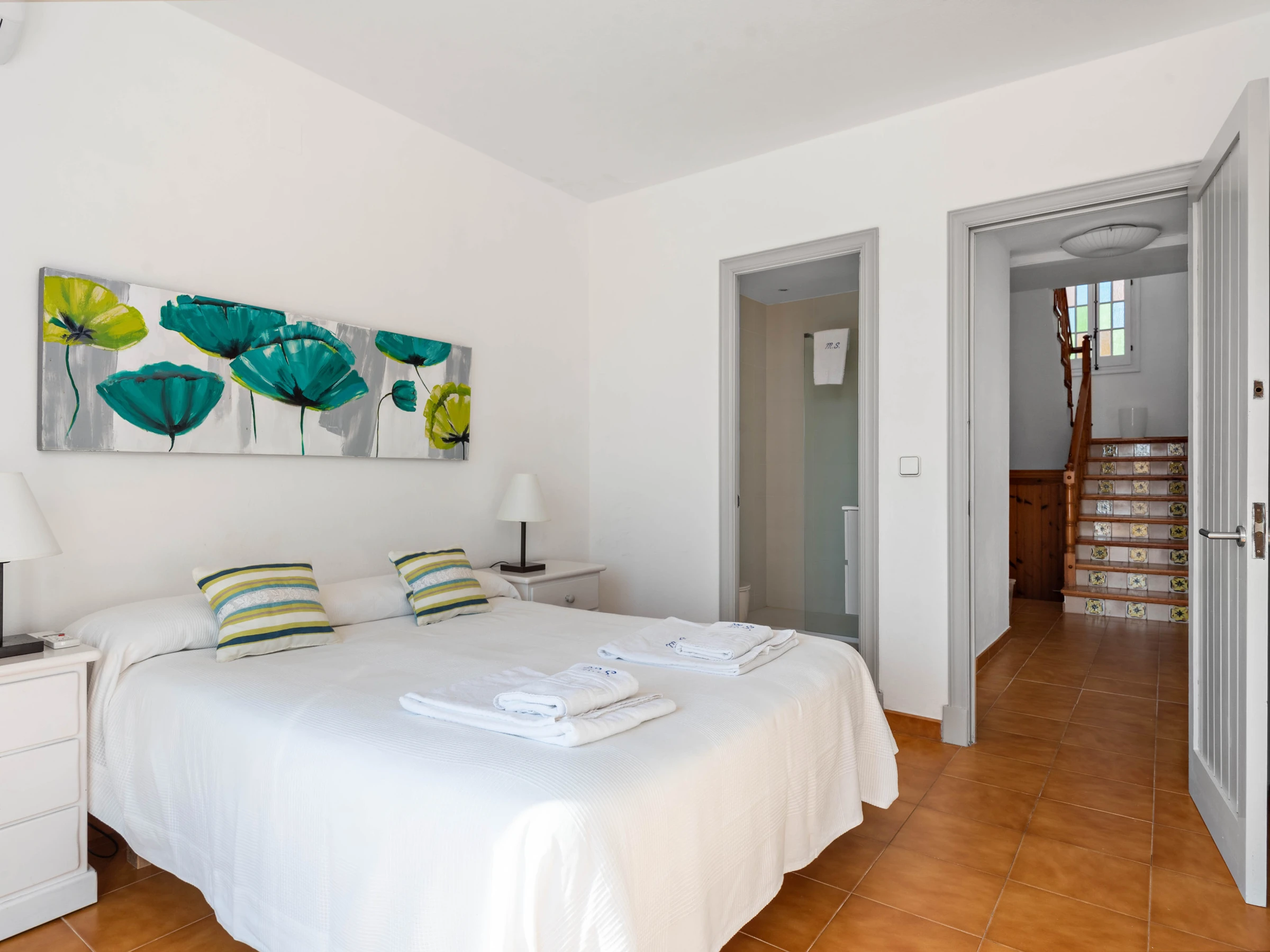 La villa cuenta con 5 dormitorios que pueden alojar cómodamente hasta 8 personas, con una distribución de 2 camas dobles y 5 camas individuales. Dispone de 4 cuartos de baño, incluyendo 1 con ducha, 2 con bañera y 1 aseo, lo que garantiza comodidad y privacidad para todos los huéspedes.