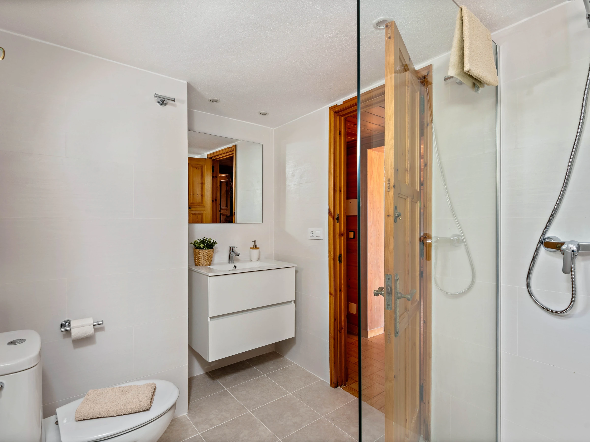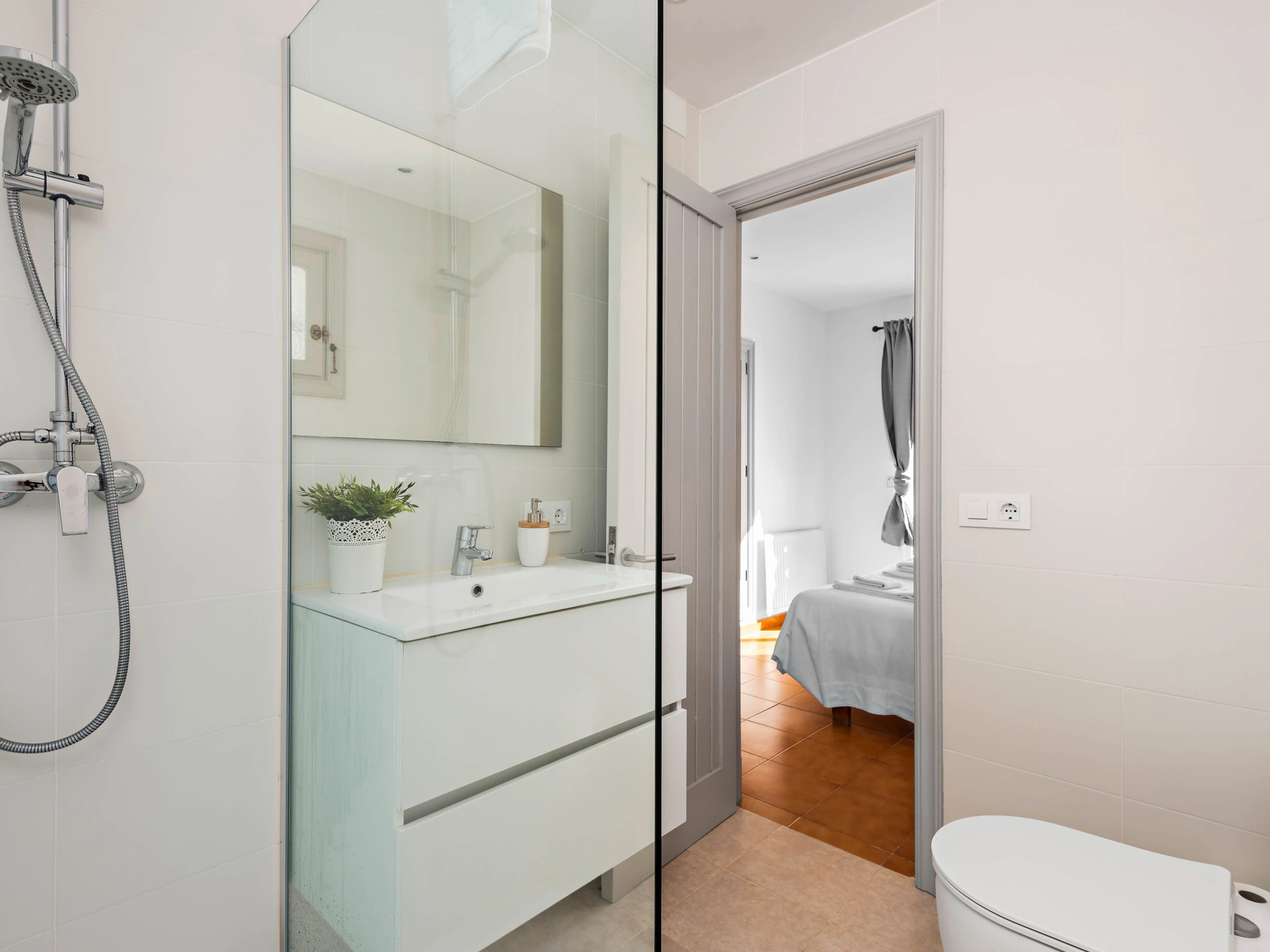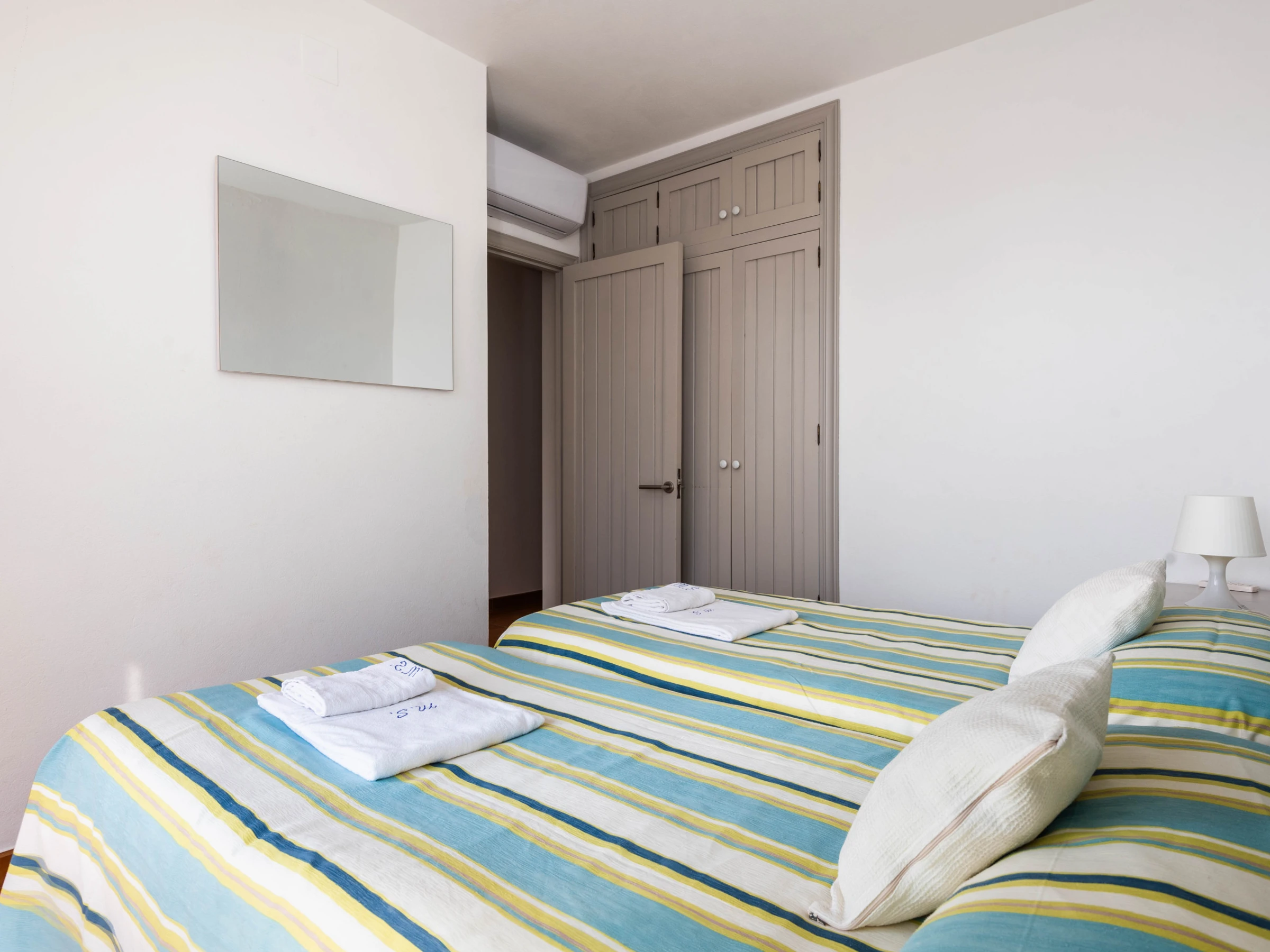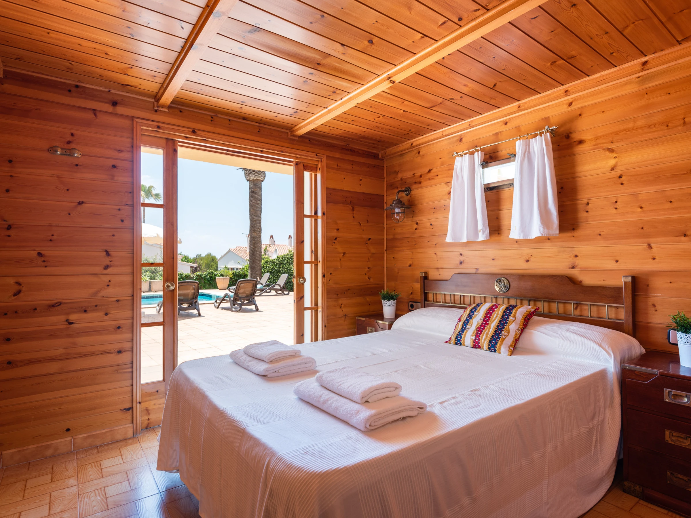 La villa cuenta con 5 dormitorios que pueden alojar cómodamente hasta 8 personas, con una distribución de 2 camas dobles y 5 camas individuales. Dispone de 4 cuartos de baño, incluyendo 1 con ducha, 2 con bañera y 1 aseo, lo que garantiza comodidad y privacidad para todos los huéspedes.