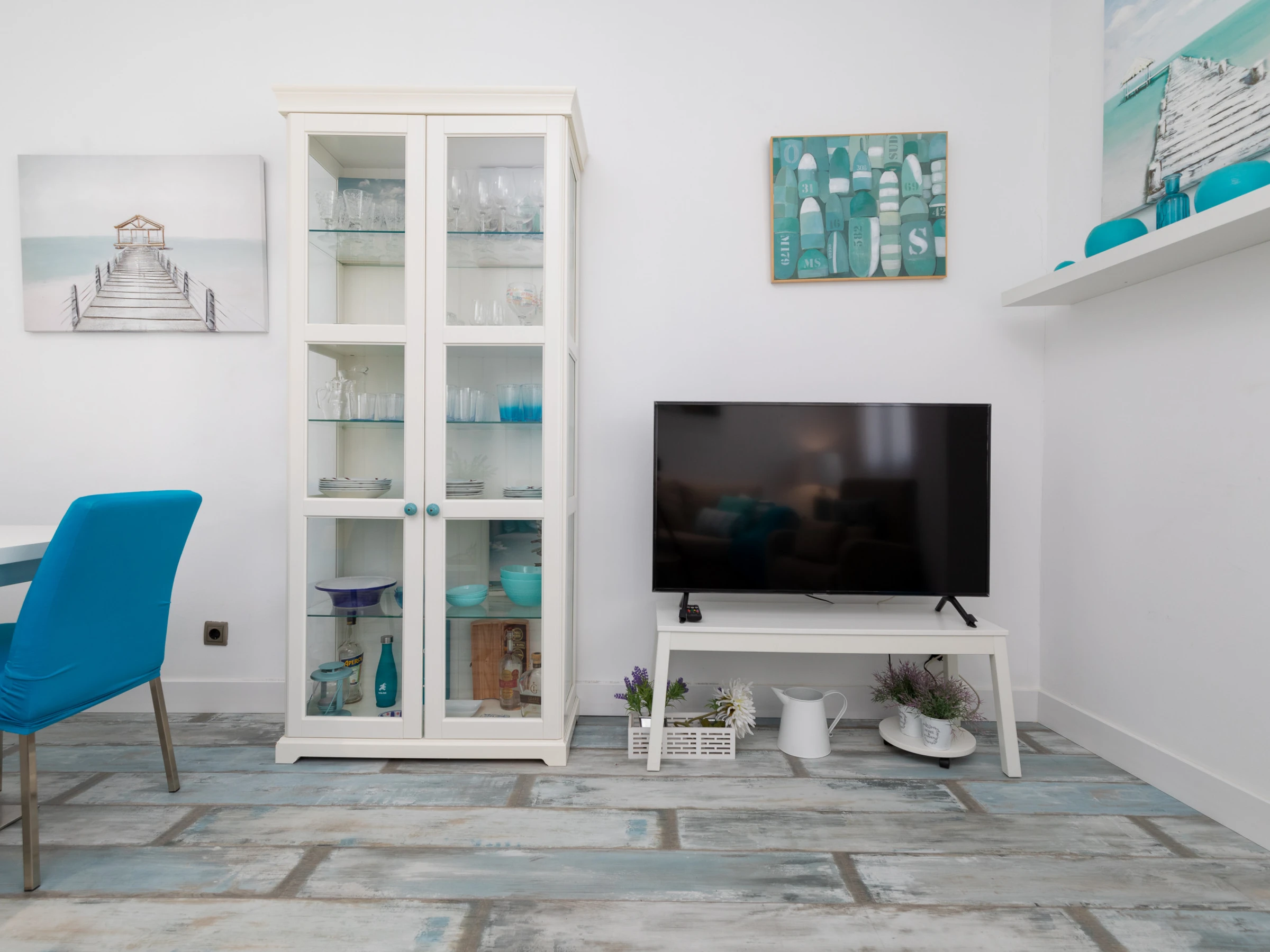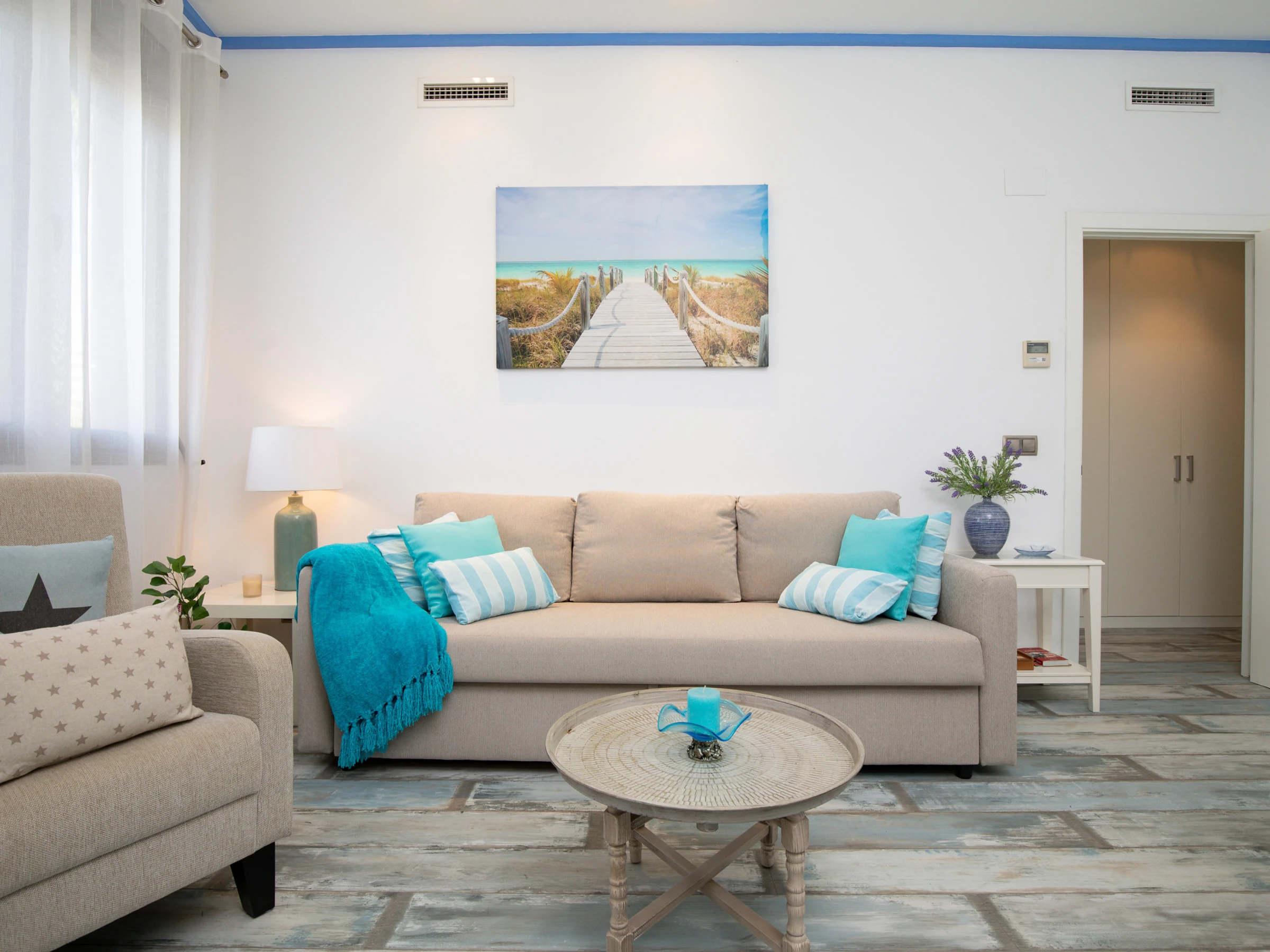 - Amplio salón con sofá cama abatible de matrimonio de 140x190 cm, mesa de comedor y TV HD.