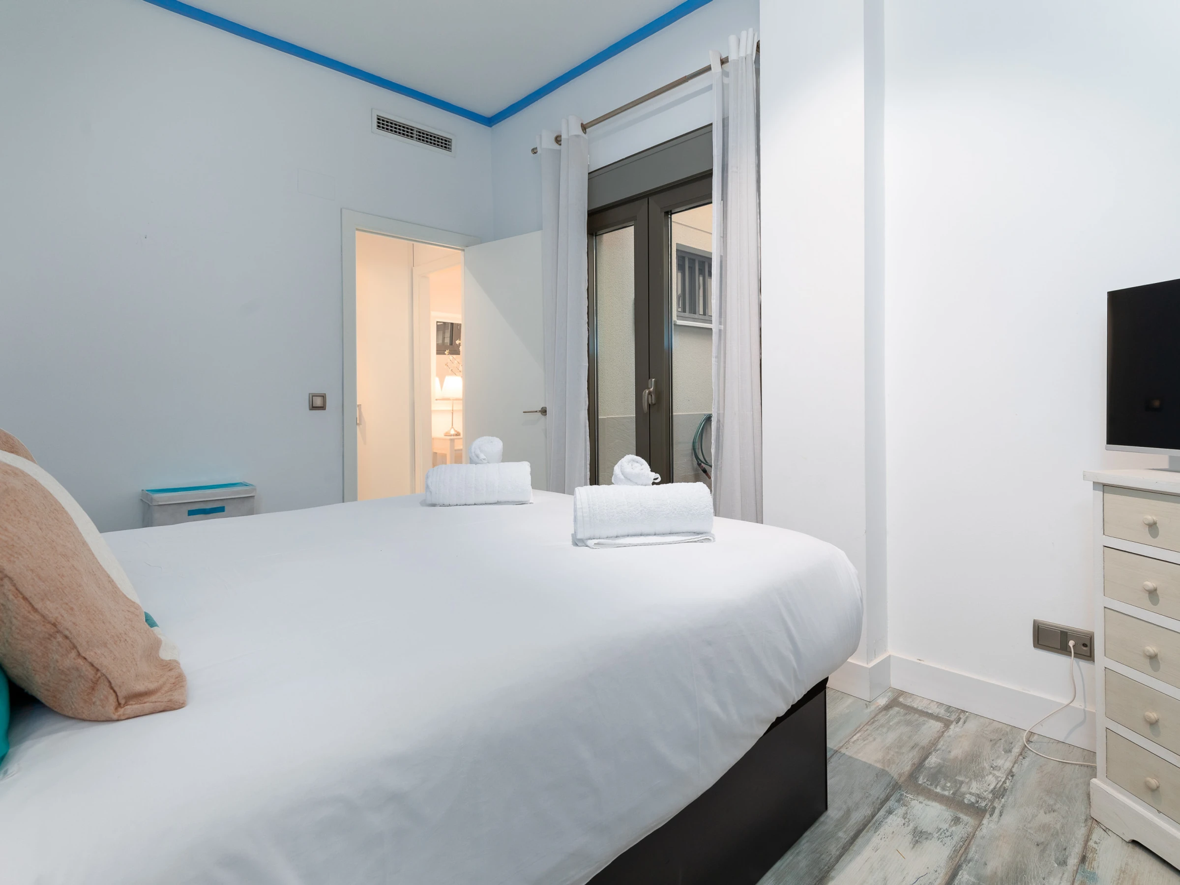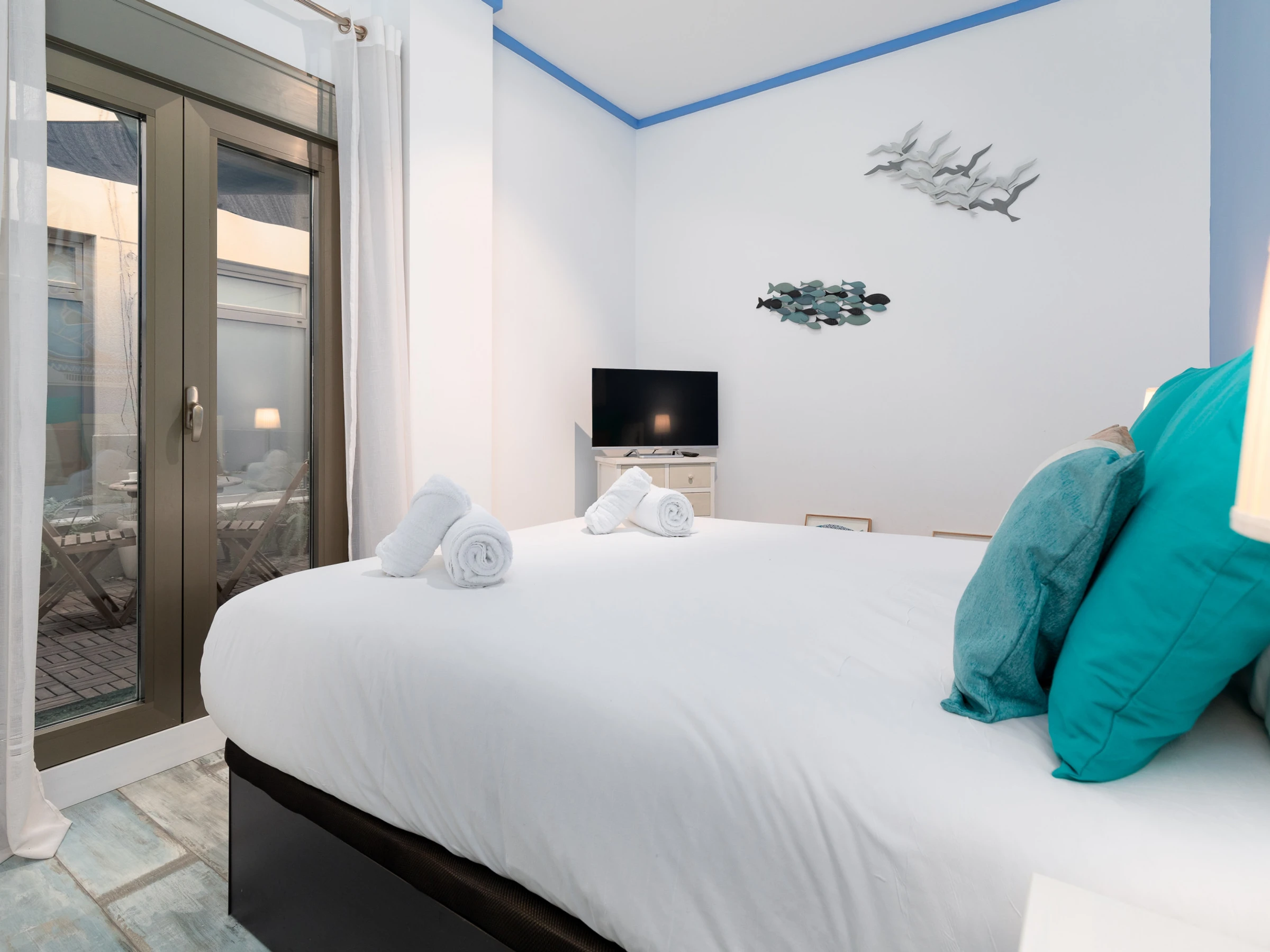 - Dormitorio principal con cama de matrimonio de 150x190 cm, TV y acceso a patio propio.