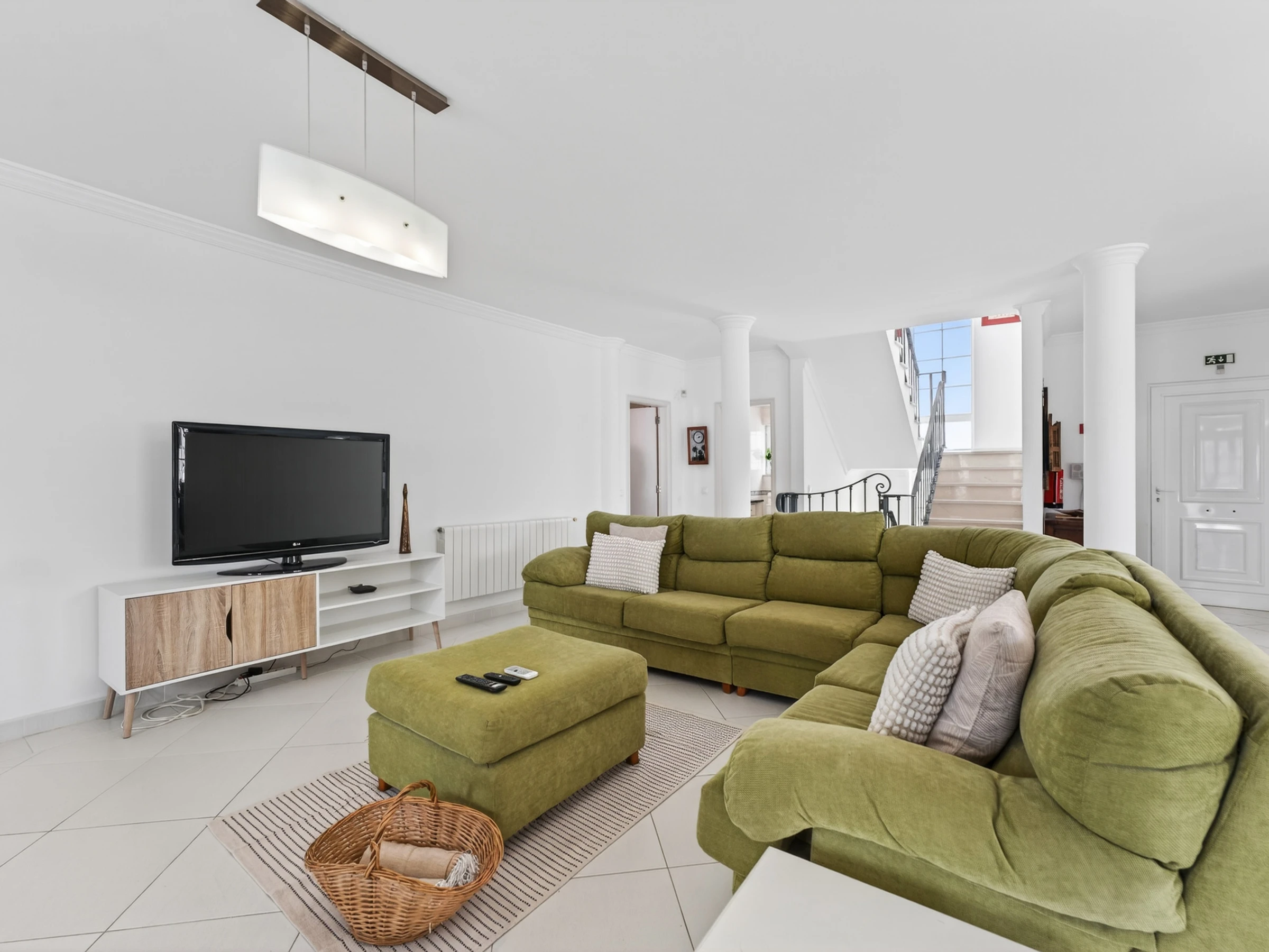 Entra en la planta baja a una sala de estar luminosa y espaciosa con sofá, TV, mesa de comedor, Wi-Fi, aire acondicionado y calefacción central, creando un lugar cómodo para relajarse después de días de exploración. La cocina de planta abierta está completamente equipada con lo que necesitas para comidas familiares ligeras o almuerzos tranquilos, y su distribución facilita cocinar sin desconectarse de la conversación en la sala de estar. Esta planta también incluye un baño de ducha comunitario y una habitación con cama de matrimonio y baño en suite con bañera, ideal para huéspedes que prefieren menos escaleras.