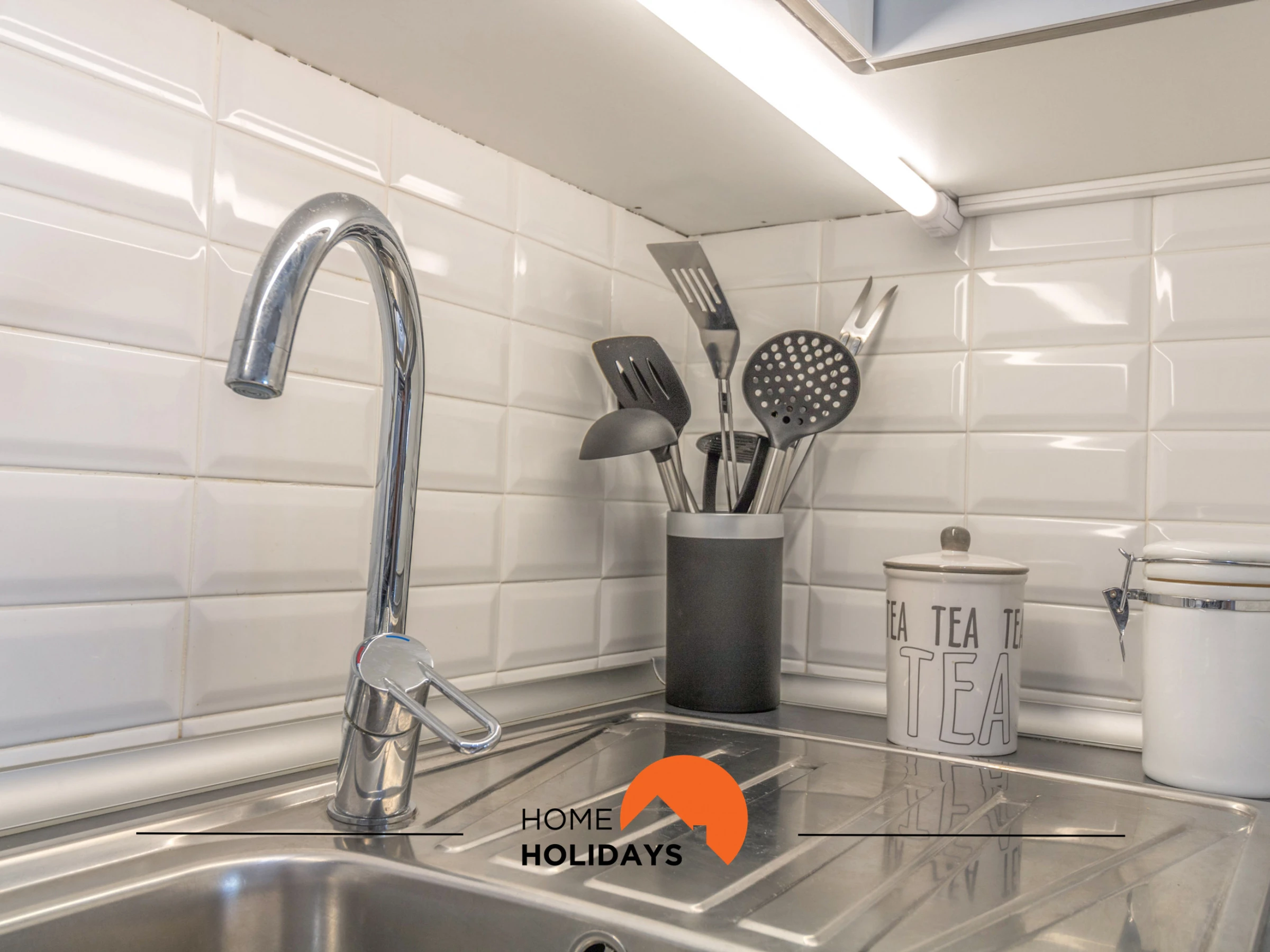 La cocina americana, eléctrica, está equipada con nevera, horno, congelador, cafetera, tostadora, hervidor de agua y fogones.