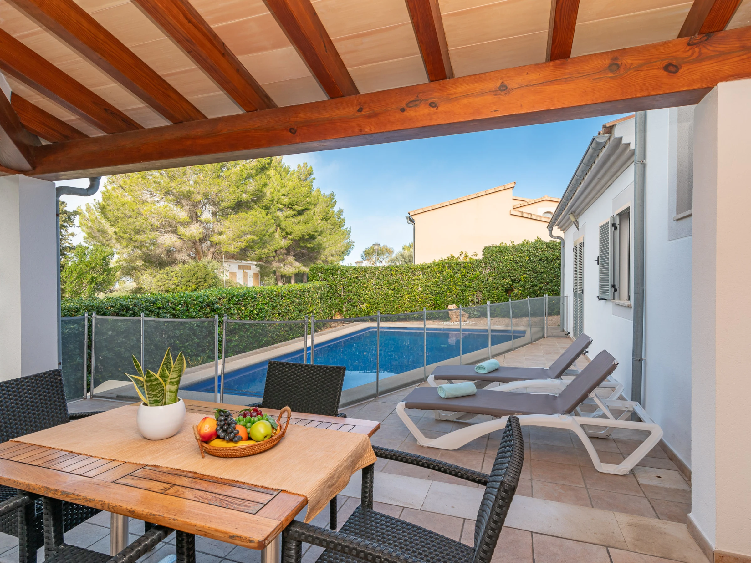 En el exterior, encontrarás una encantadora piscina privada, con la posibilidad de colocar barreras en caso de necesidad para los más pequeños, rodeada de terrazas, tanto abiertas como cubiertas, para que puedas disfrutar de un buen libro a la sombra mientras te relajas al aire libre.