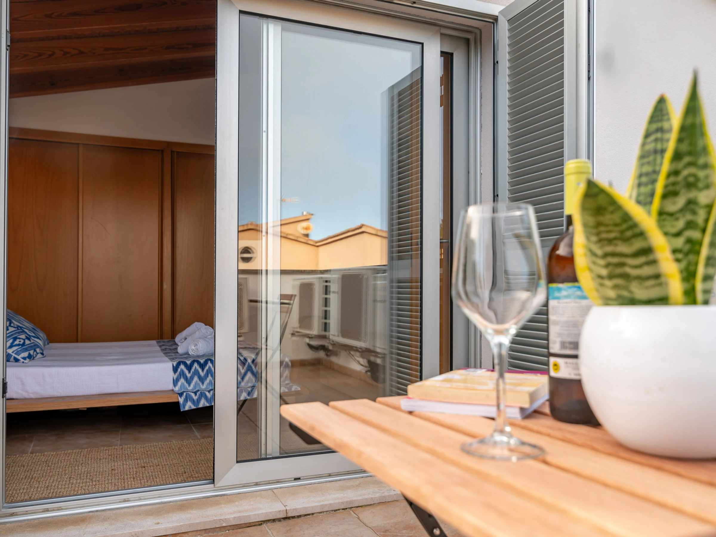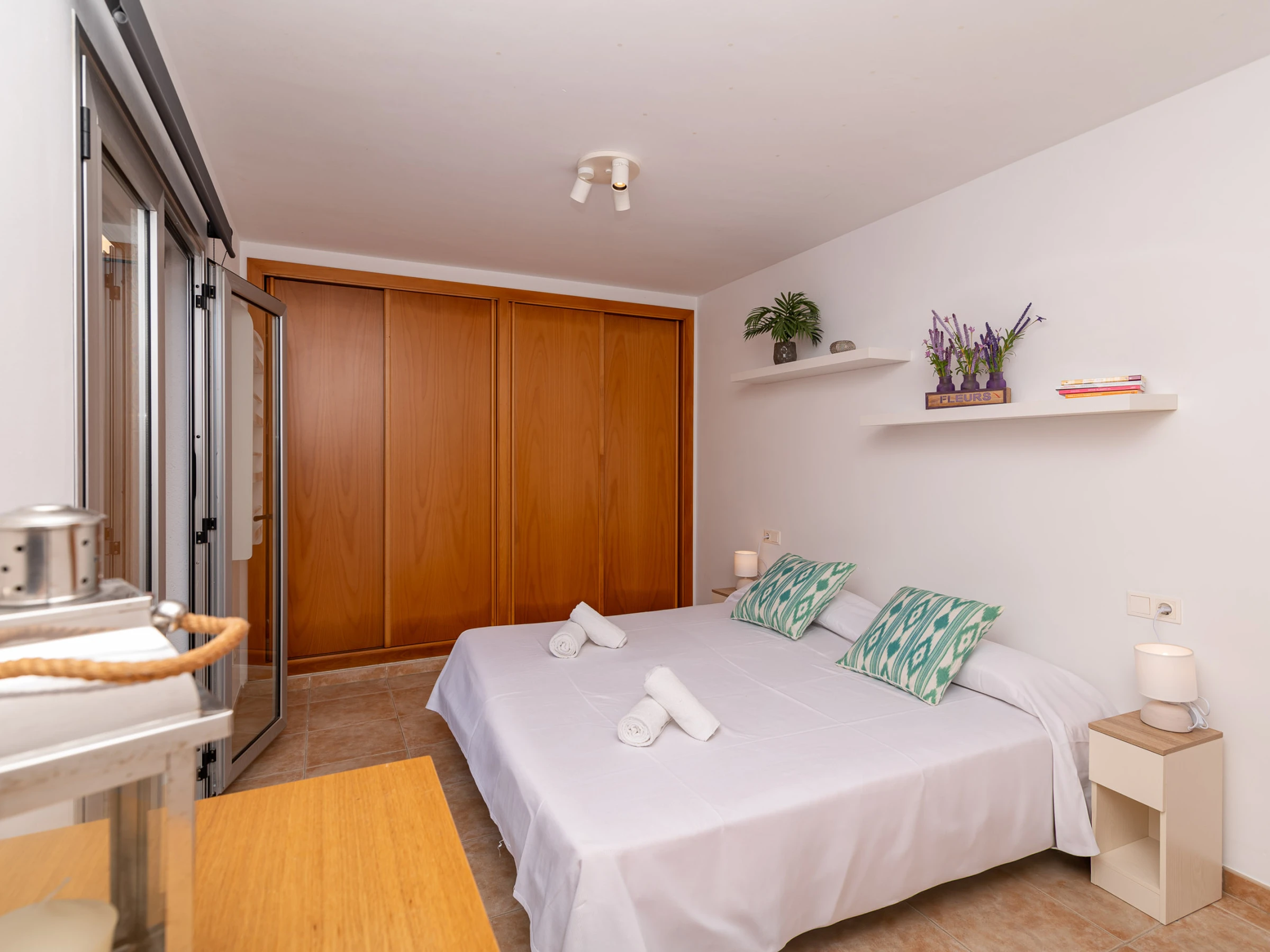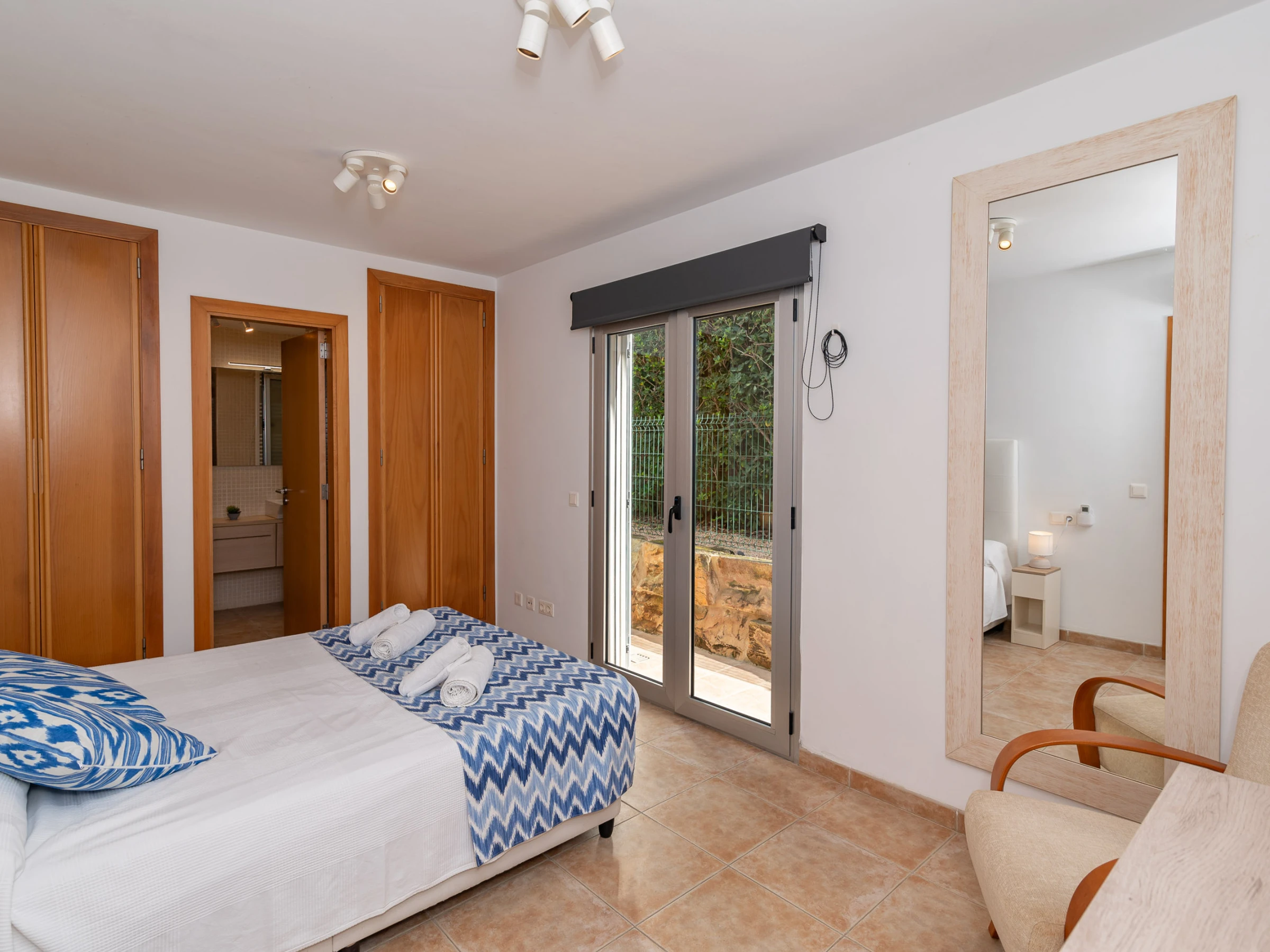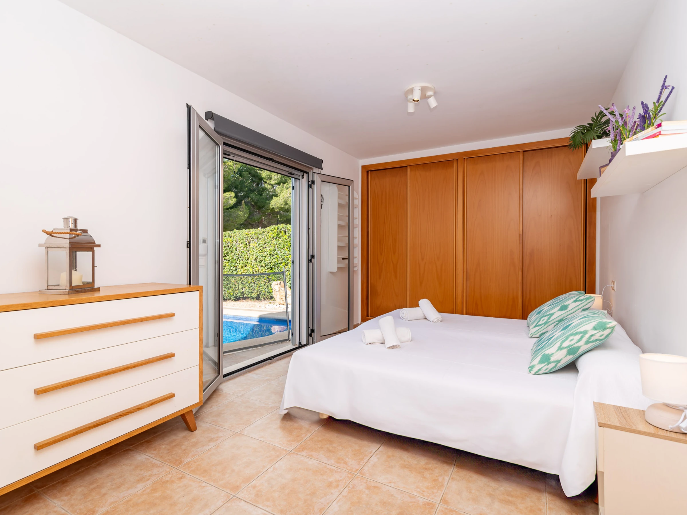 Subiendo a la primera planta, encontrarás un tercer dormitorio con cama doble, con un pequeño balcón que invita a relajarse y disfrutar de la naturaleza que rodea la villa.