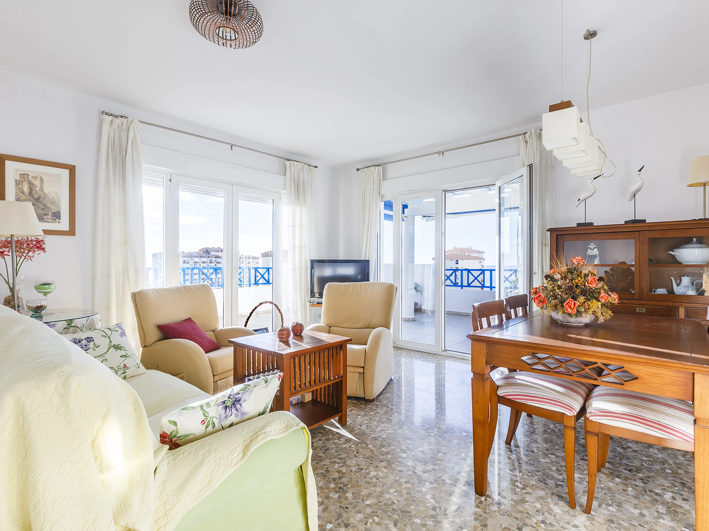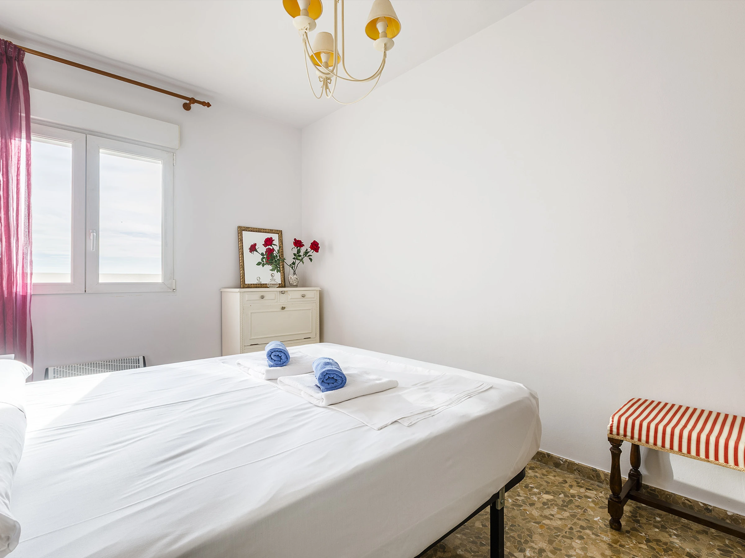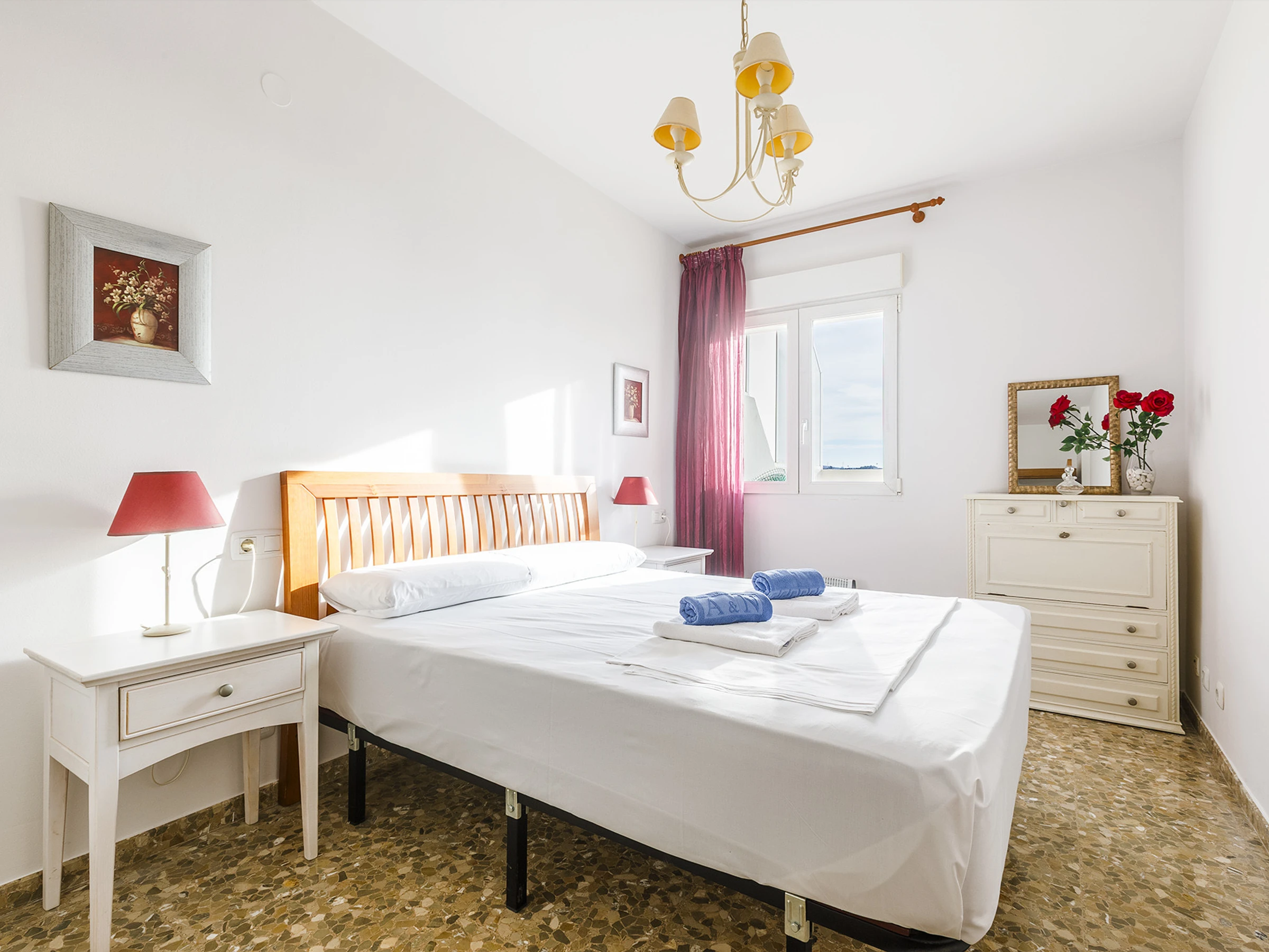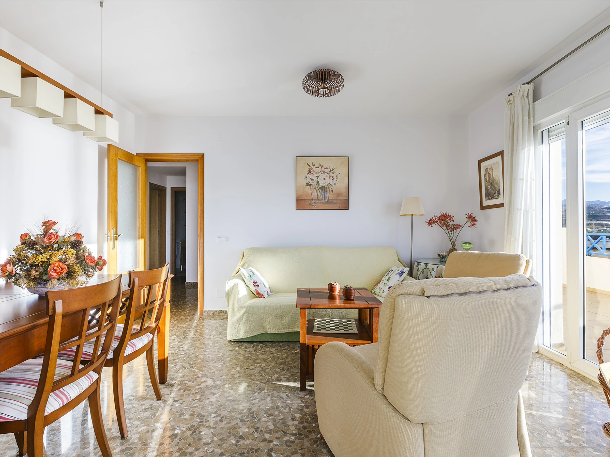 El apartamento dispone de 3 dormitorios (dos con cama doble y uno con cama individual), cocina independiente, baño con ducha y aseo adicional. Pero sin duda, su gran atractivo es la espectacular terraza en forma de L, con orientación sur-este y vistas panorámicas al mar y a la montaña. Un espacio ideal para desayunos al sol, tomar algo al atardecer o simplemente relajarse disfrutando de la brisa marina.