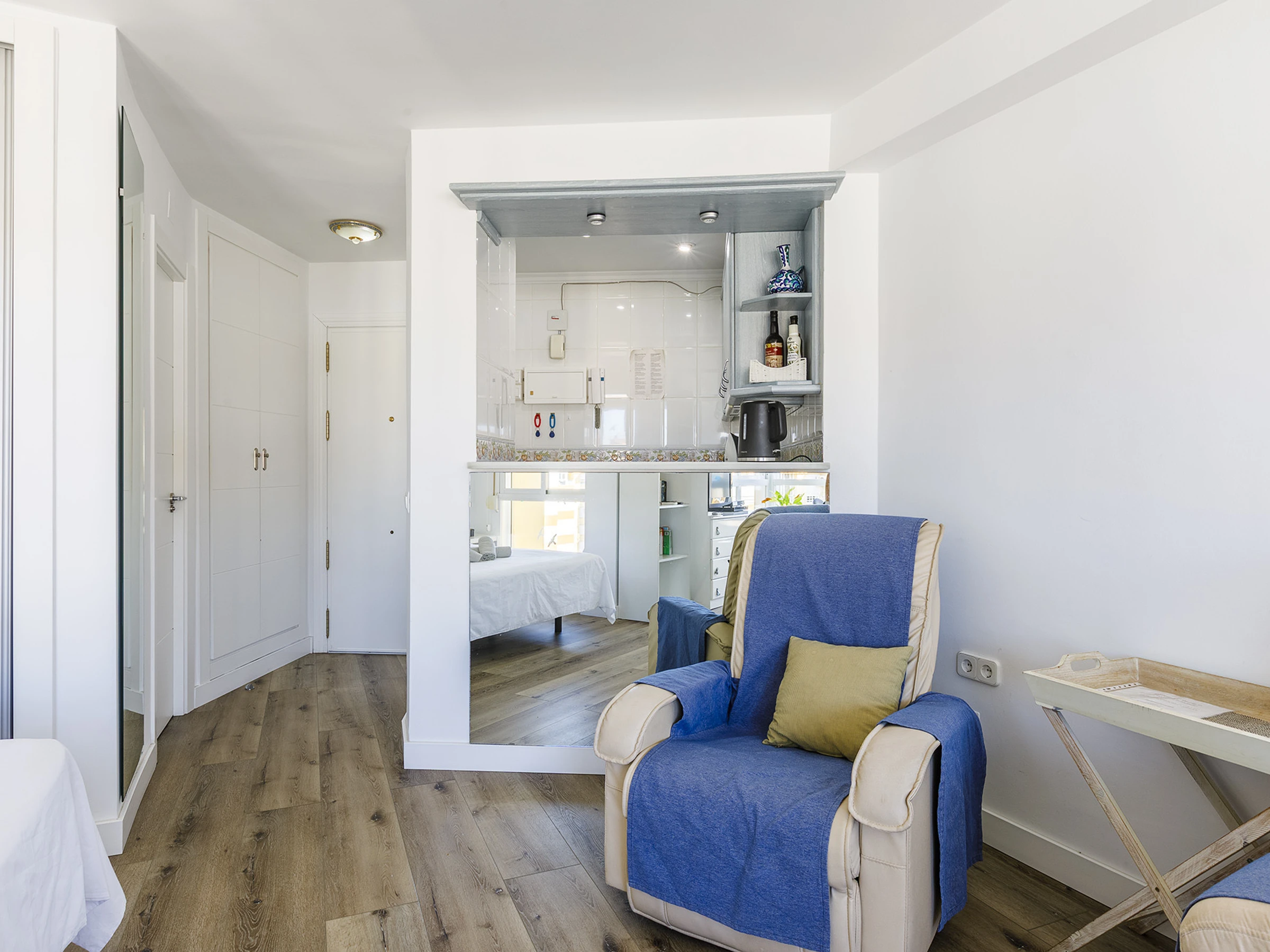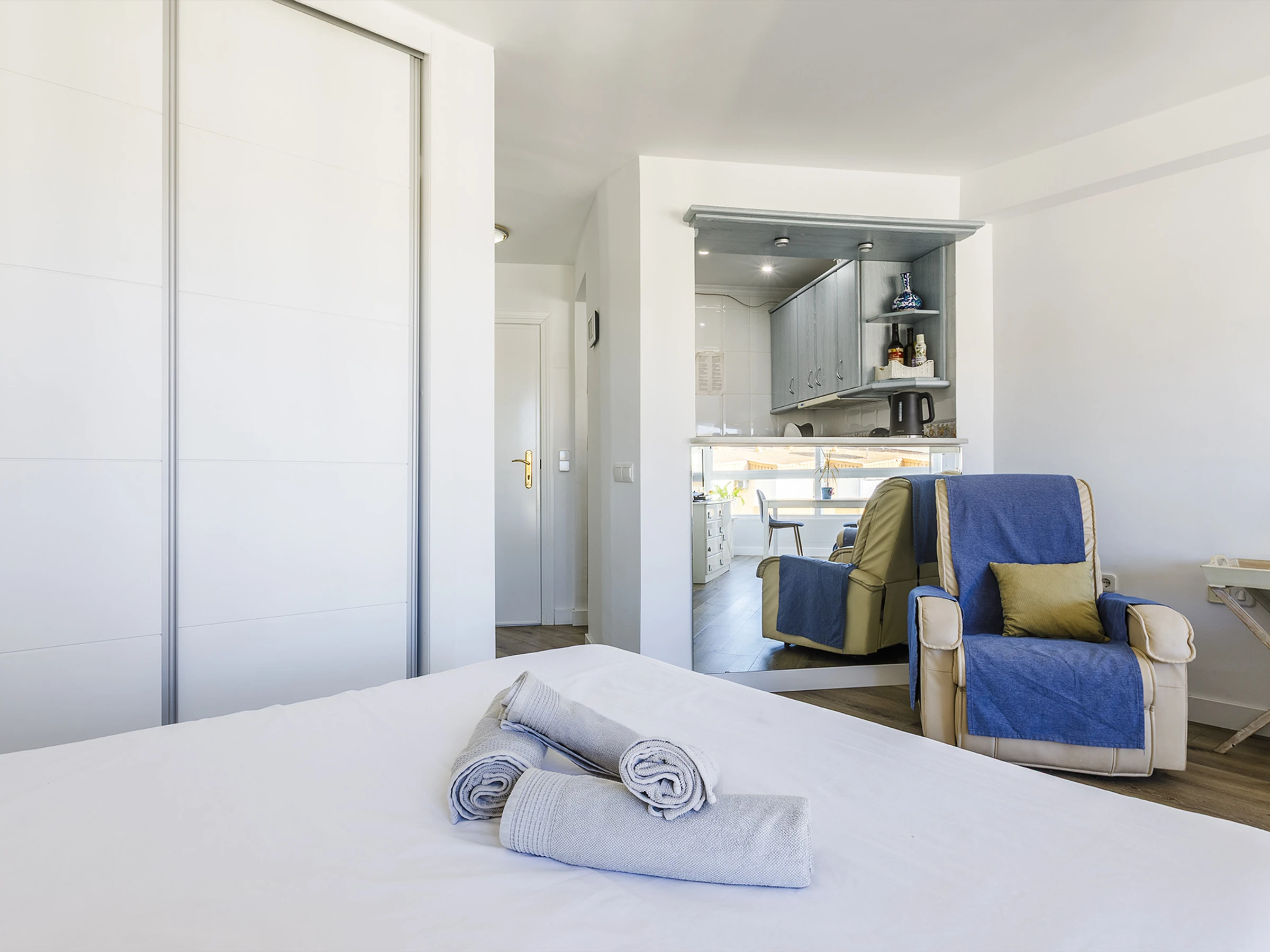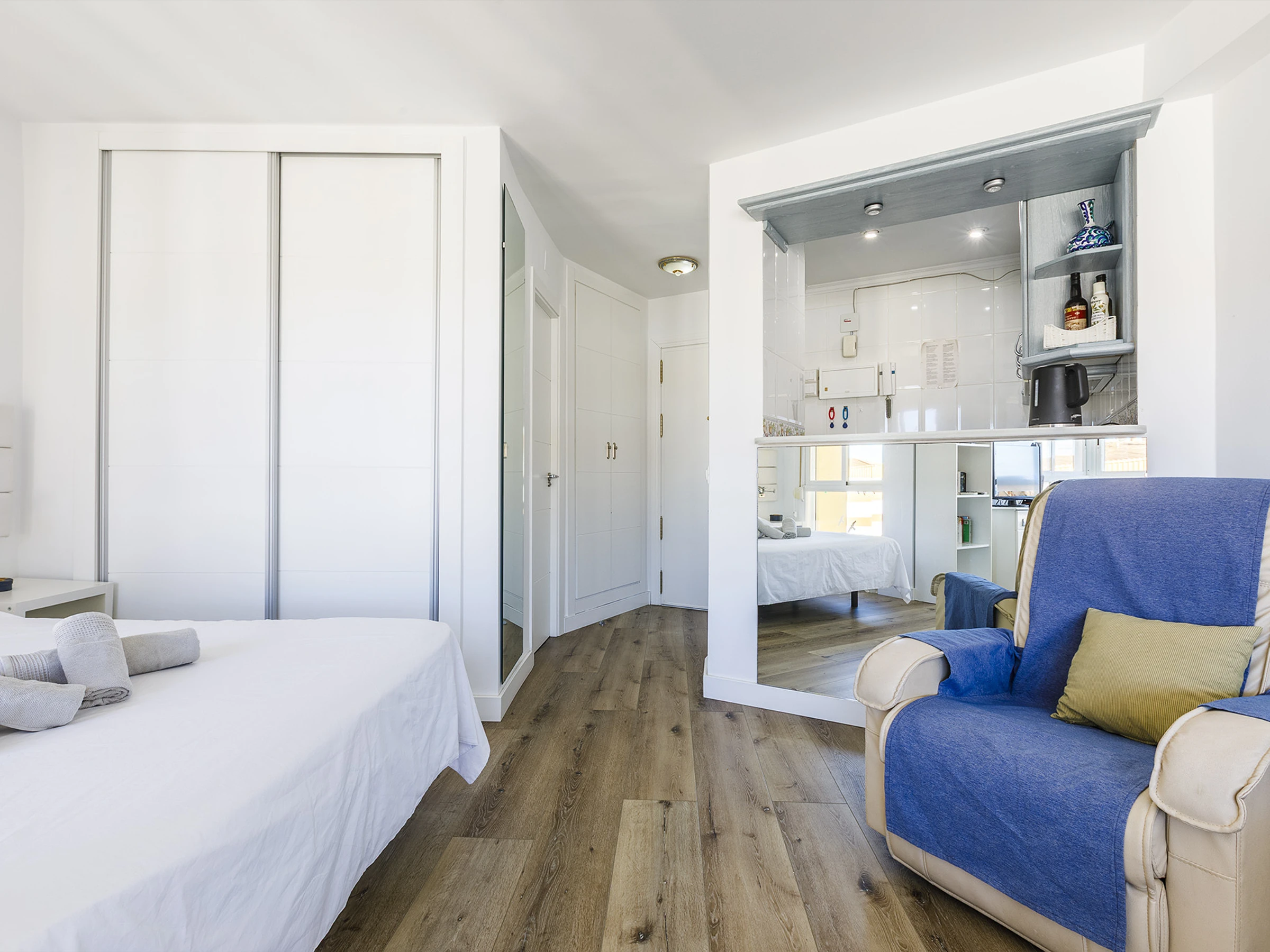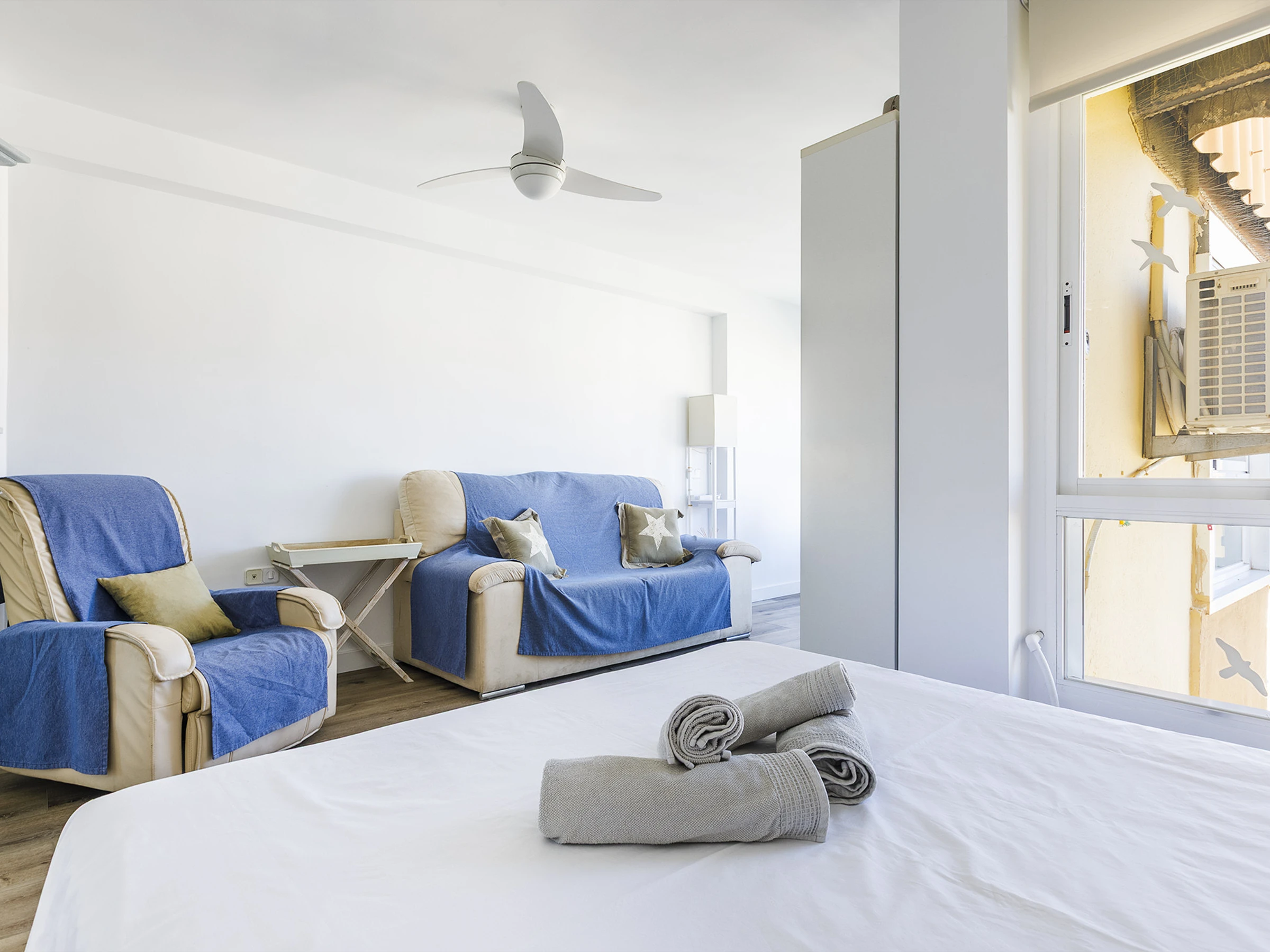 El estudio ofrece un espacio acogedor y cómodo, ideal para relajarte y desconectar. Cuenta con cama doble, aire acondicionado, cocina americana equipada y baño con ducha 🚿, pensado para que te sientas como en casa. La luz natural, sus vistas al mar 🌅 y su orientación oeste hacen que cada atardecer sea un momento único.