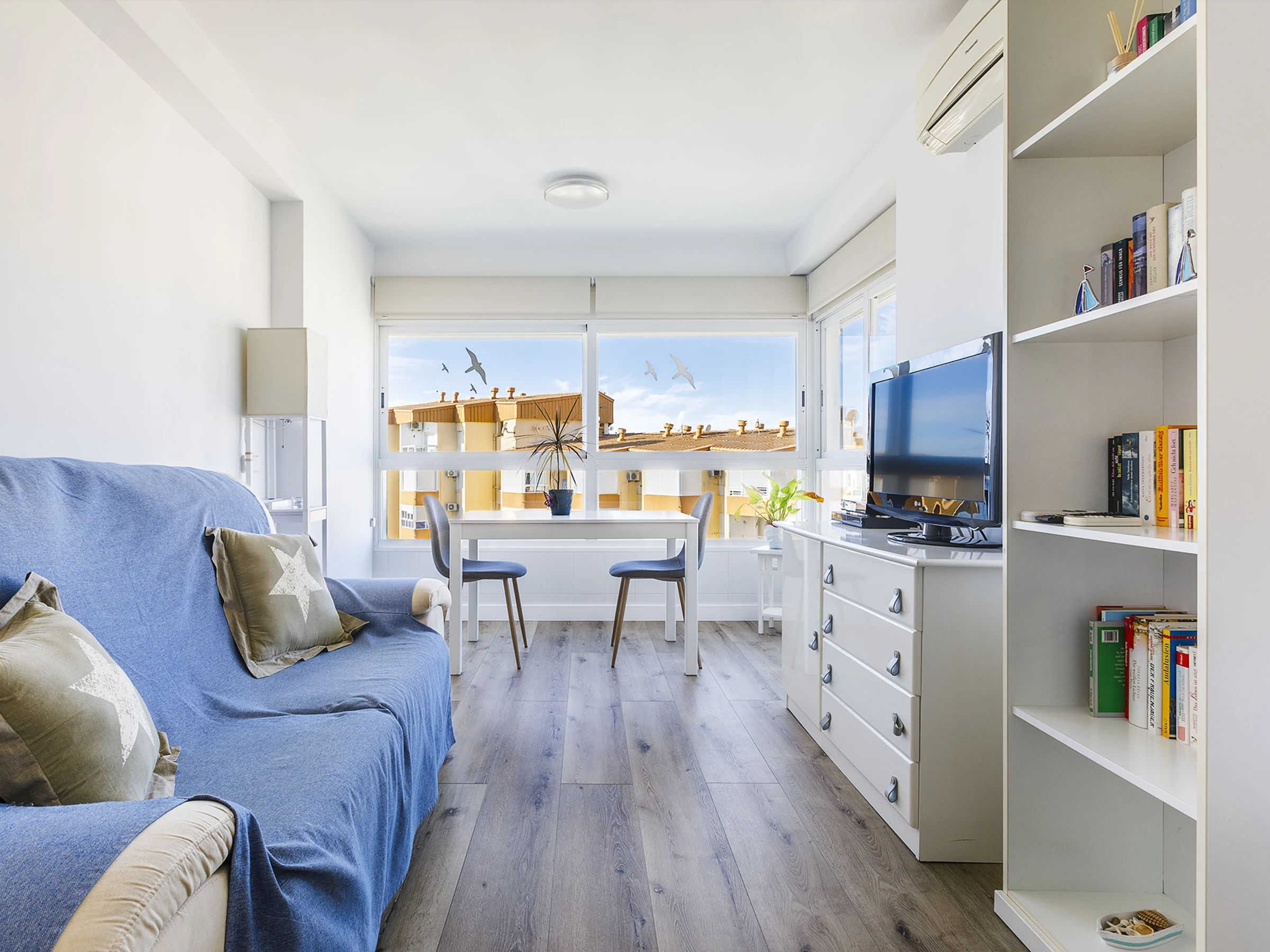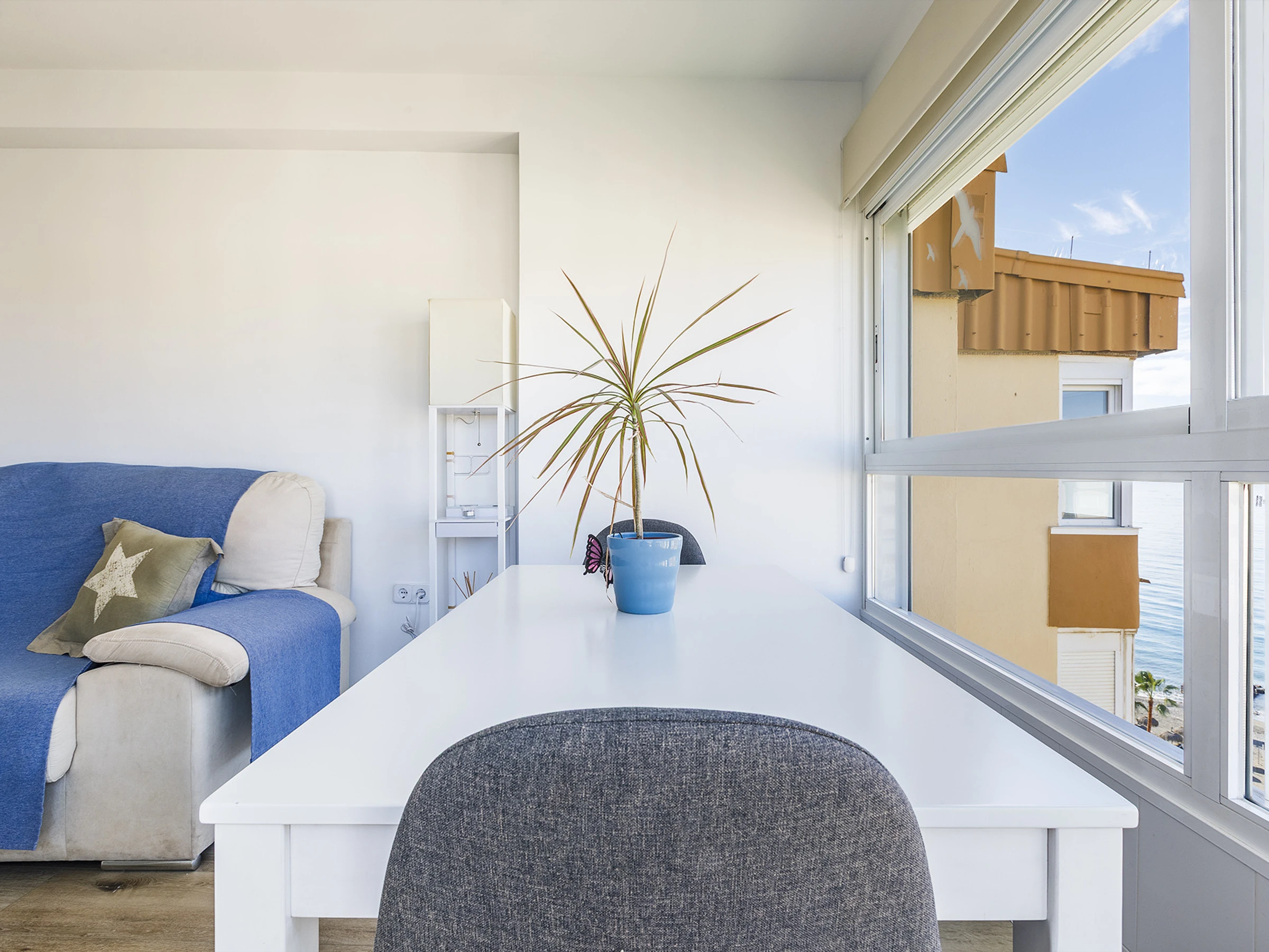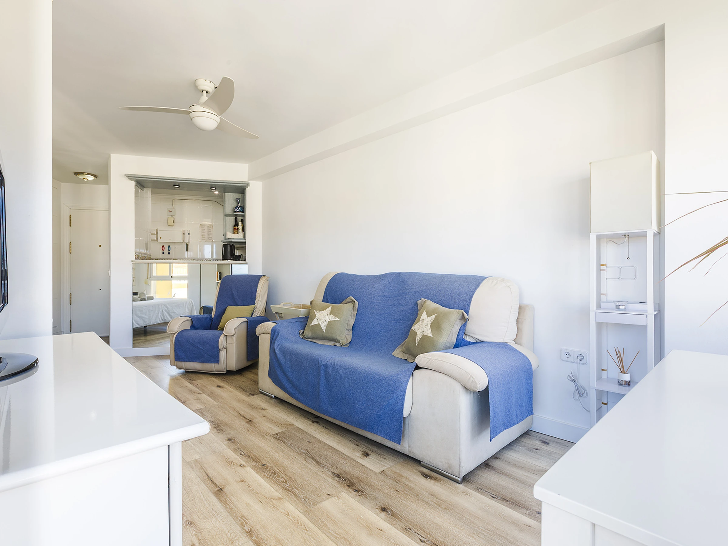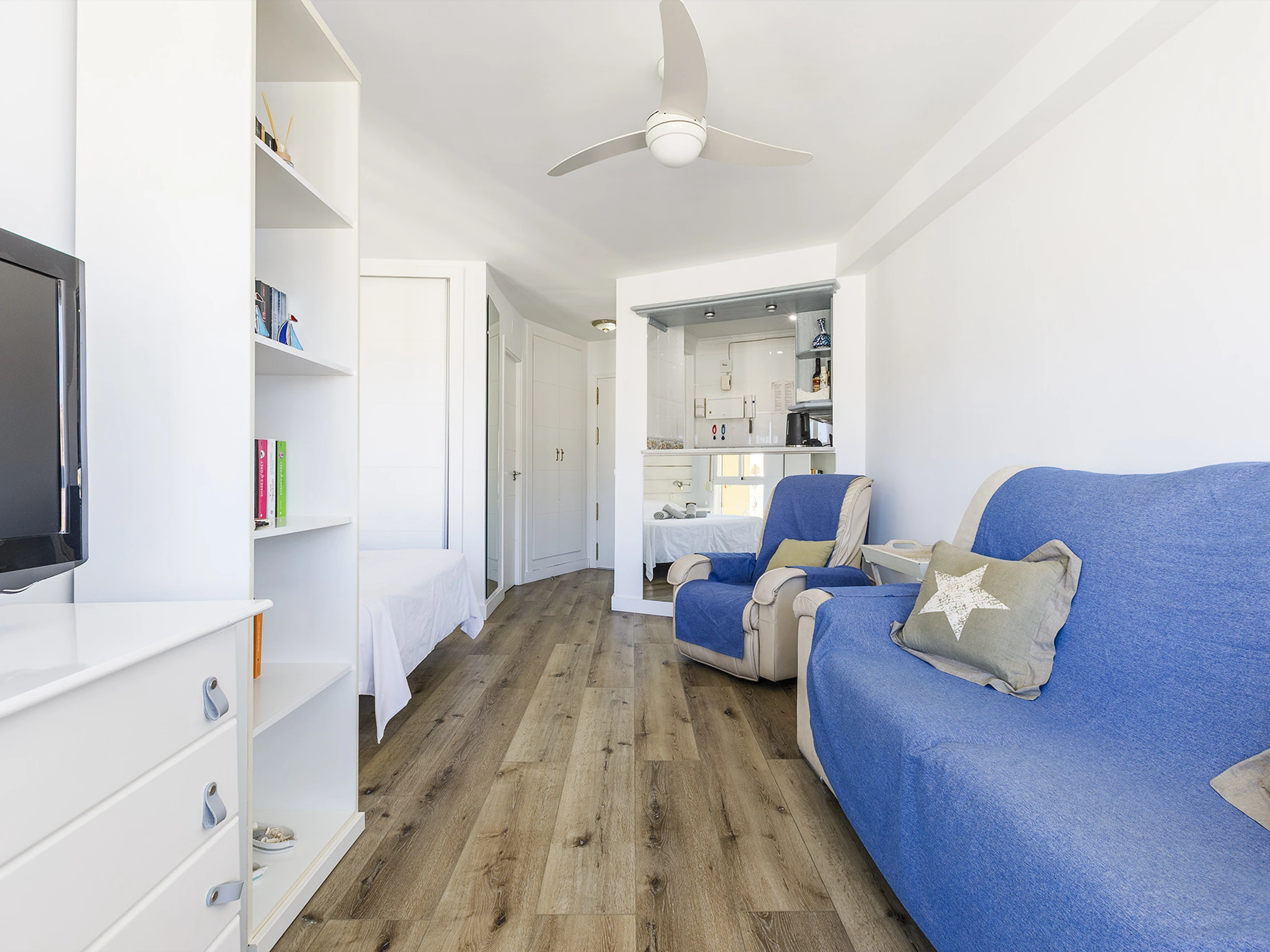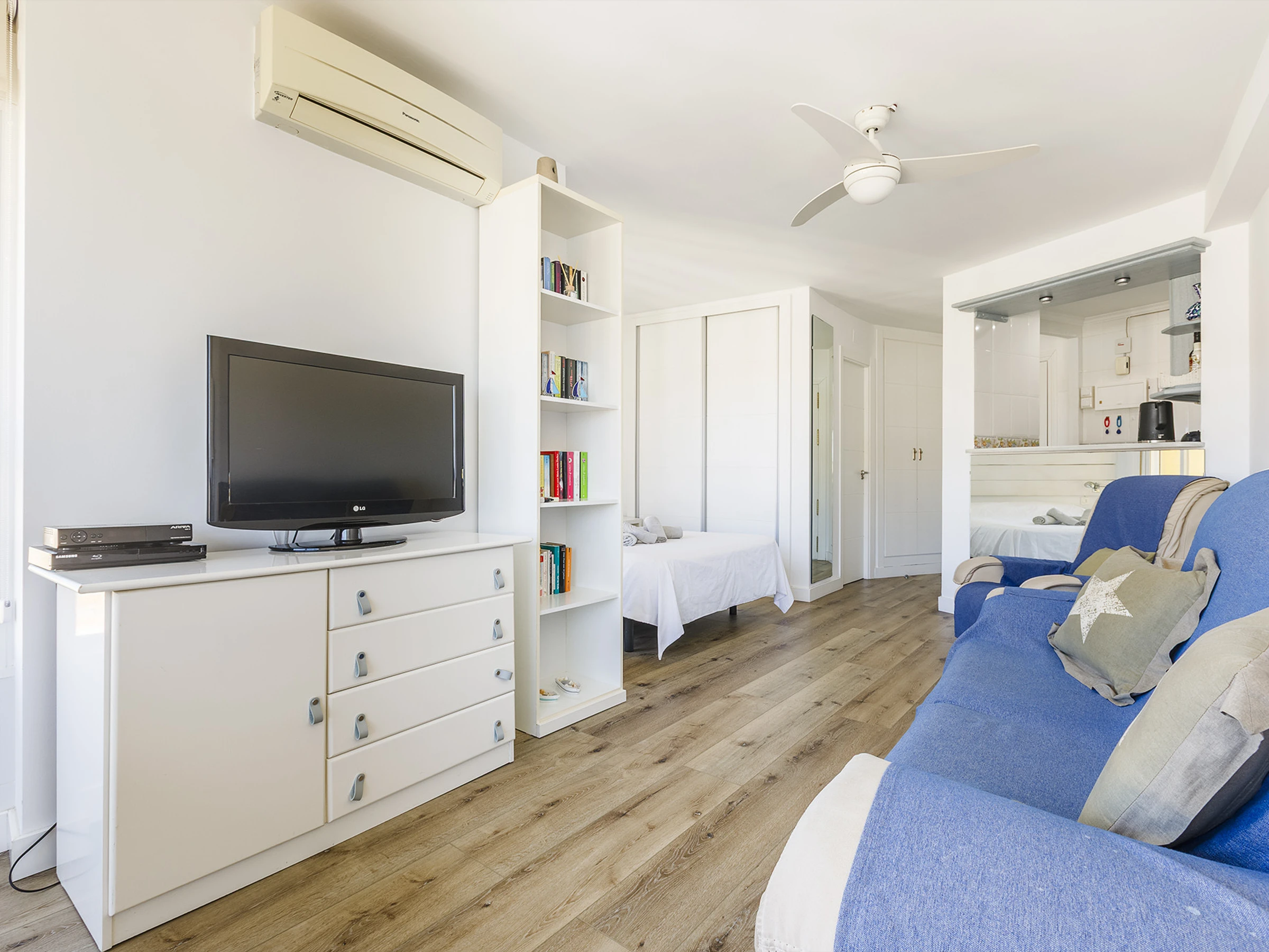 El estudio ofrece un espacio acogedor y cómodo, ideal para relajarte y desconectar. Cuenta con cama doble, aire acondicionado, cocina americana equipada y baño con ducha 🚿, pensado para que te sientas como en casa. La luz natural, sus vistas al mar 🌅 y su orientación oeste hacen que cada atardecer sea un momento único.
