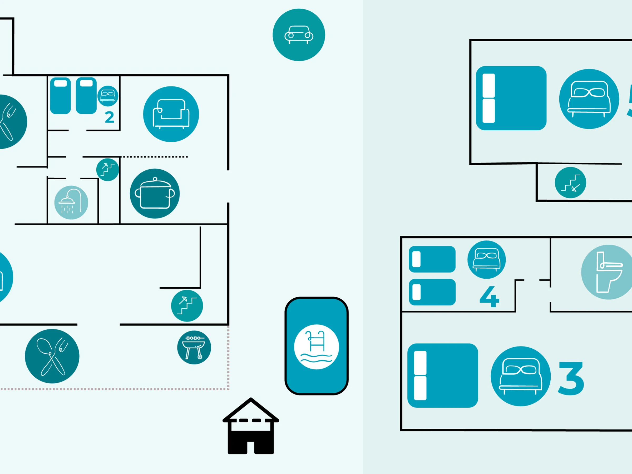 * La vivienda cuenta con cinco dormitorios: tres con cama de matrimonio y dos con dos camas individuales, además de dos baños completos con plato de ducha y un aseo. La propiedad dispone de dos cocinas y varios salones con televisión, distribuidos en la casa principal y la casa anexa.