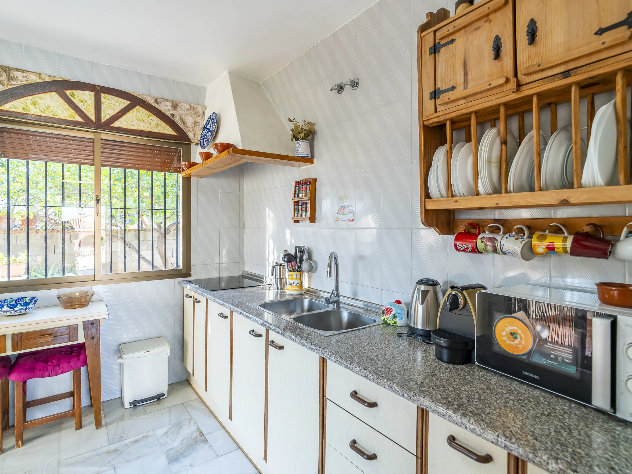 La cocina independiente está totalmente equipada: placa de inducción, horno, microondas, cafetera, tostadora, hervidor y todo lo necesario para cocinar con comodidad durante tus vacaciones.