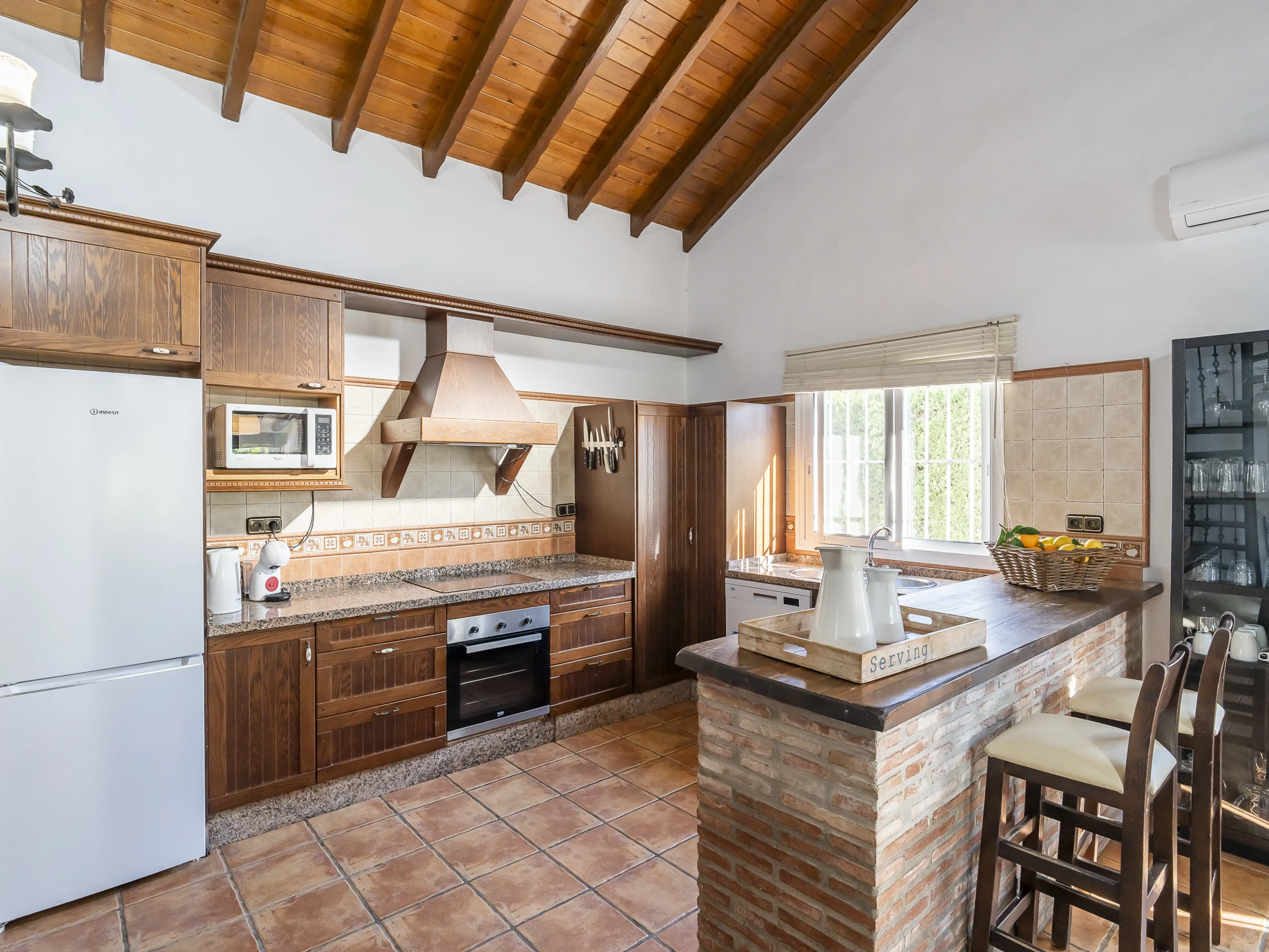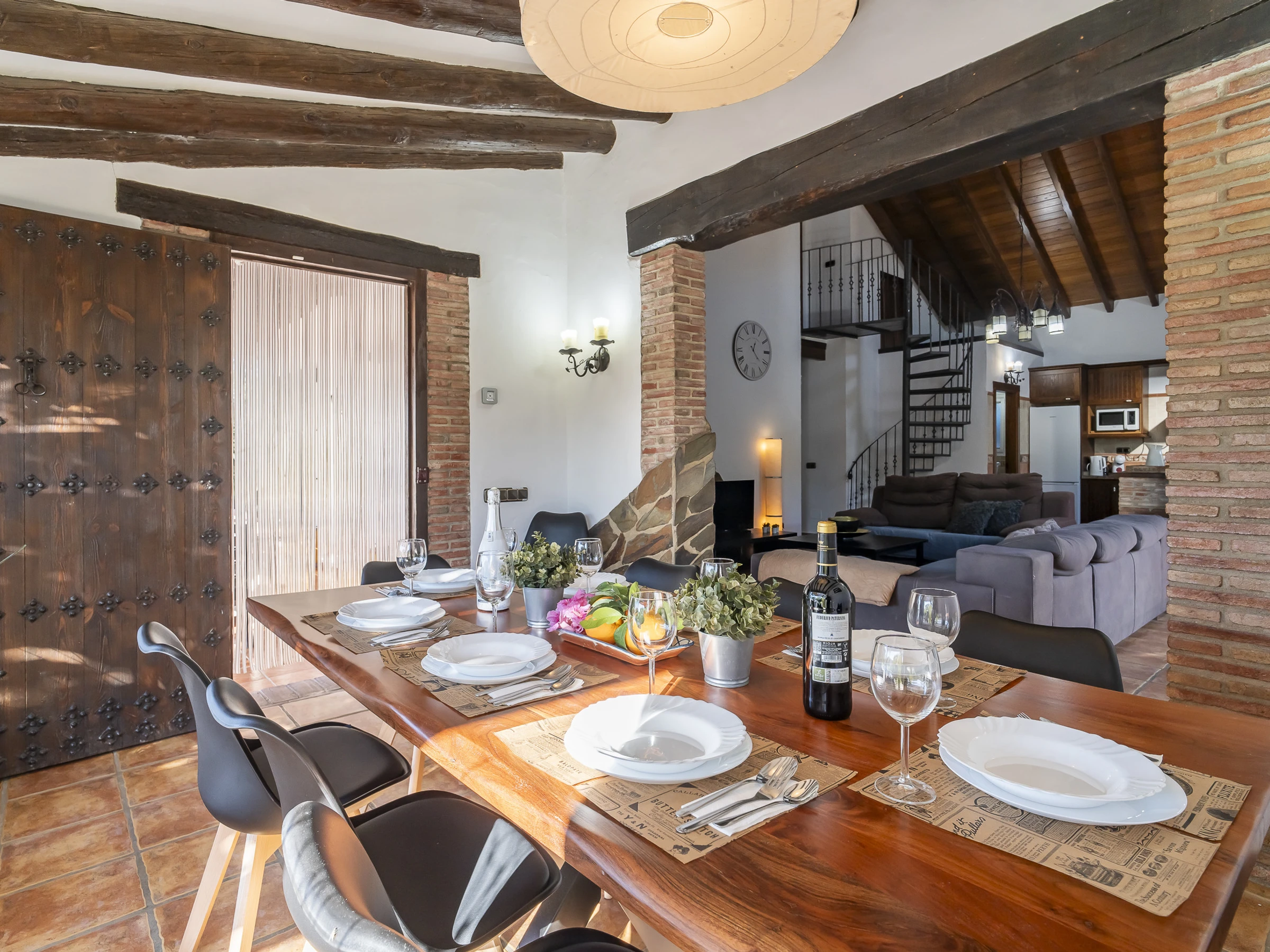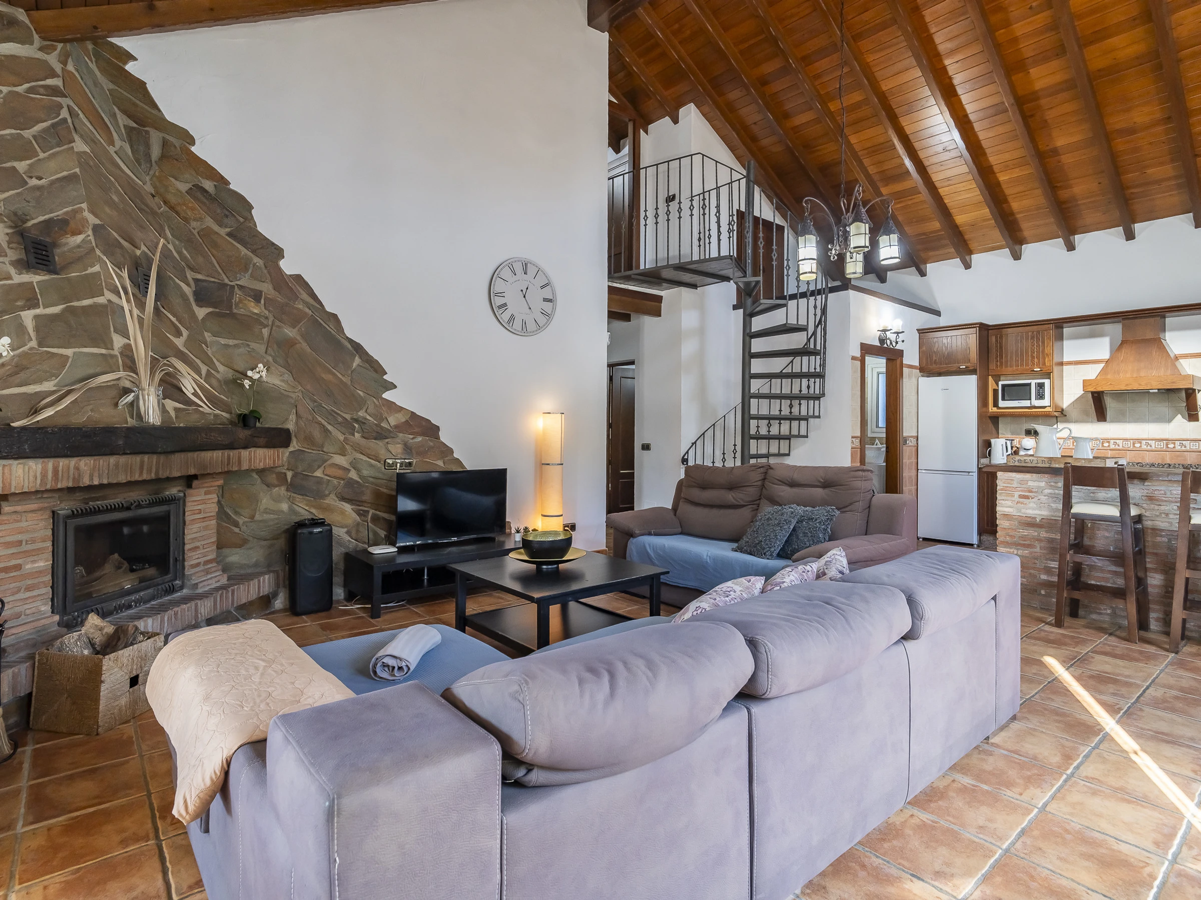 El salón-comedor es un espacio acogedor gracias a sus techos altos y chimenea, perfecto para relajarse tras un día de turismo o playa. La cocina americana está totalmente equipada con electrodomésticos modernos — vitrocerámica, horno, lavavajillas y más — para que prepares tus comidas favoritas con total comodidad. Además, la villa está completamente climatizada y ofrece WiFi gratuito, televisión satélite multilingüe y menaje completo.