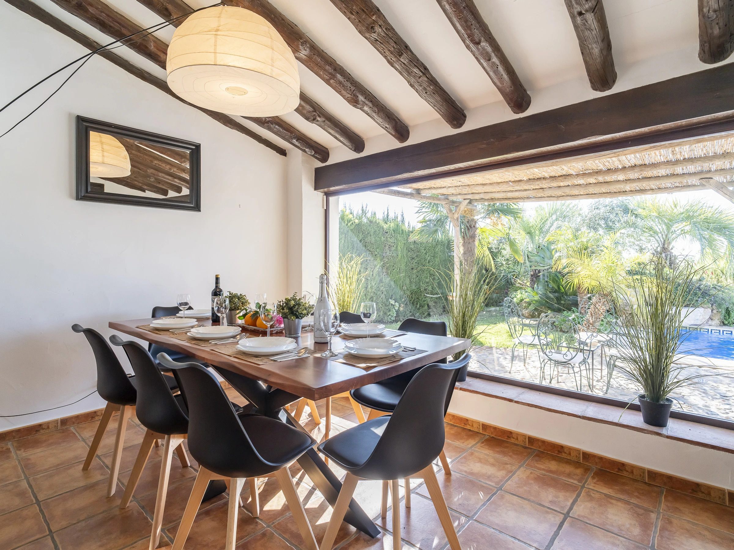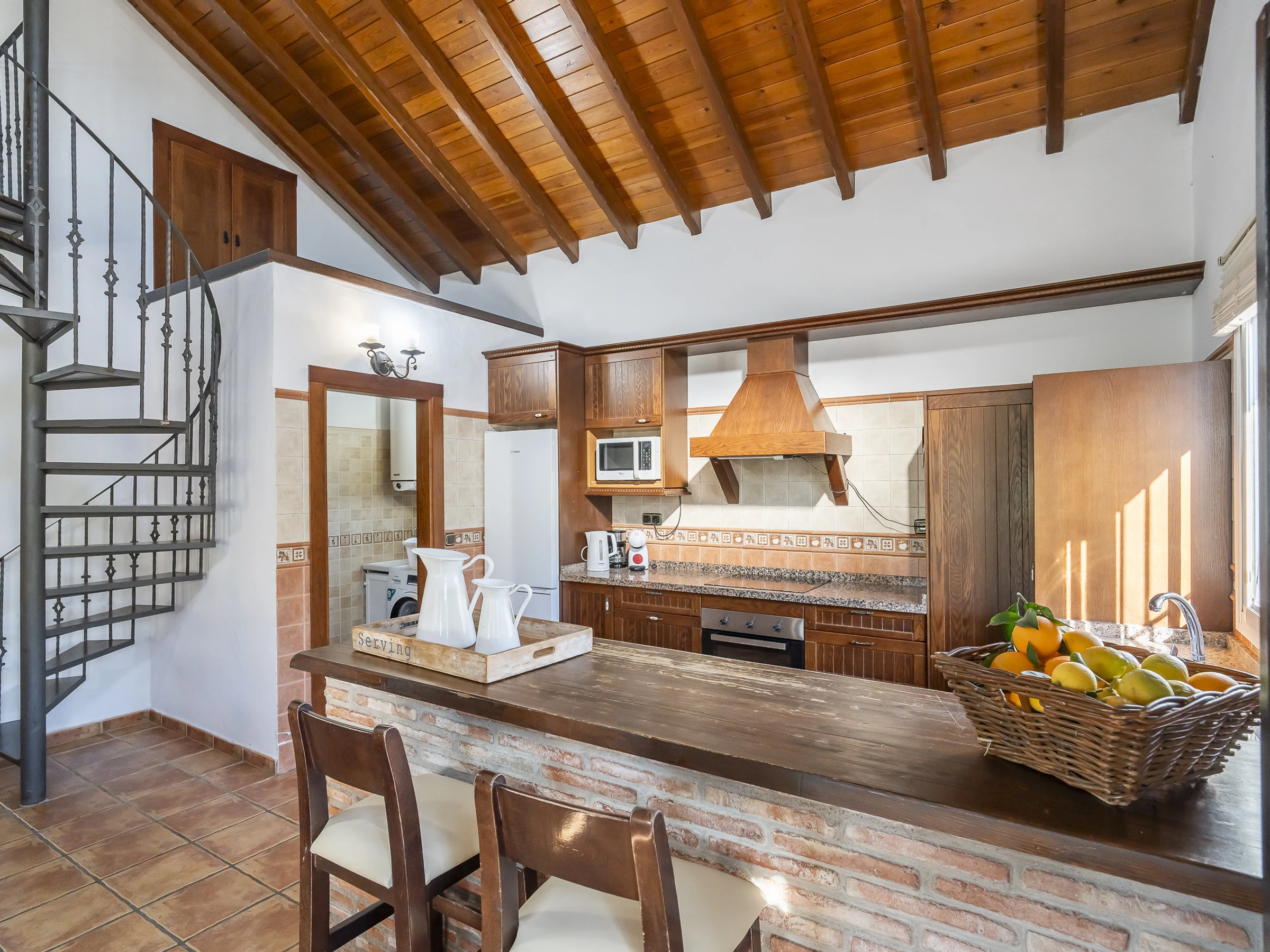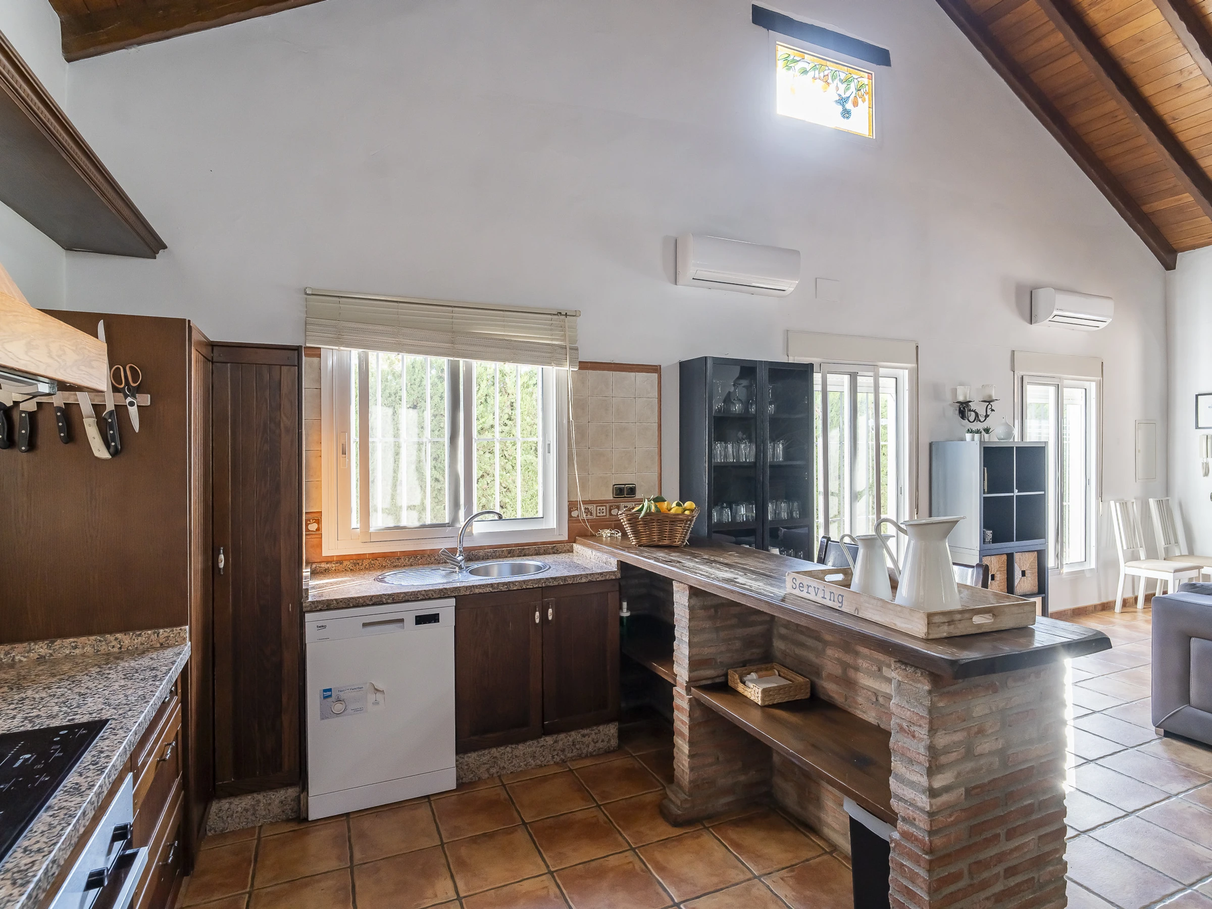 El salón-comedor es un espacio acogedor gracias a sus techos altos y chimenea, perfecto para relajarse tras un día de turismo o playa. La cocina americana está totalmente equipada con electrodomésticos modernos — vitrocerámica, horno, lavavajillas y más — para que prepares tus comidas favoritas con total comodidad. Además, la villa está completamente climatizada y ofrece WiFi gratuito, televisión satélite multilingüe y menaje completo.